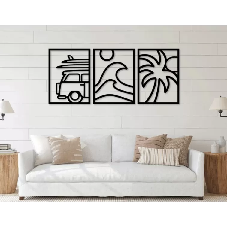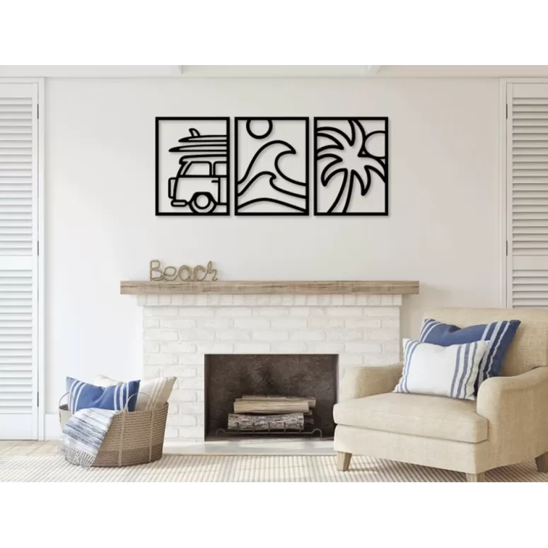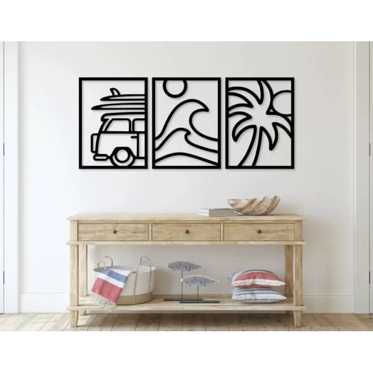 Adaugă un aer de relaxare și aventură spațiului tău cu acest triptic minimalist, realizat prin decupaj laser din placaj de HDF de înaltă calitate. Setul include trei panouri cu ilustrații elegante și simple: un van cu o placă de surf pe acoperiș, un val cu soarele deasupra și un palmier cu soarele parțial vizibil în fundal. Aceste imagini evocă atmosfera unei vacanțe pe plajă, perfecte pentru cei care iubesc marea, surf-ul și peisajele tropicale. Ideal pentru decorarea livingului, dormitorului sau biroului, acest triptic aduce o notă de eleganță și serenitate în orice încăpere.