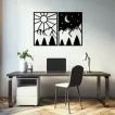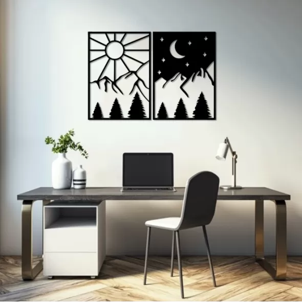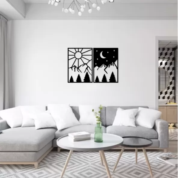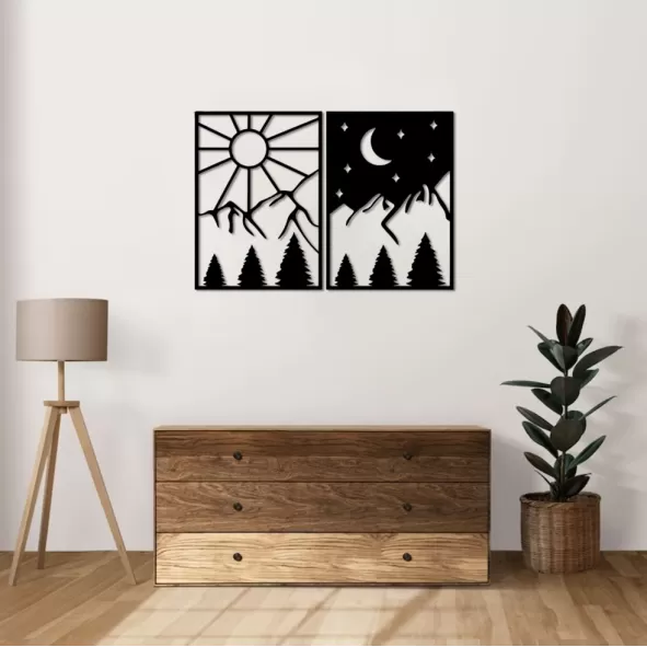 Aceste două panouri artistice captivante prezintă același peisaj montan în momente diferite ale zilei - unul în timpul zilei, cu un soare strălucitor, iar celălalt noaptea, sub o lună în formă de semilună și stele. Constrastul dintre cele două tablouri aduce un farmec unic și transformă orice spațiu într-o poveste vizuală plină de mister și frumusețe. Comandă aceste decorațiuni pentru a adăuga o notă de magie și echilibru între zi și noapte în casa ta!