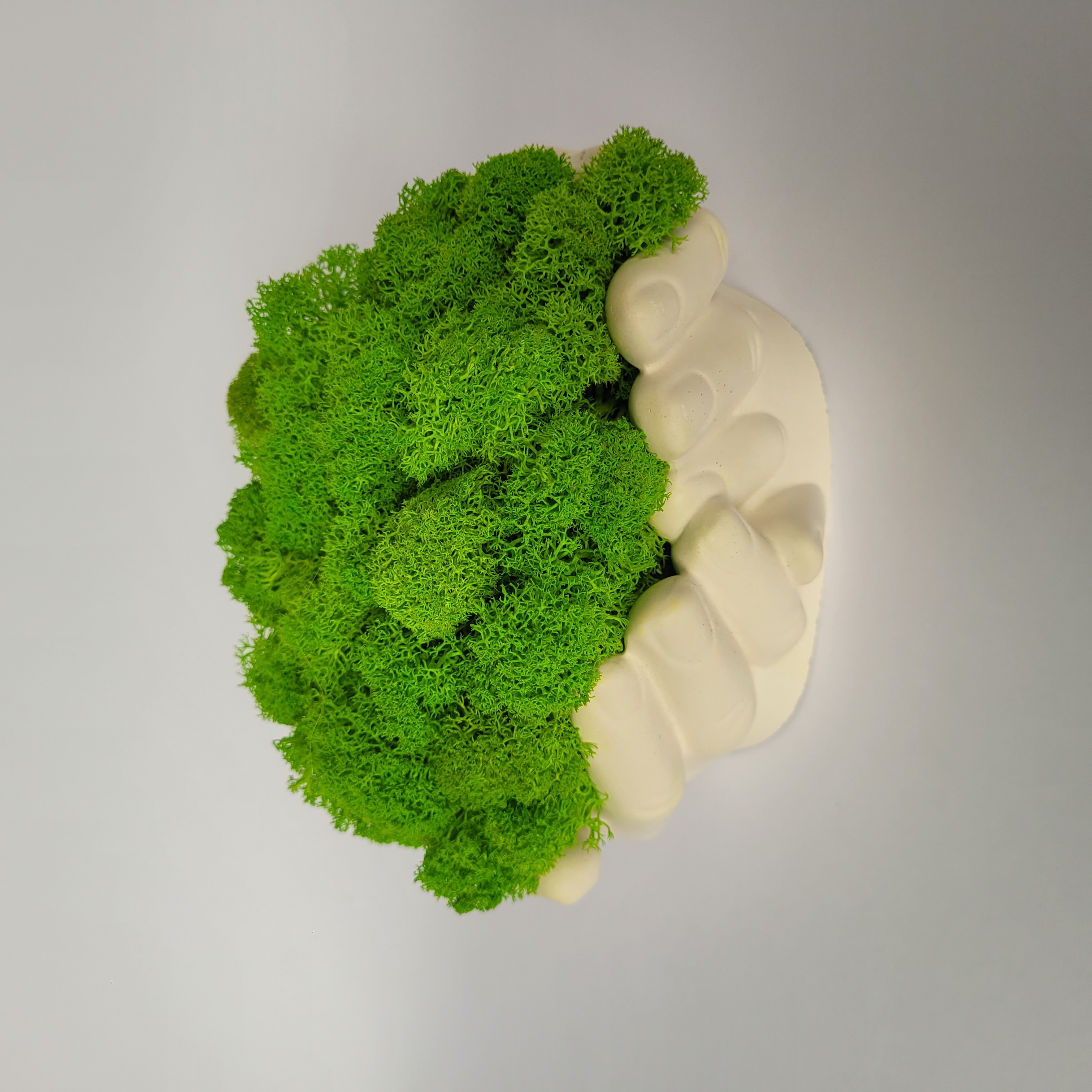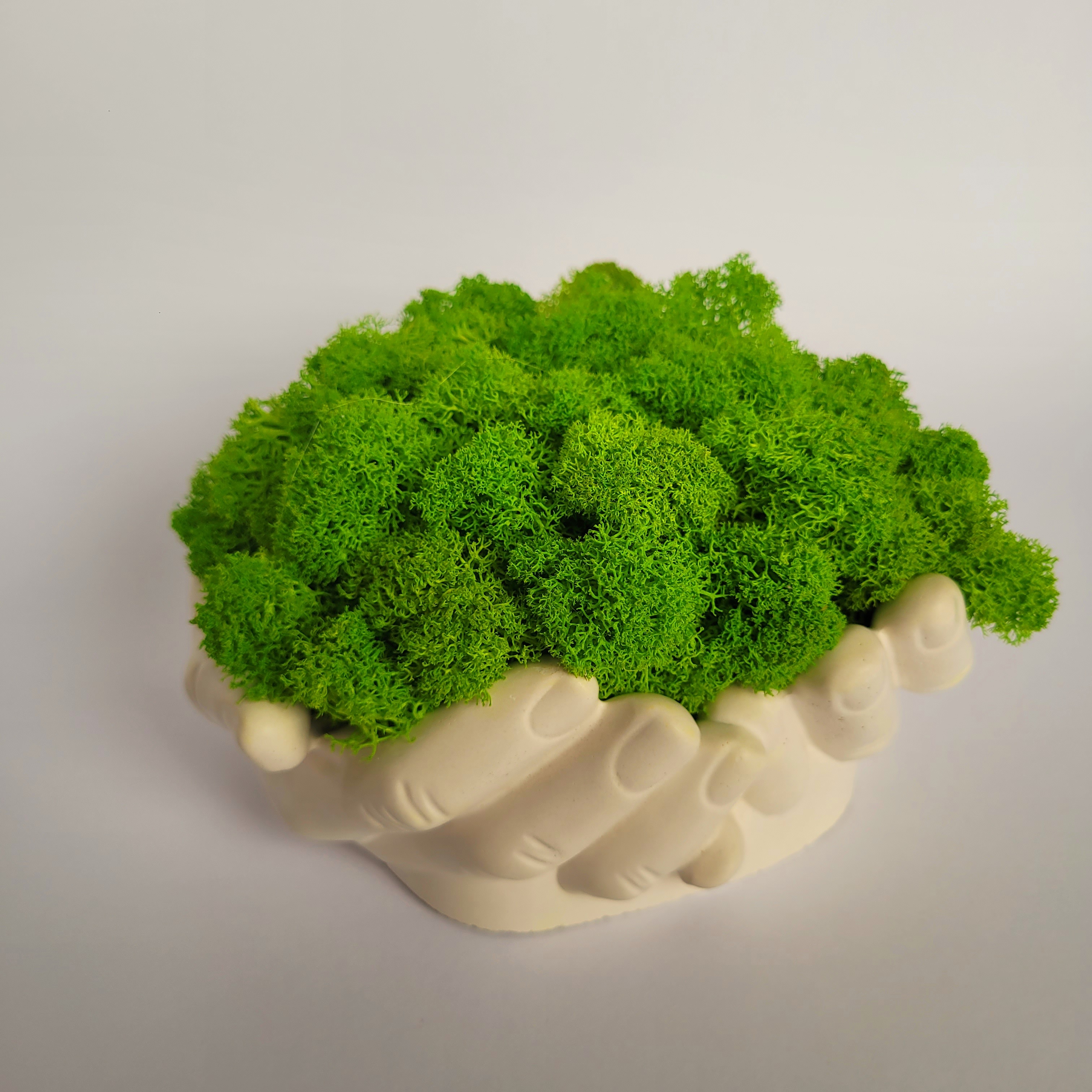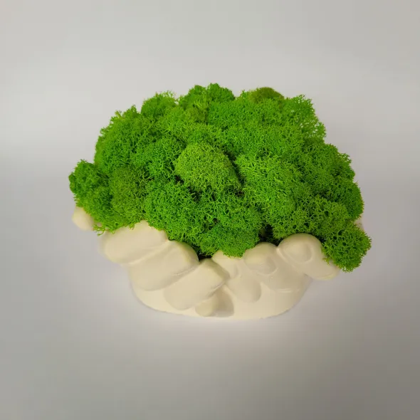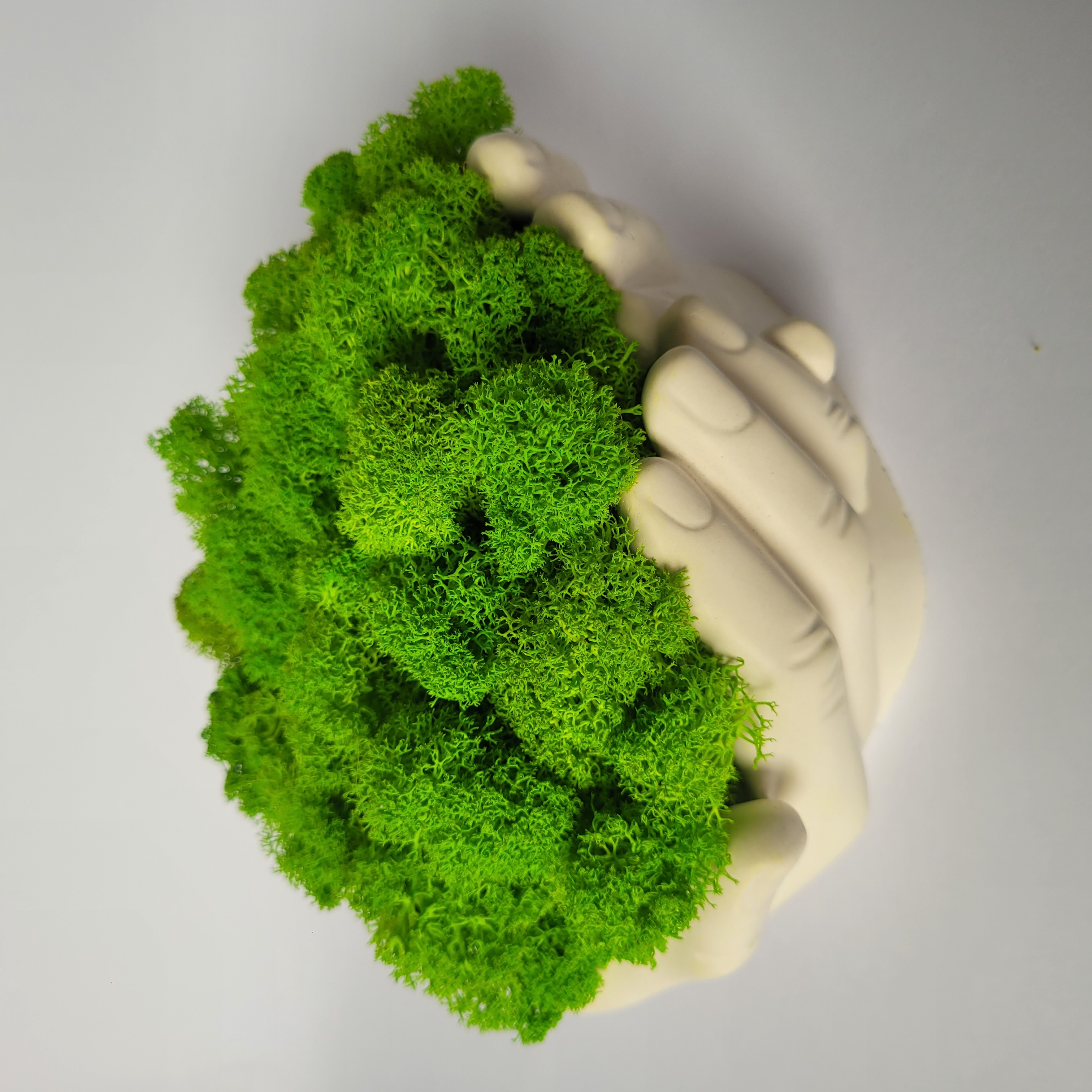 Ornament decorativ realizat handmade, cu lichenii așezați într-o formă de mâini care parcă țin natura în palma lor. Culoarea lichenilor poate fi personalizată după preferințele tale, pentru un look unic sau pentru a se potrivi cu decorul.