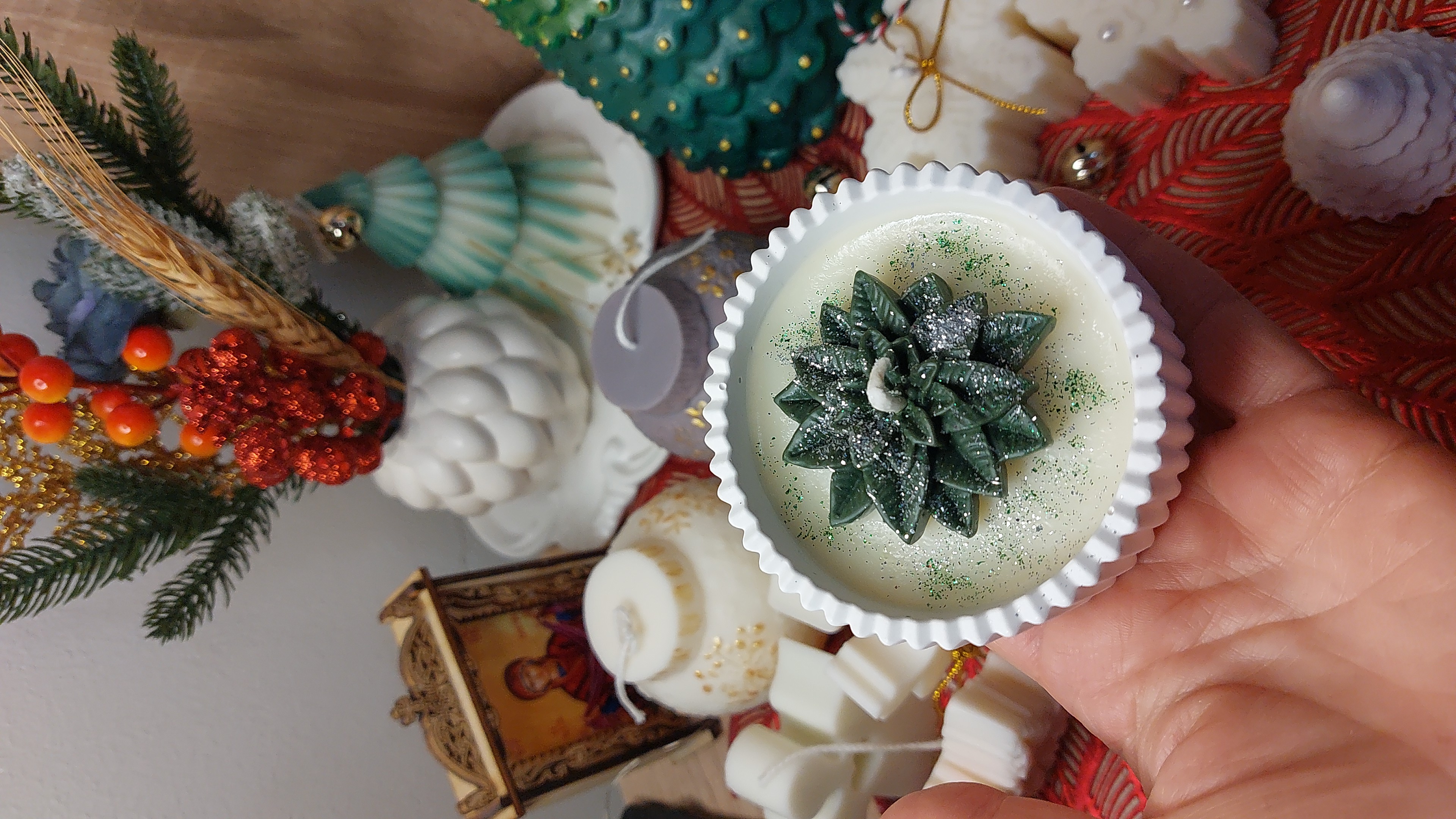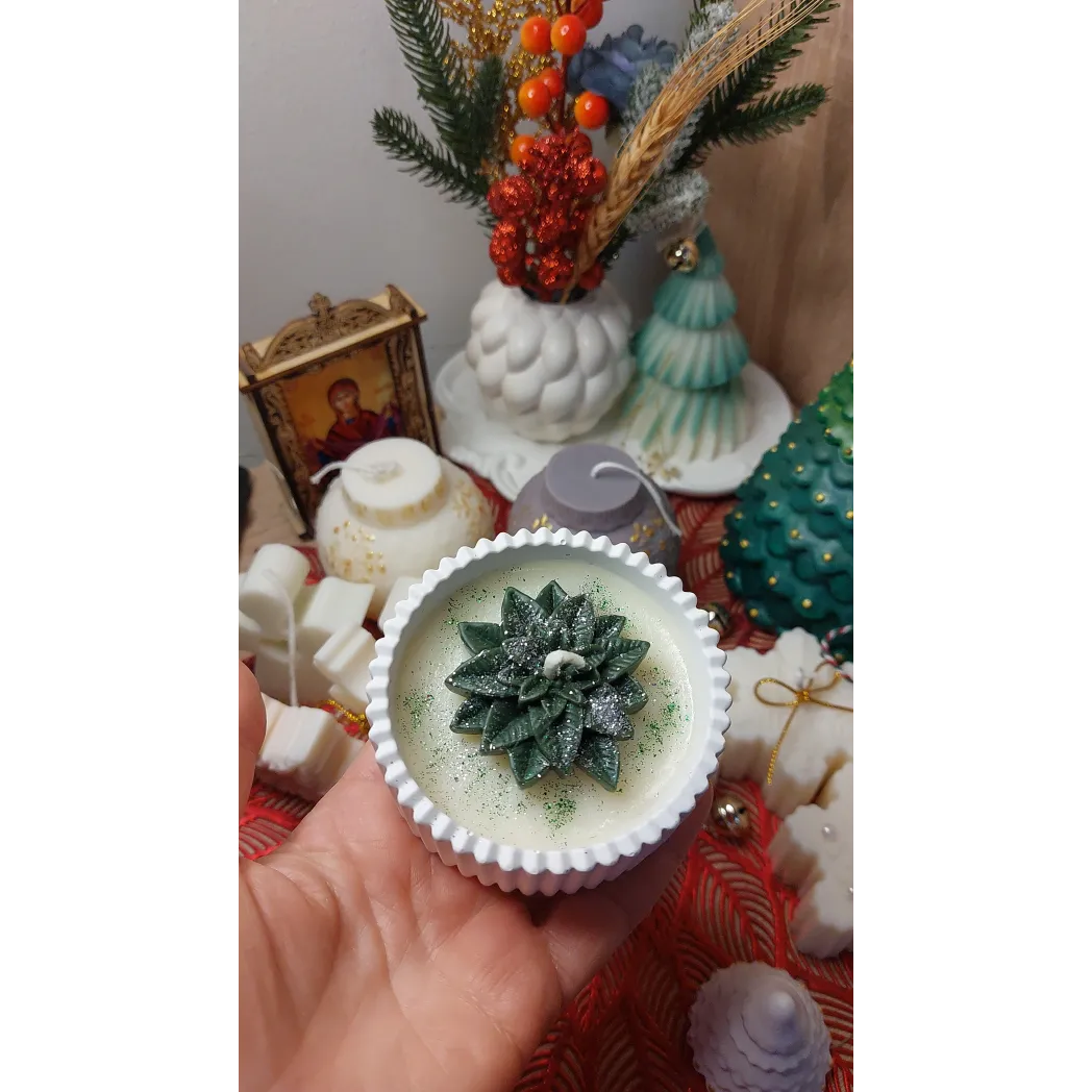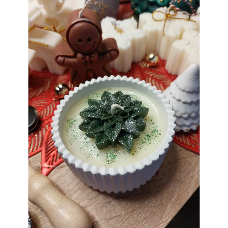 Lumânare din ceara de soia parfumata, decorată. Turnata în recipient din praf ceramic. Produs lucrat 100% manual. Personalizabil. Floarea(crăciunița) poate fi roșie de exemplu!