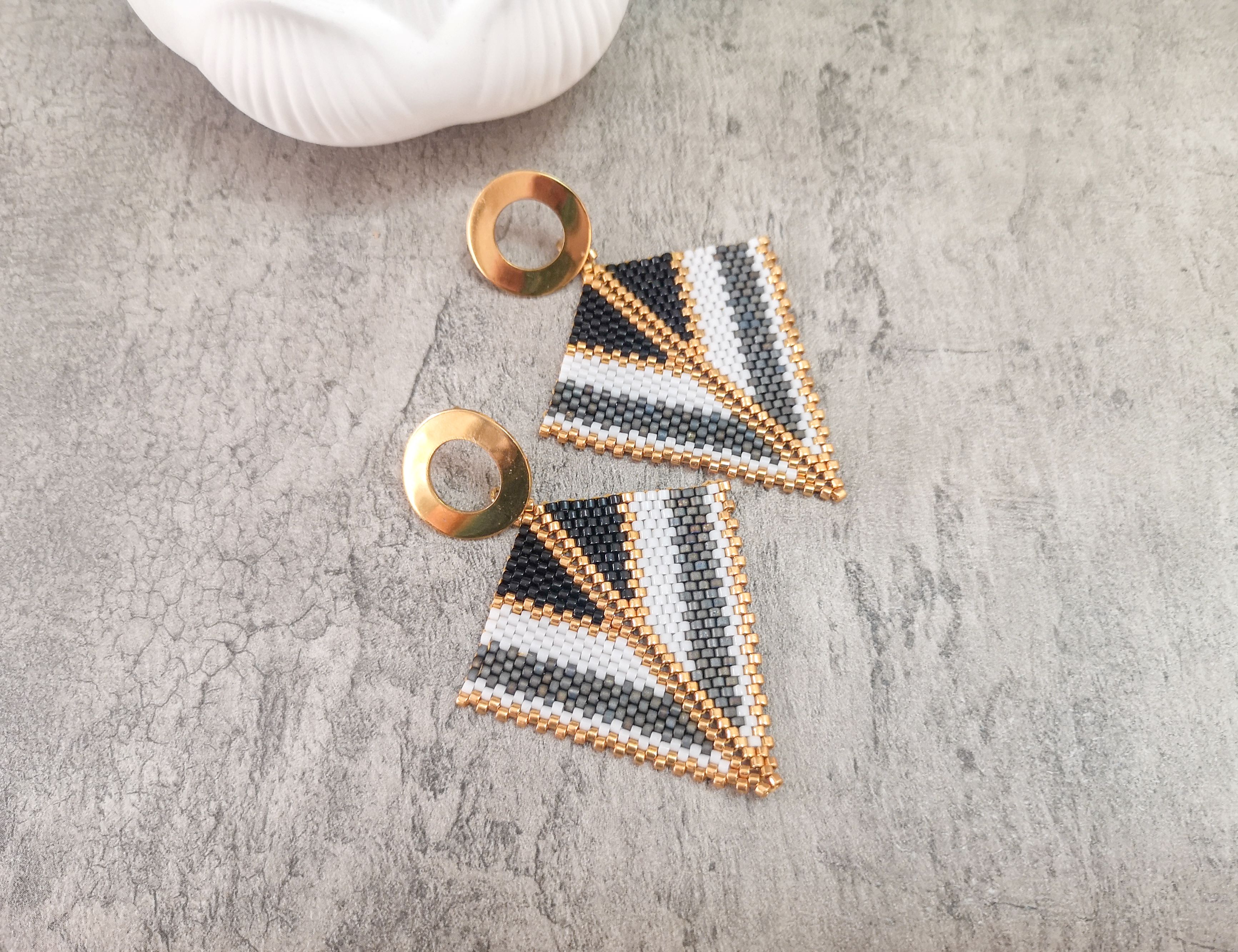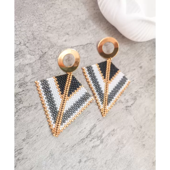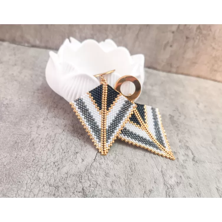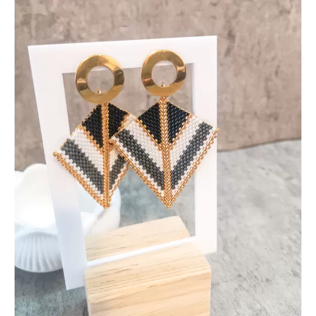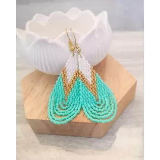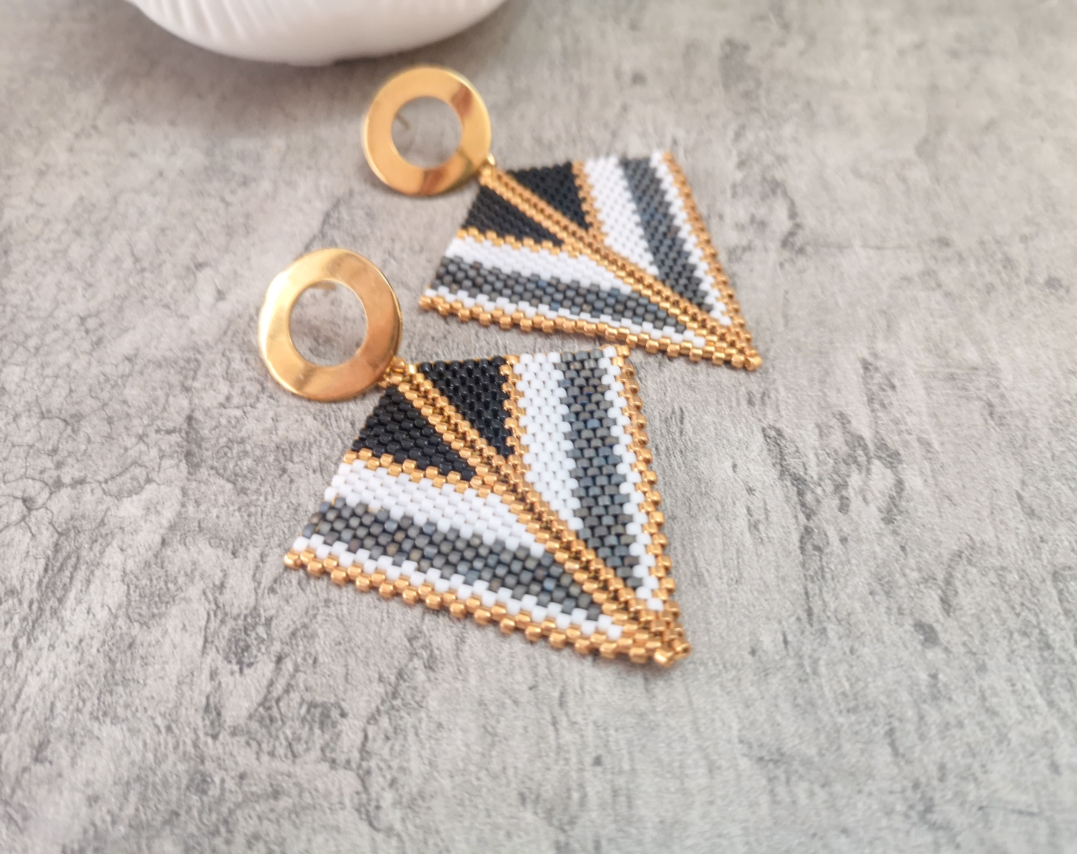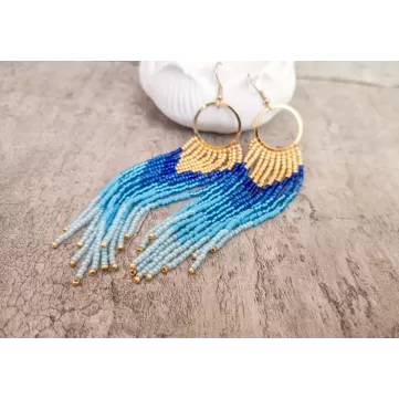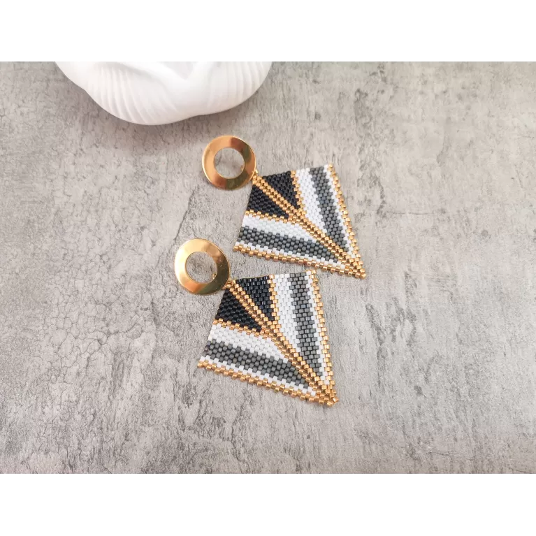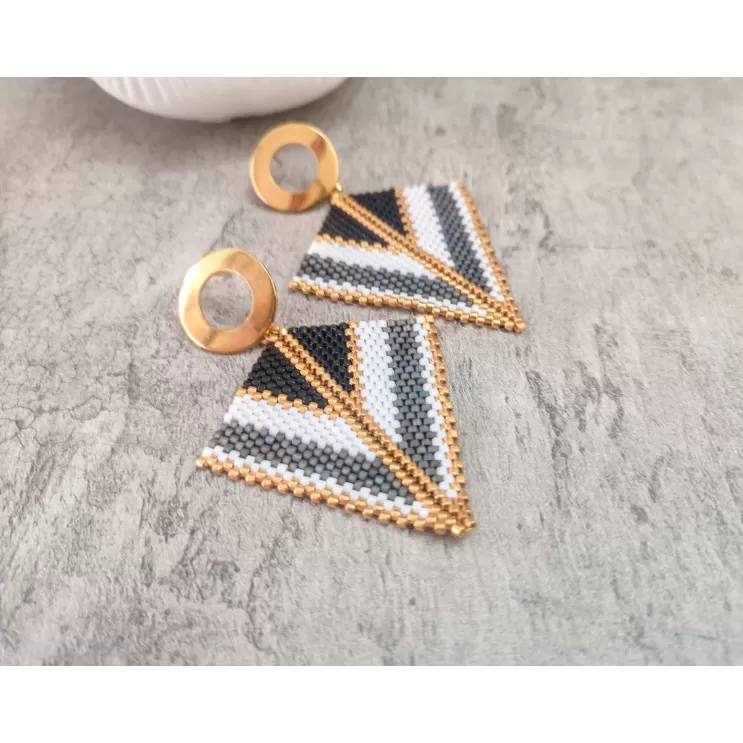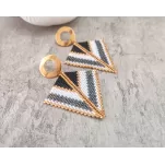 Cercei realizati manual din margele japoneze Delica si elemente din otel inoxidabil aurite.Latime 5 cm, lungime totala 6 cm.Pentru alte combinatii de culori va rog sa ma contactati