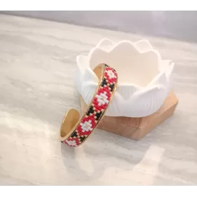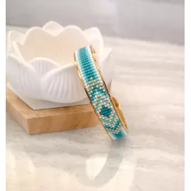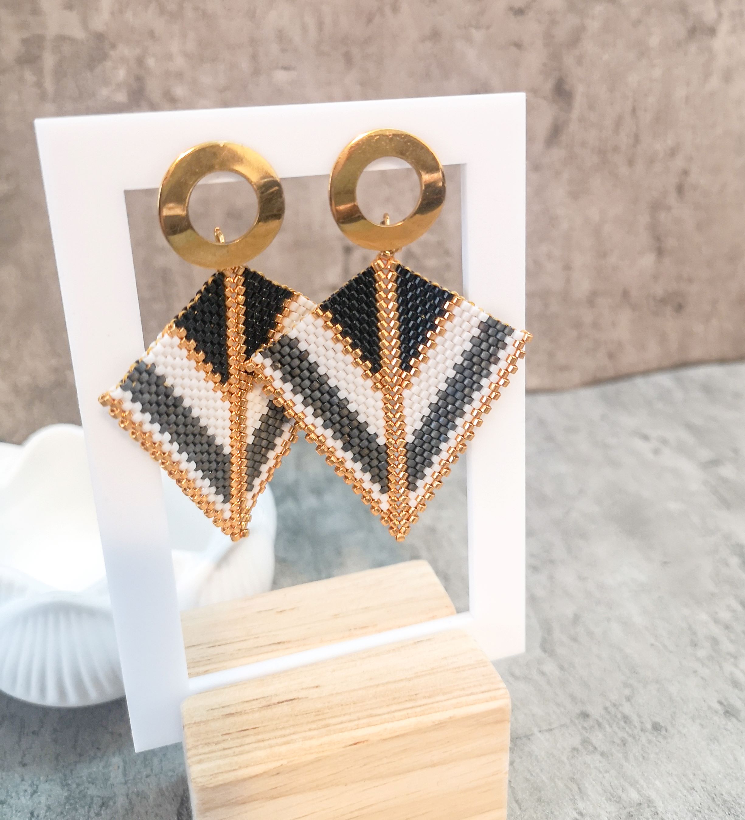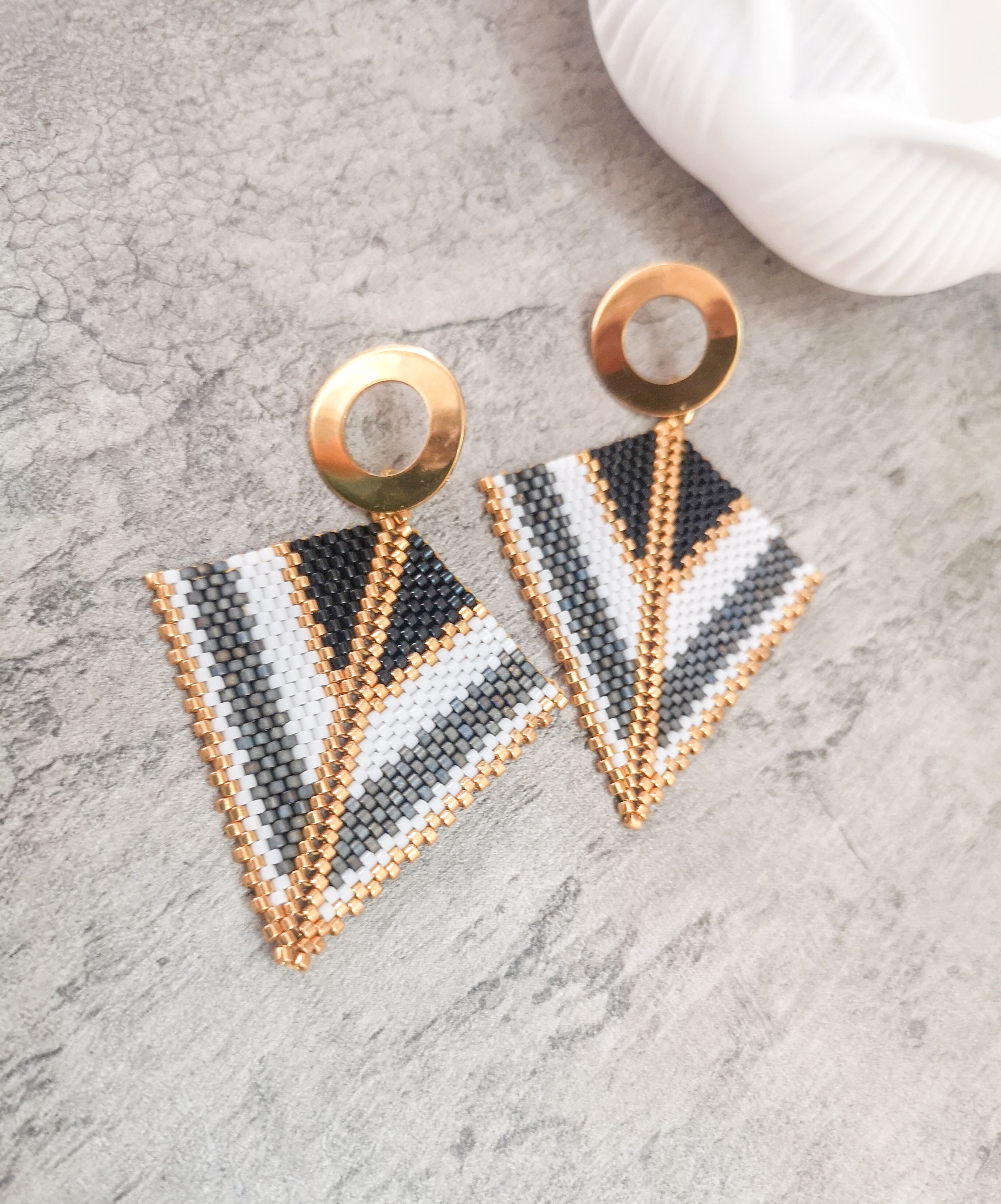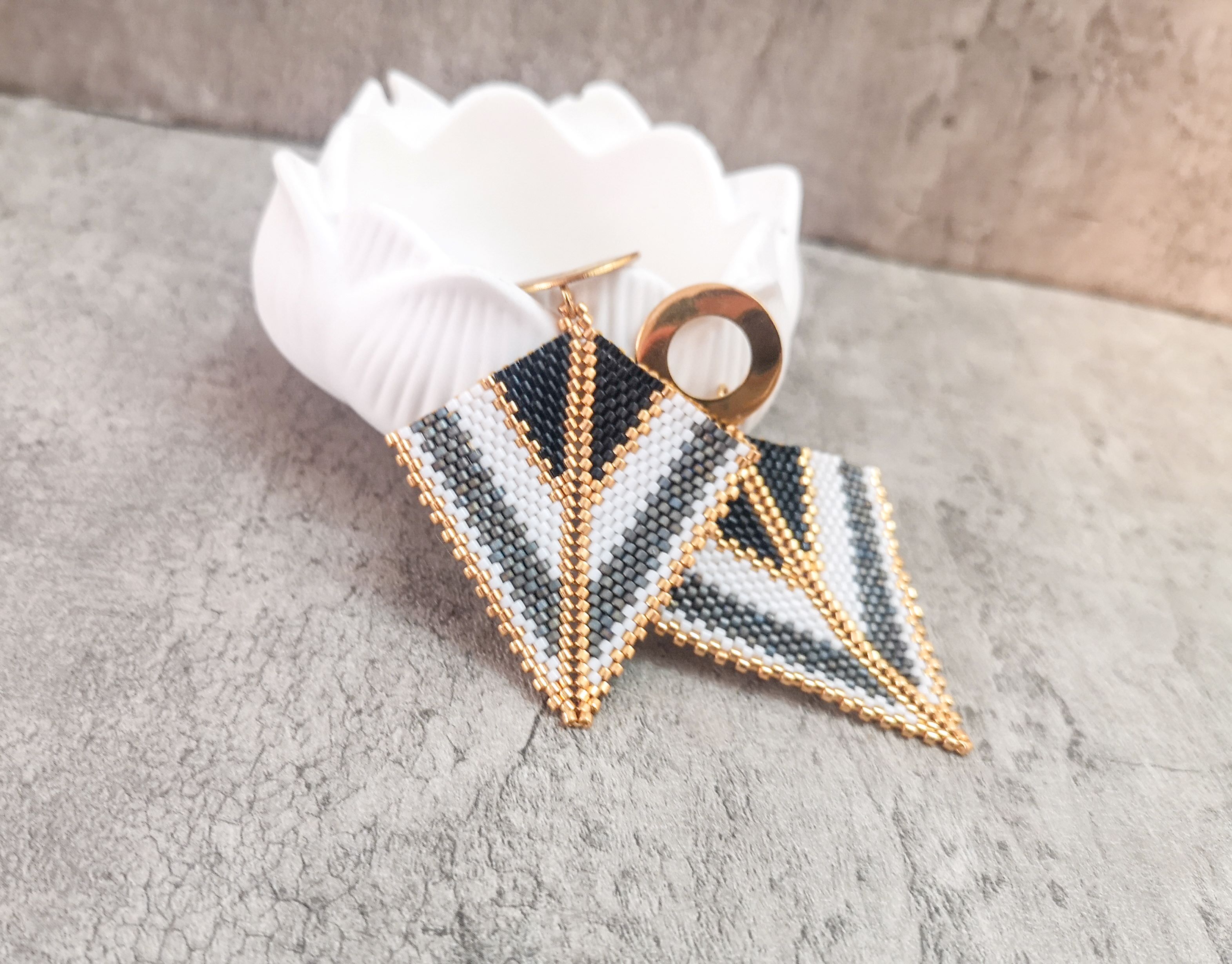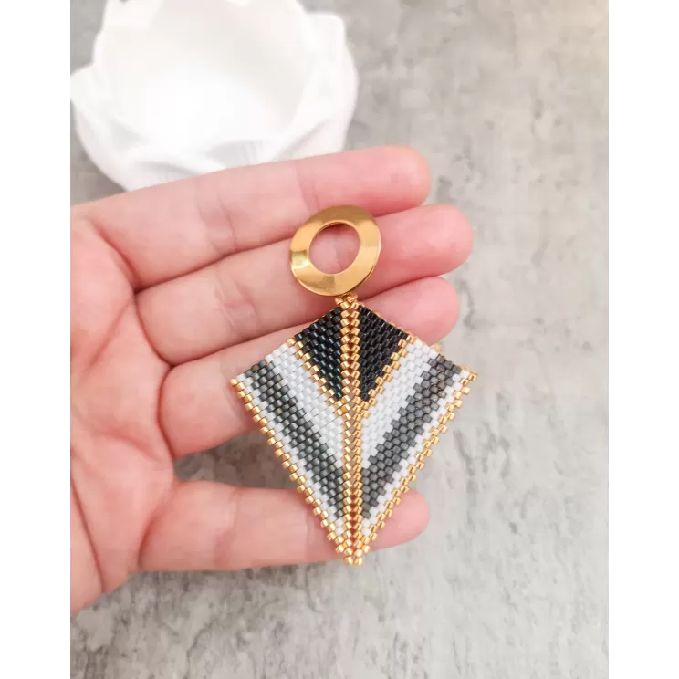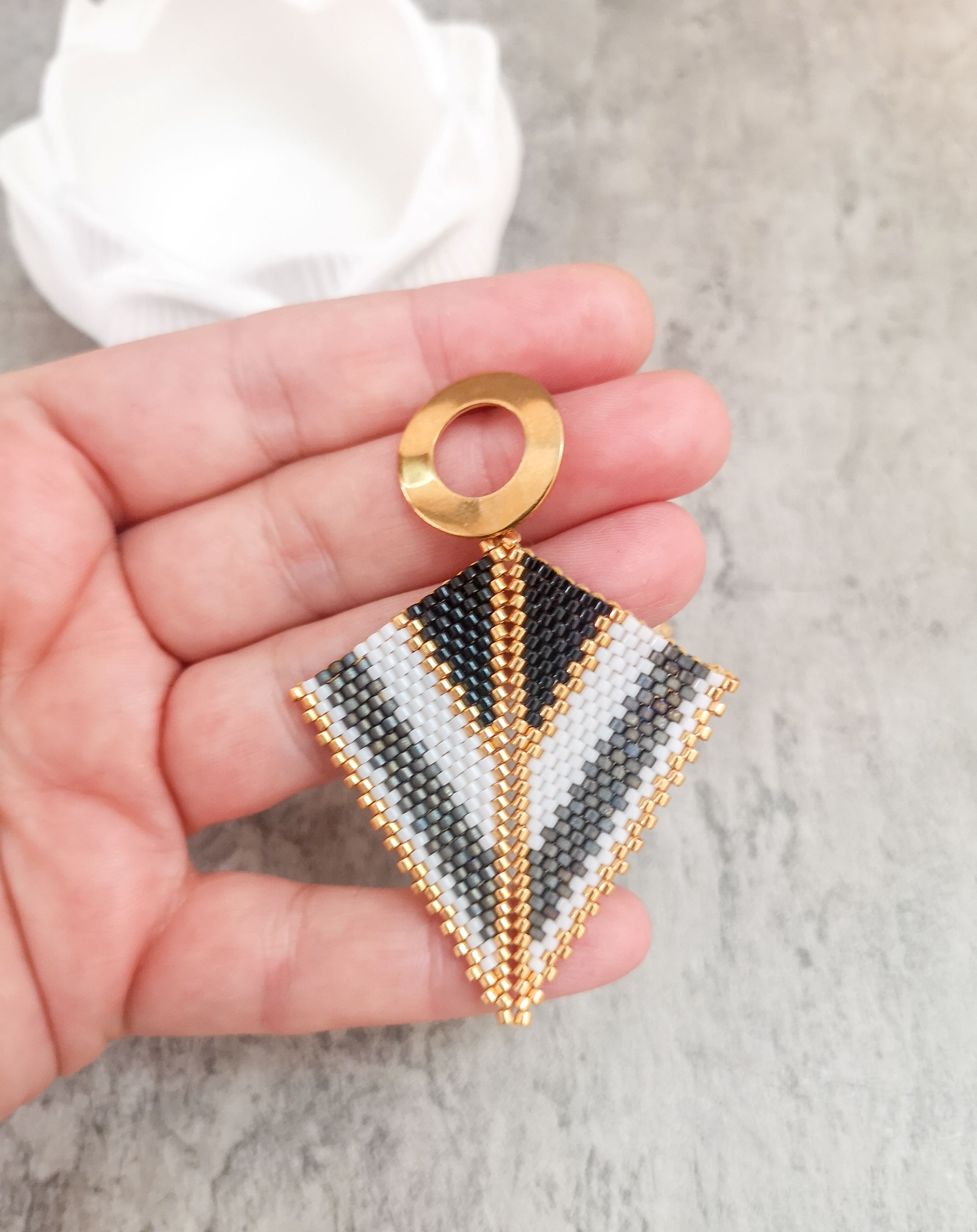 Cercei realizati manual din margele japoneze Delica si elemente din otel inoxidabil aurite.Latime 5 cm, lungime totala 6 cm.Pentru alte combinatii de culori va rog sa ma contactati