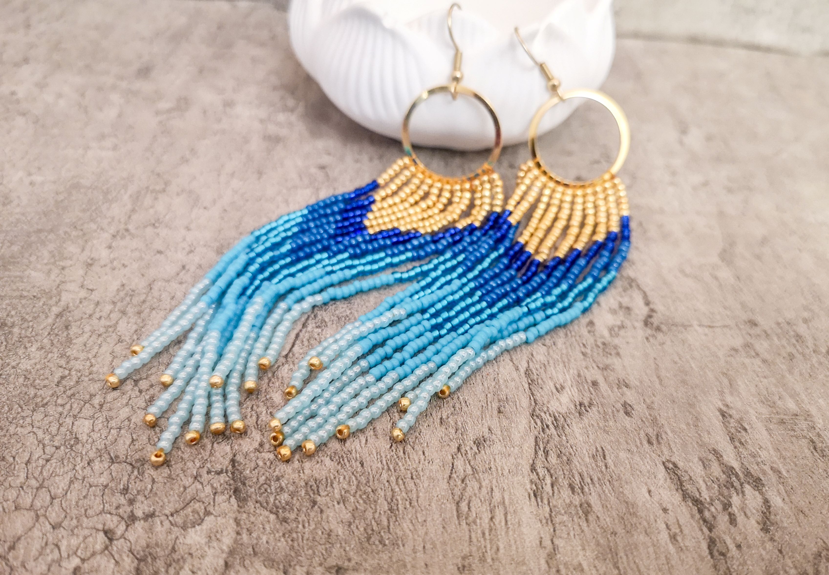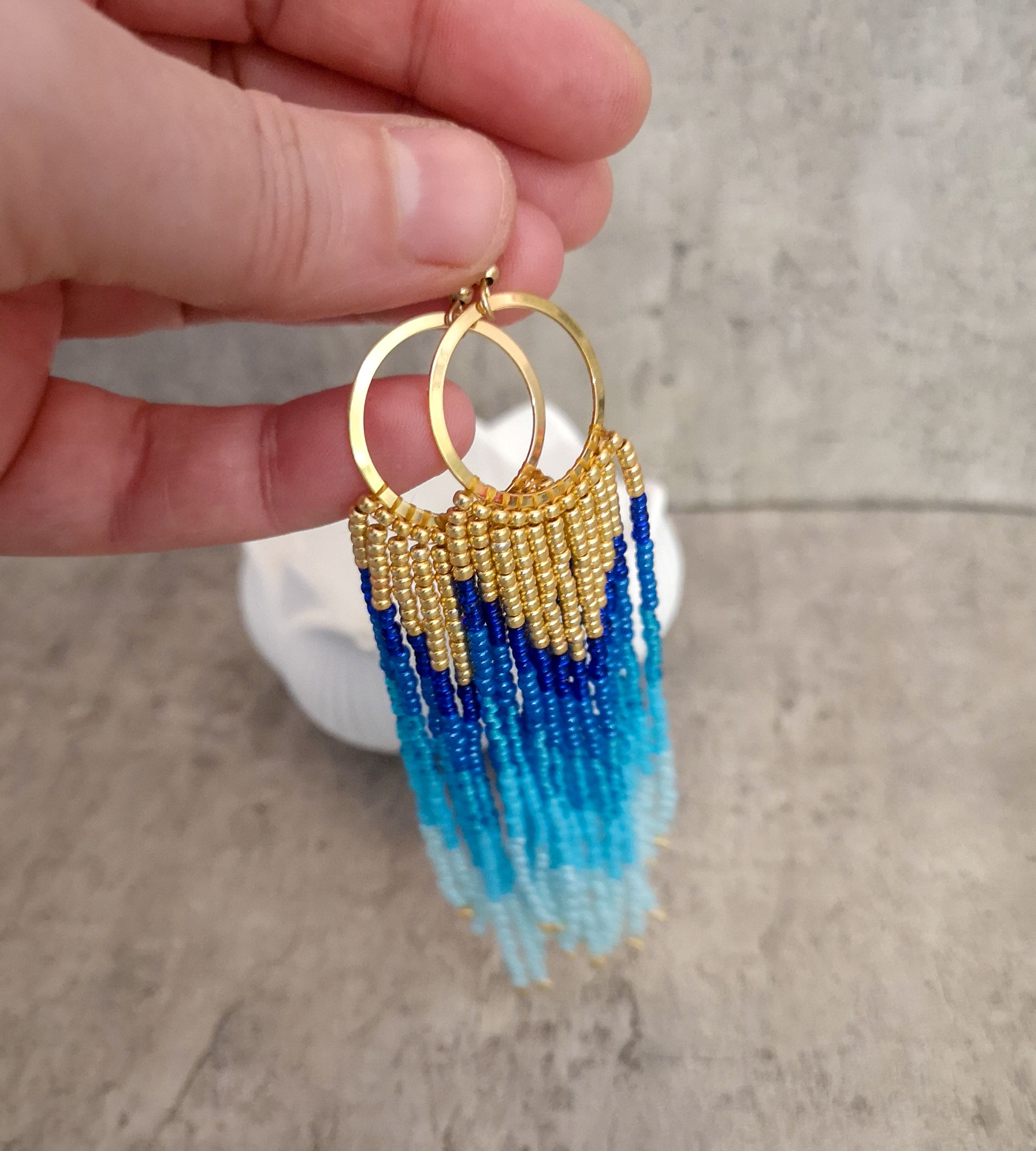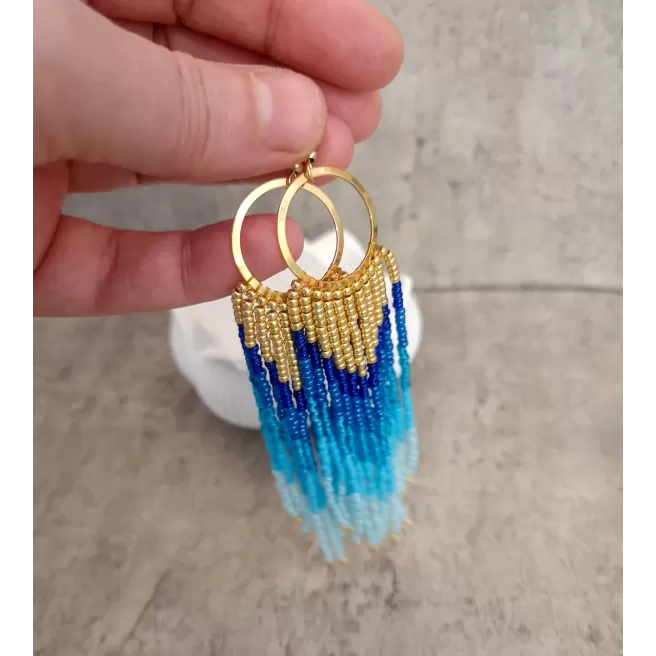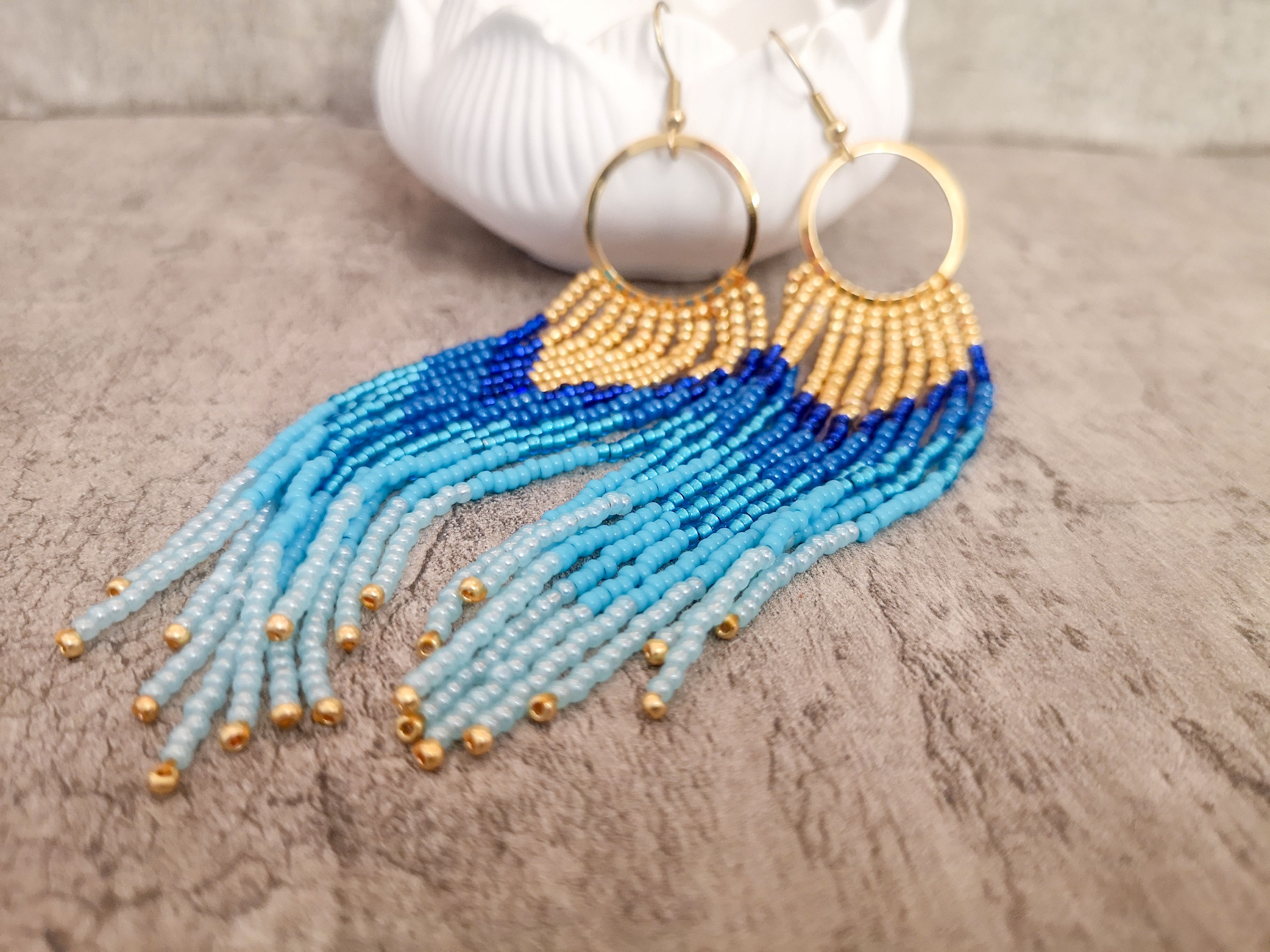 Cercei lungi din margele Toho japoneze, accesorii metalice din otel inoxidabil aurite.Latime 3 cm, lungime 13 cm. Pentru alte combinatii de culori va rog sa ma contactati