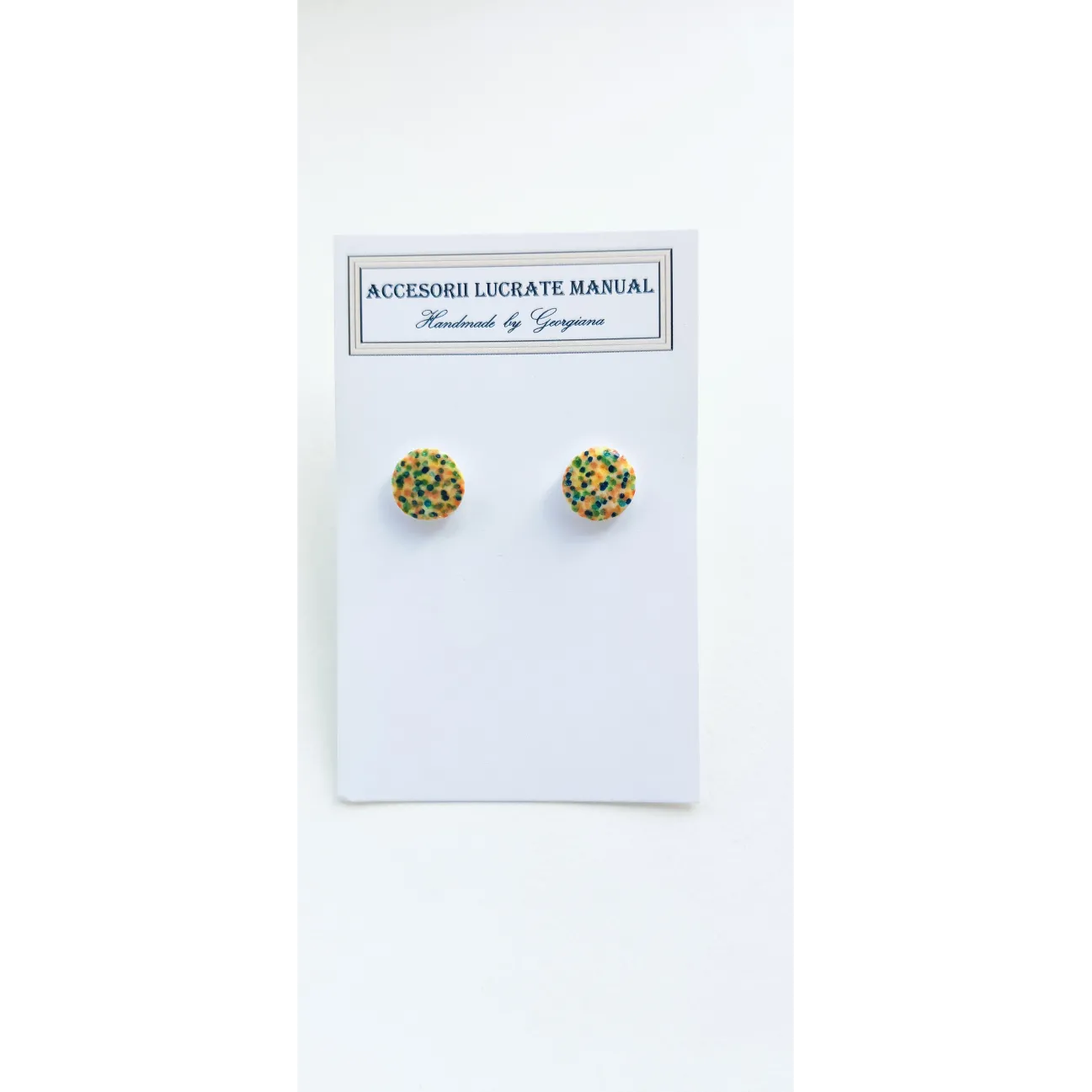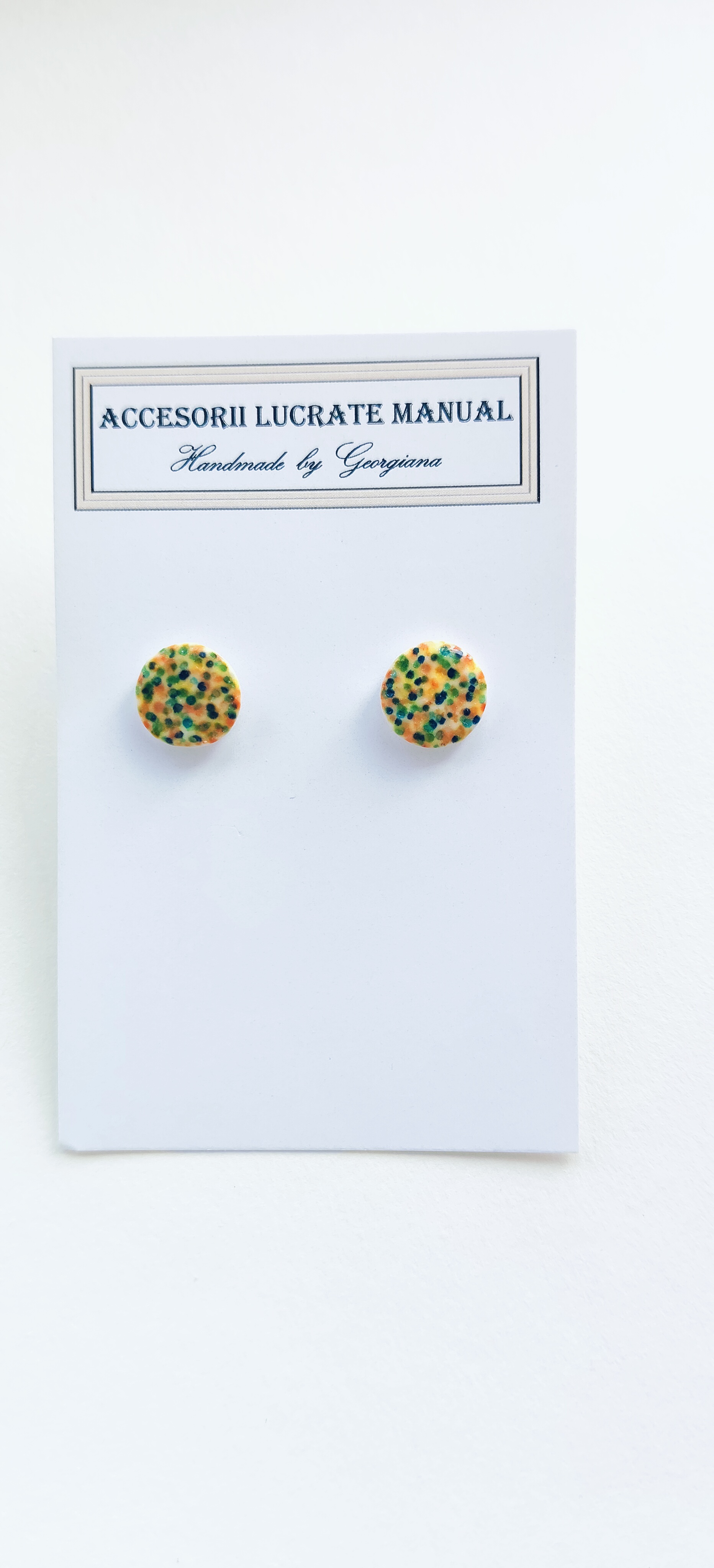 Cercei realizați manual din lut polimeric,lăcuiți cu rășina uv și accesorii din oțel inoxidabil.