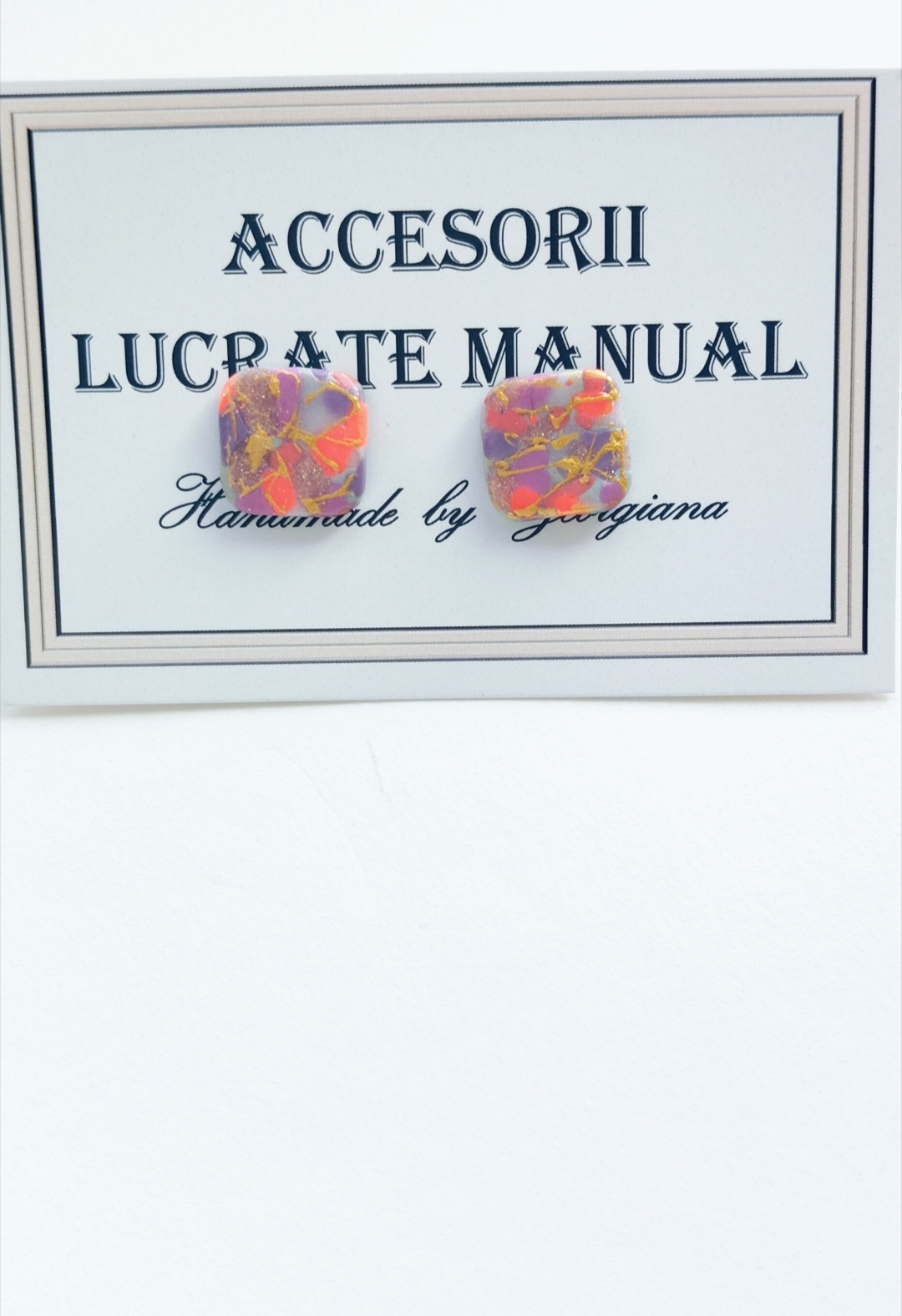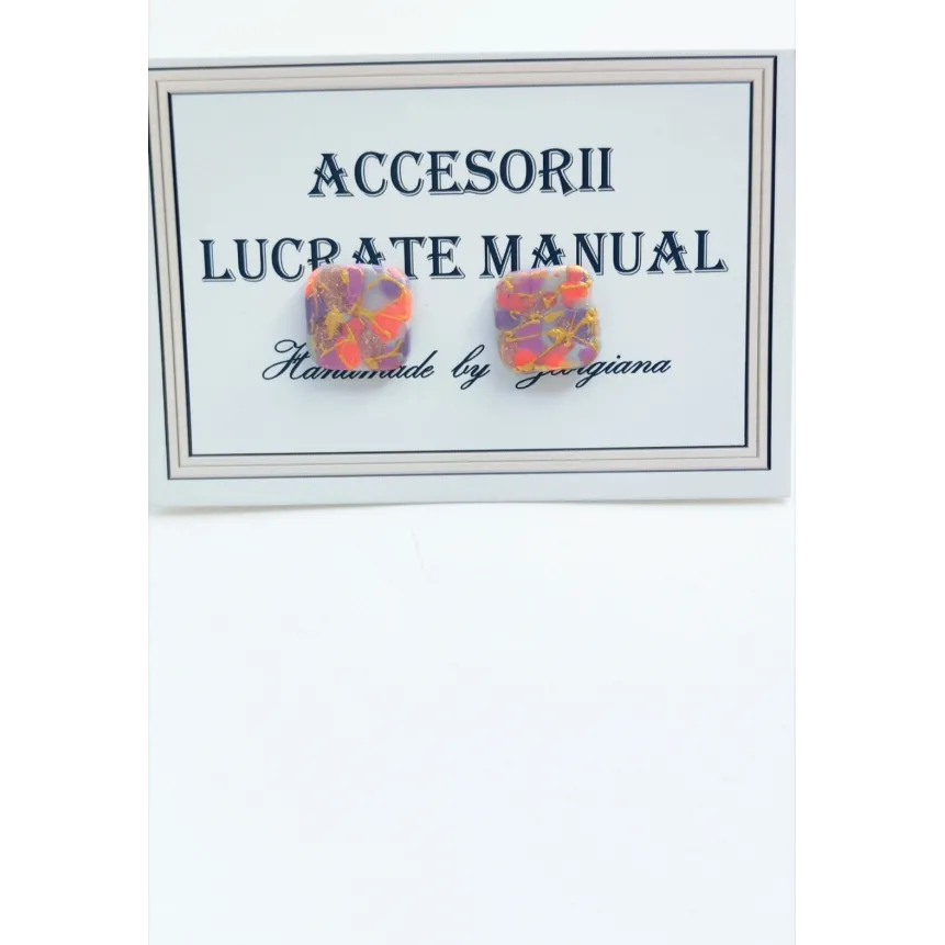 Cercei realizați manual din lut polimeric, lăcuiți cu rășina UV și cu accesorii metalice din oțel inoxidabil.