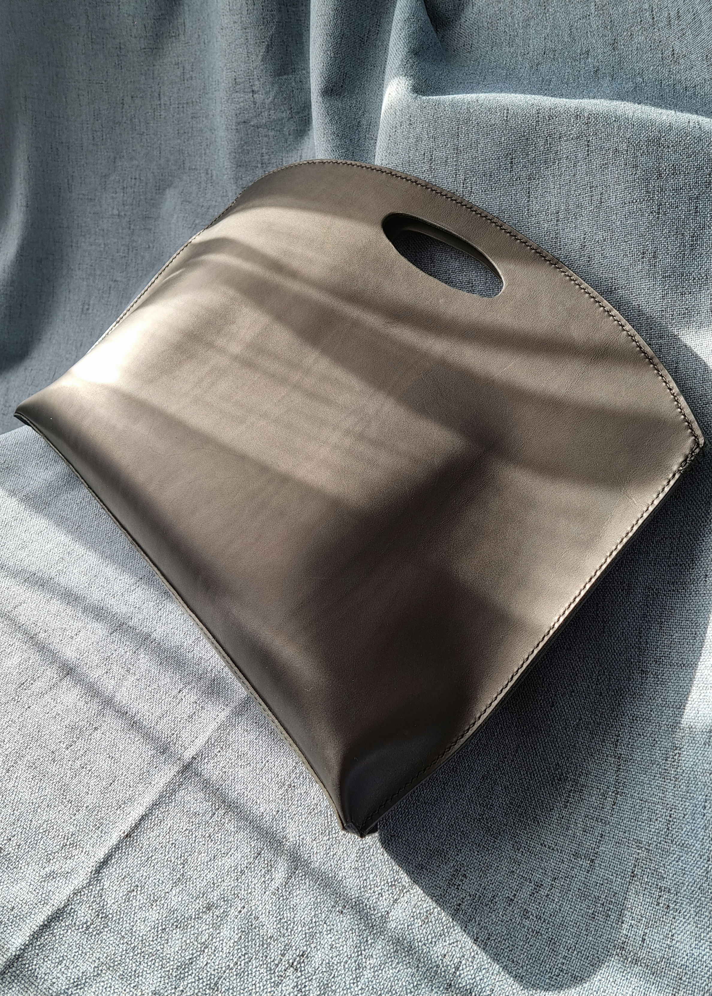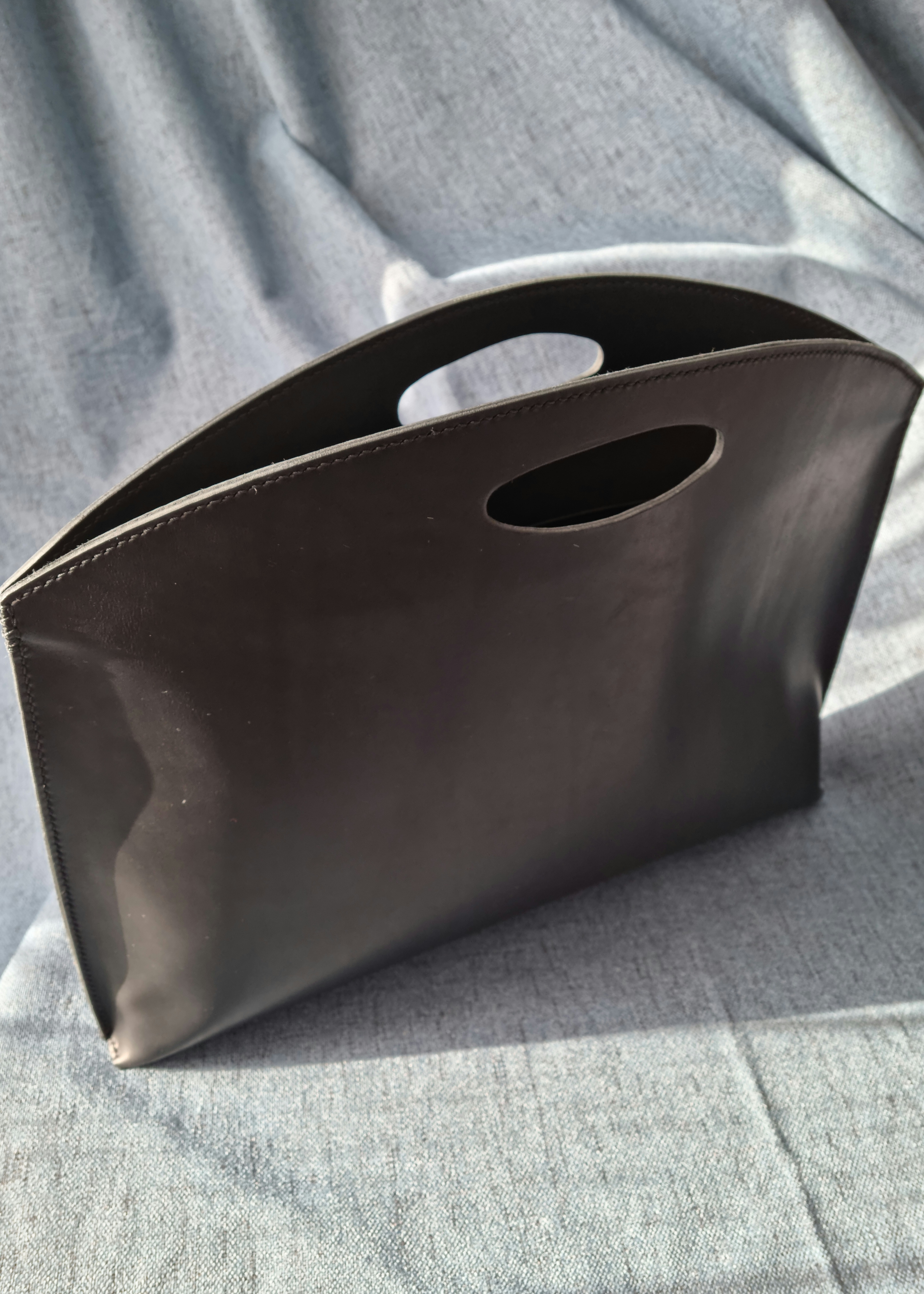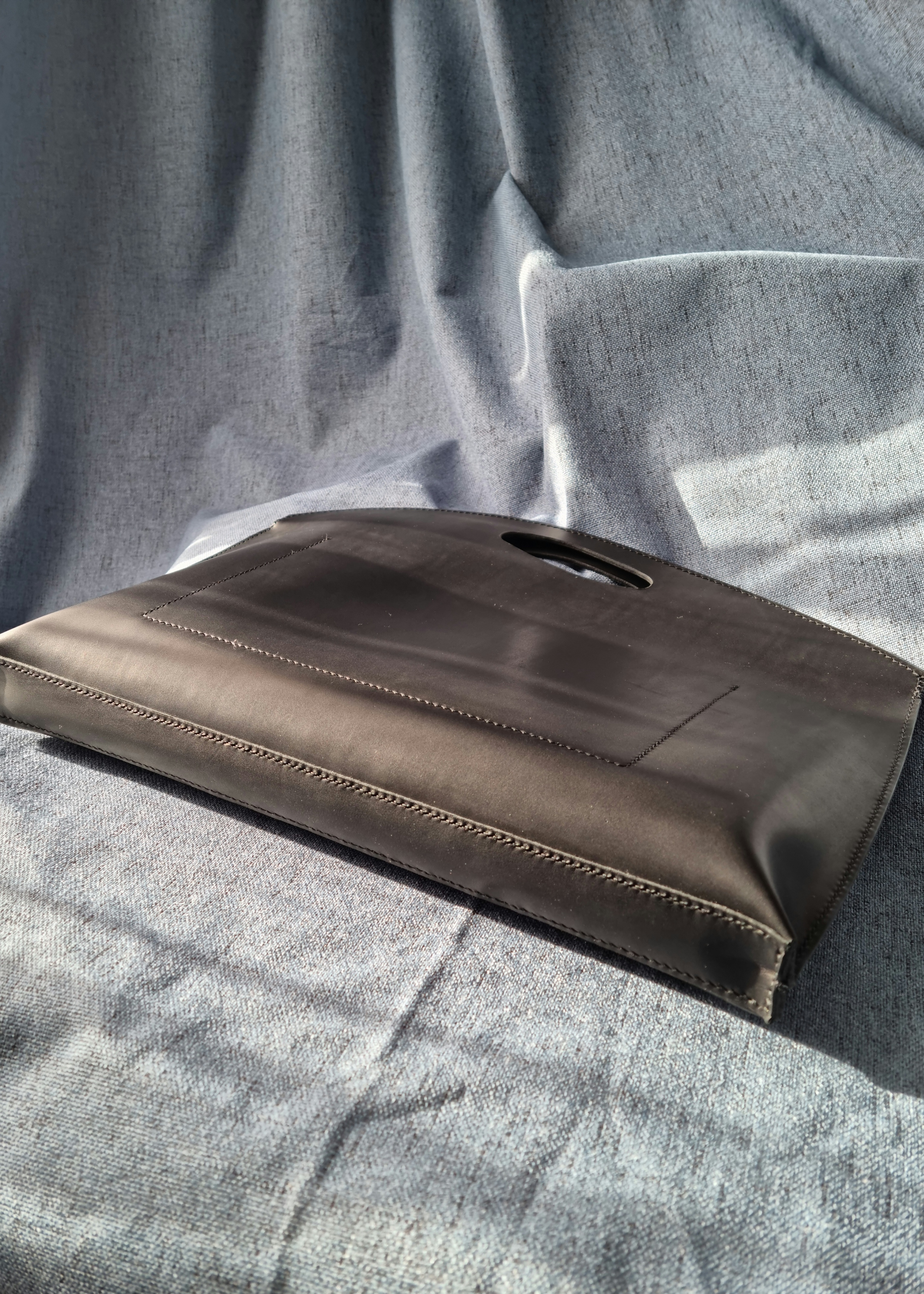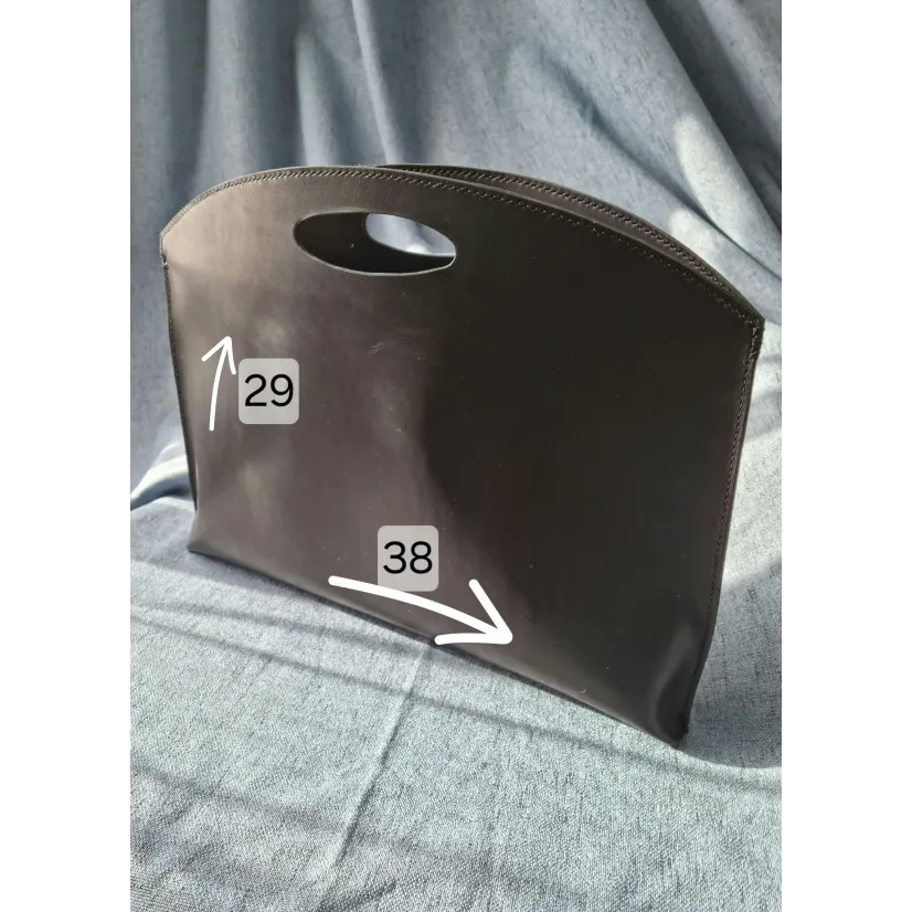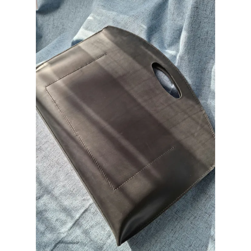 Această geantă plic handmade din piele naturală, cu design minimalist și mâner decupat, redefinește plicul clasic într-un accesoriu modern, curat și versatil.