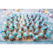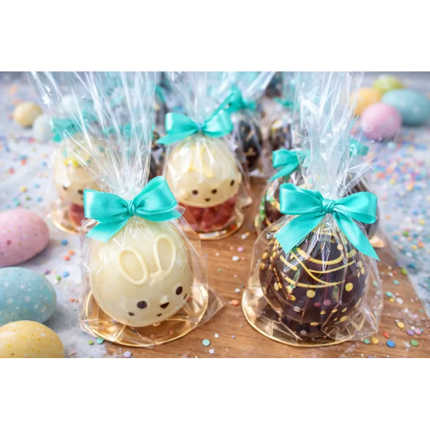 Ou cu carcasa din ciocolata turnata, decorat cu ciocolata diverse culori.