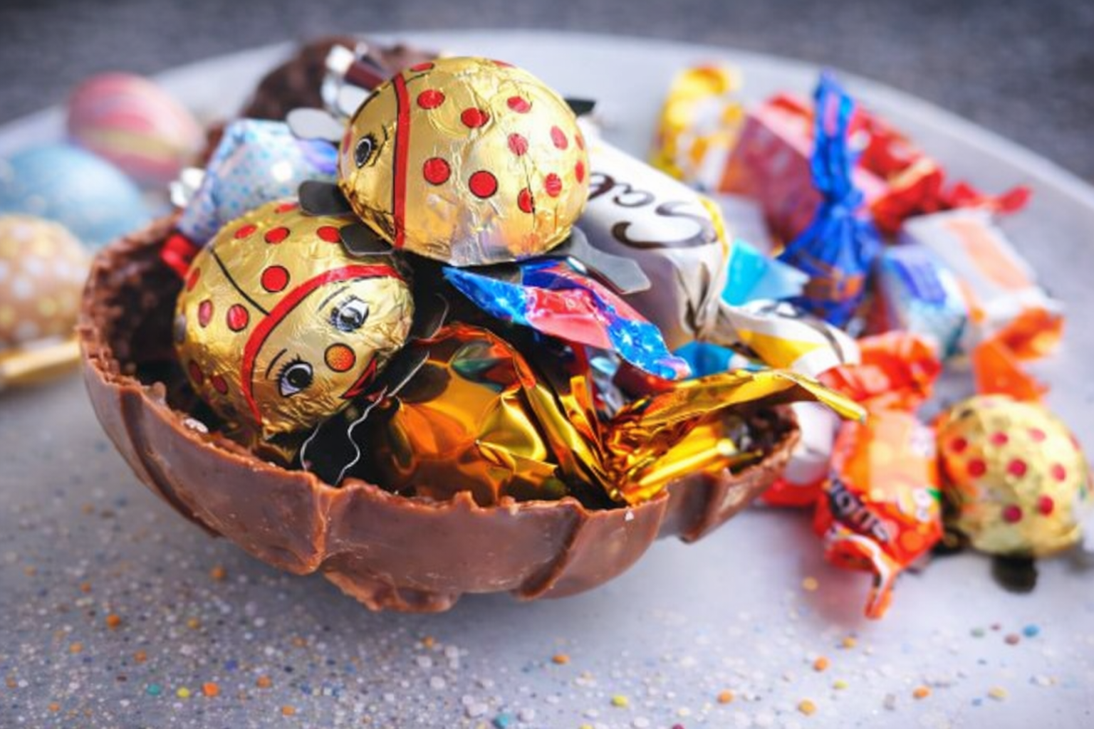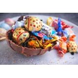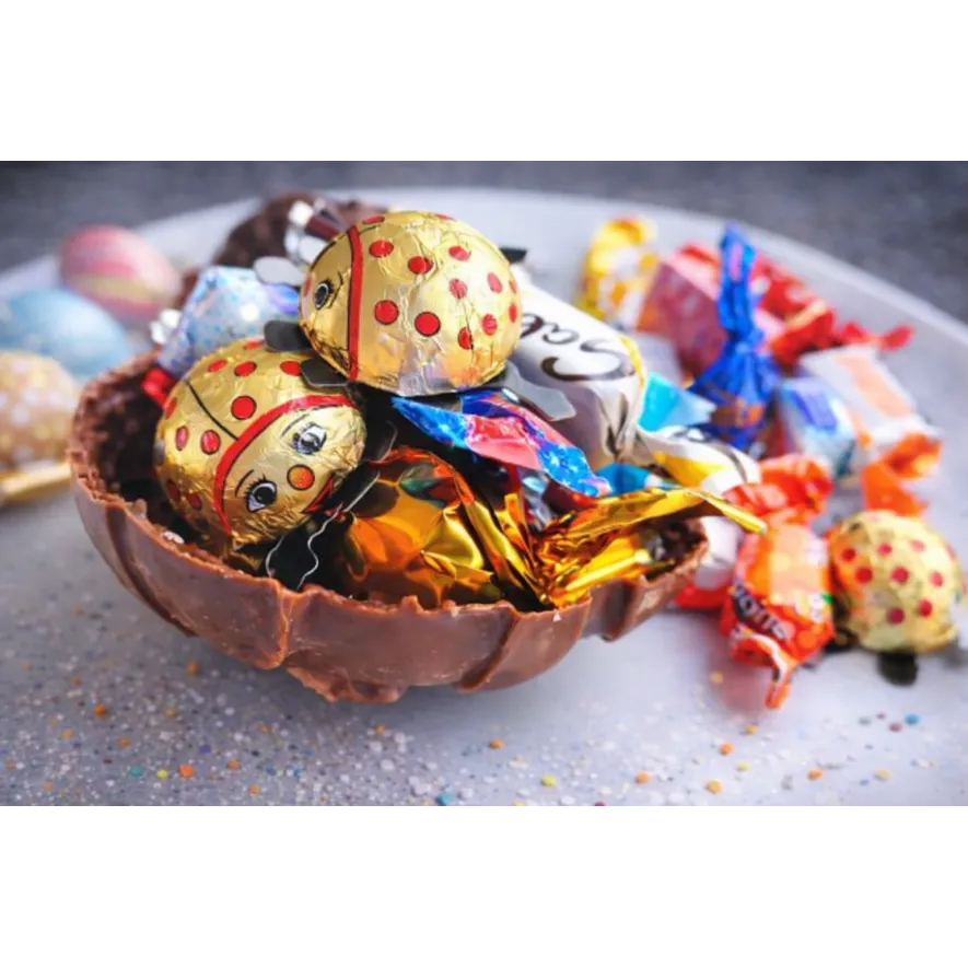 Ou cu carcasa din ciocolata turnata , umplut cu mix de bomboane ambalate.