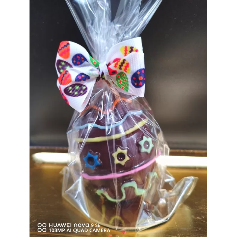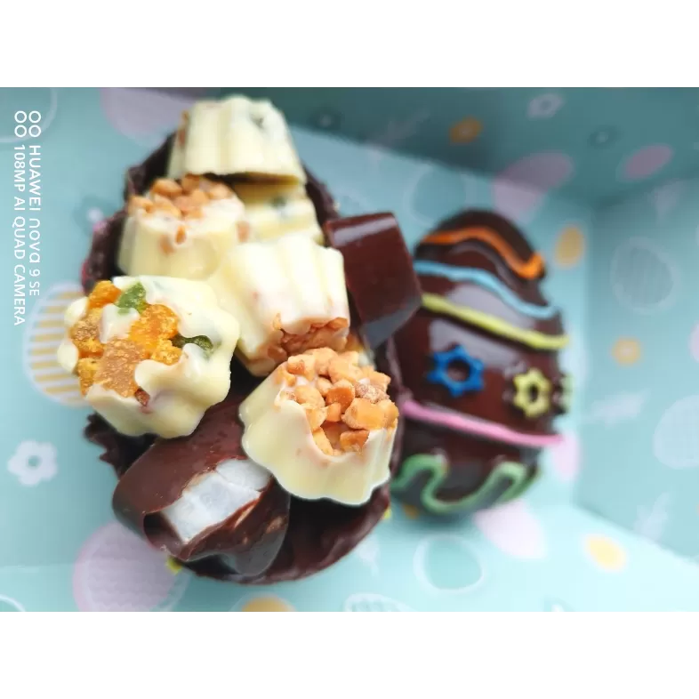 Ou din ciocolata turnata neagra/alba/cu lapte, decorat manual cu ciocolata colorata + umplutura din 6 bombonele din ciocolata veritabila cu: arahide caramelizate/ fructe confiate/ fructe cu coaja lemnoasa/ chipsuri din nuca de cocos.