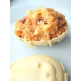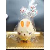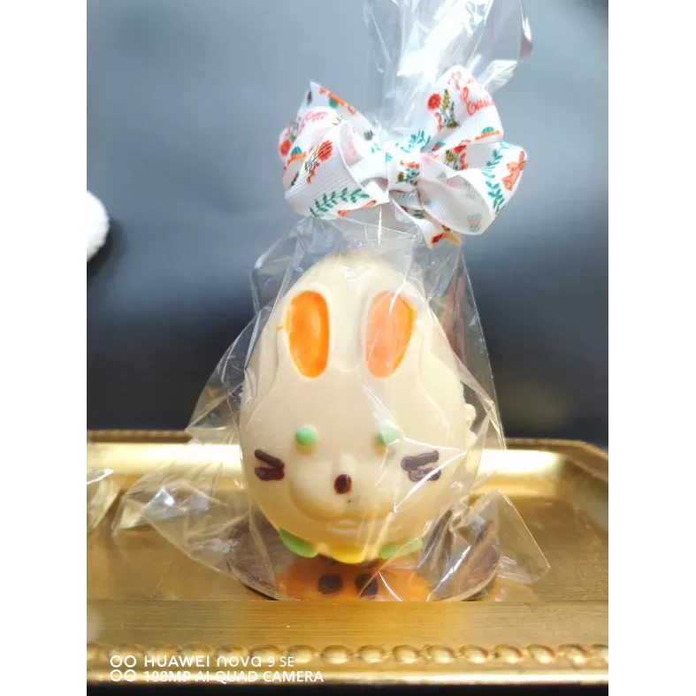 Ou din ciocolata turnata alba/cu lapte/neagra, decorat manual cu ciocolata colorata + umplutura cake pops vanilie.