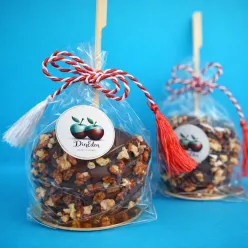 Mar glazurat cu ciocolata neagra + miez de nuca. Alege oricare mar din meniul nostru si noi il infrumusetam cu fundita de martisor.  Poti alege sa ambalam fiecare mar in cutie aurie.