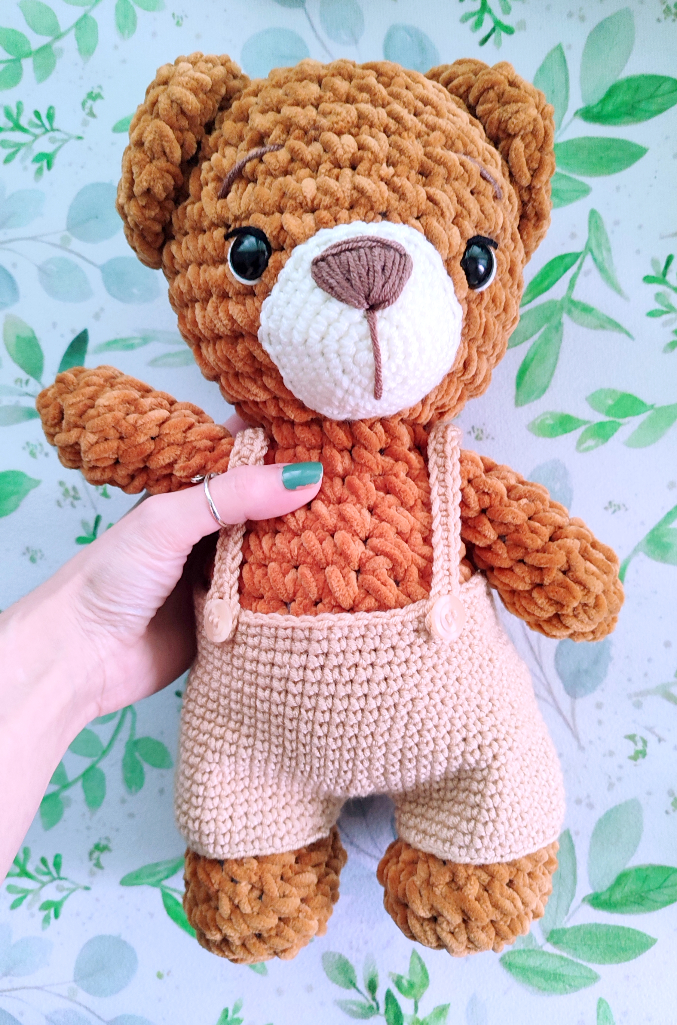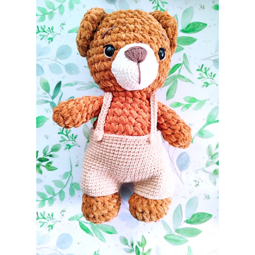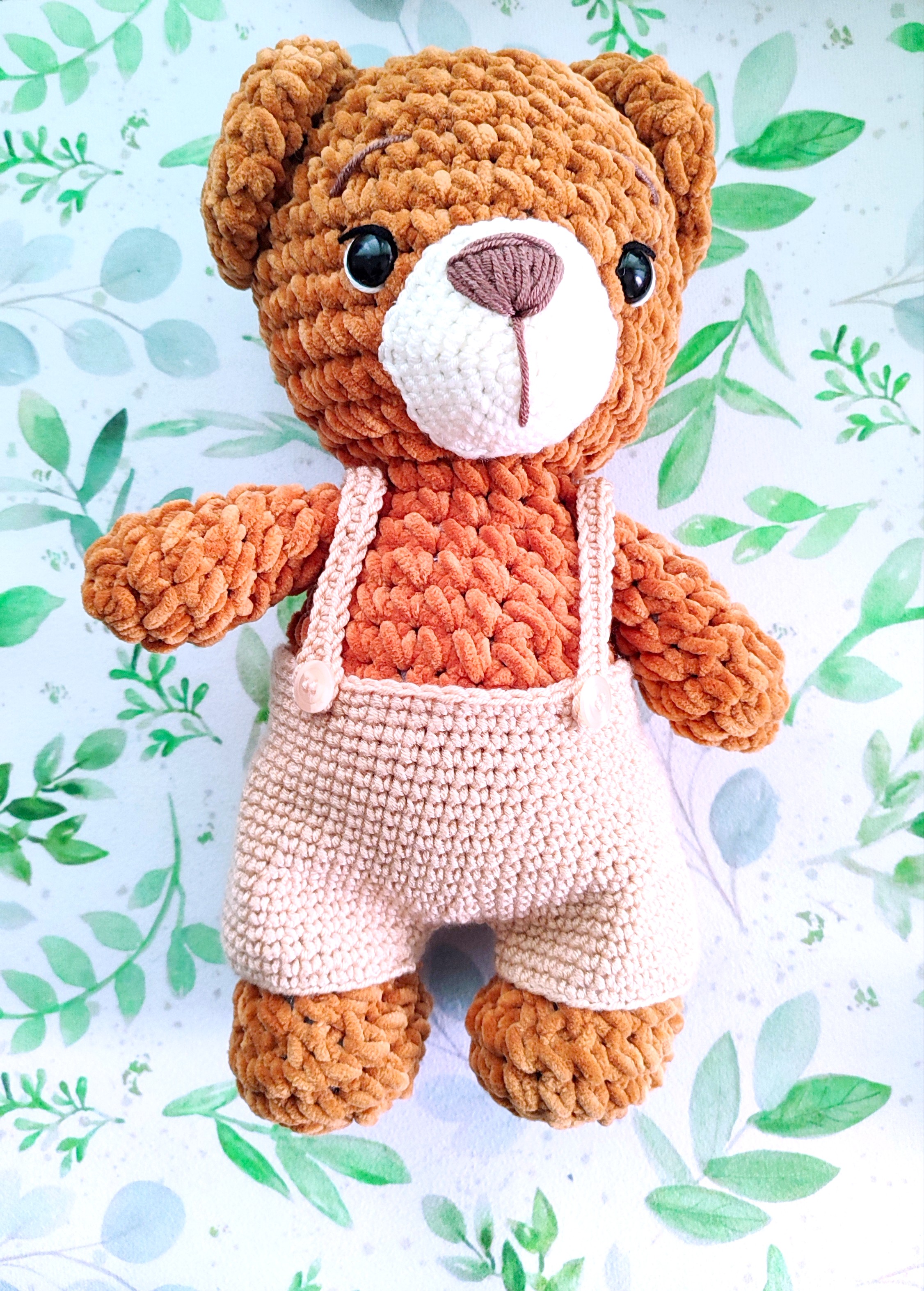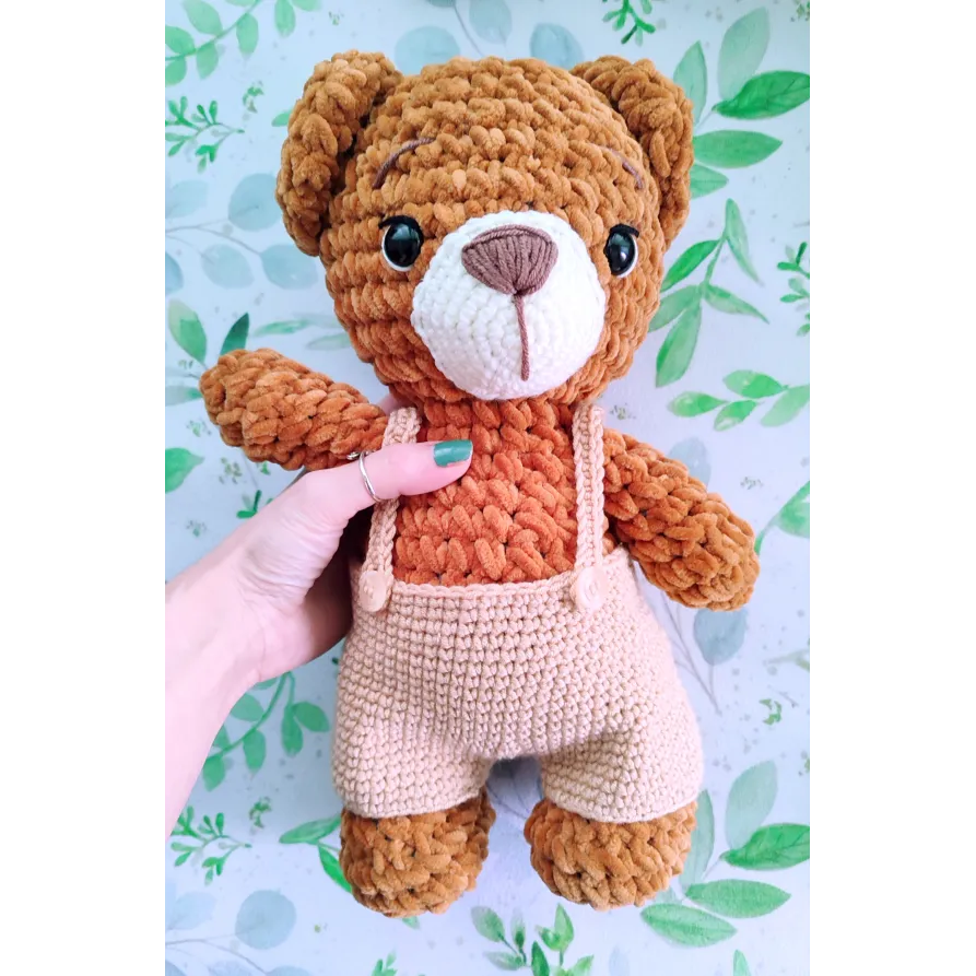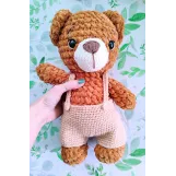 Un ursulet de plus crosetat, extrem de moale si pufos. Imbracat in salopeta, este pregatit sa dea imbratisari cat mai multe.