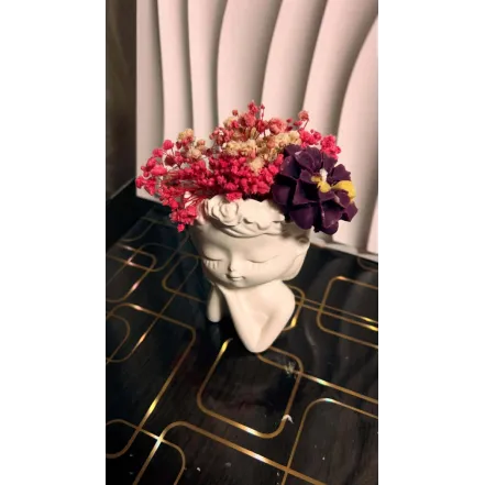 Ghiveci decorativ tip bust cu flori uscate si lumanari parfumate
