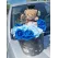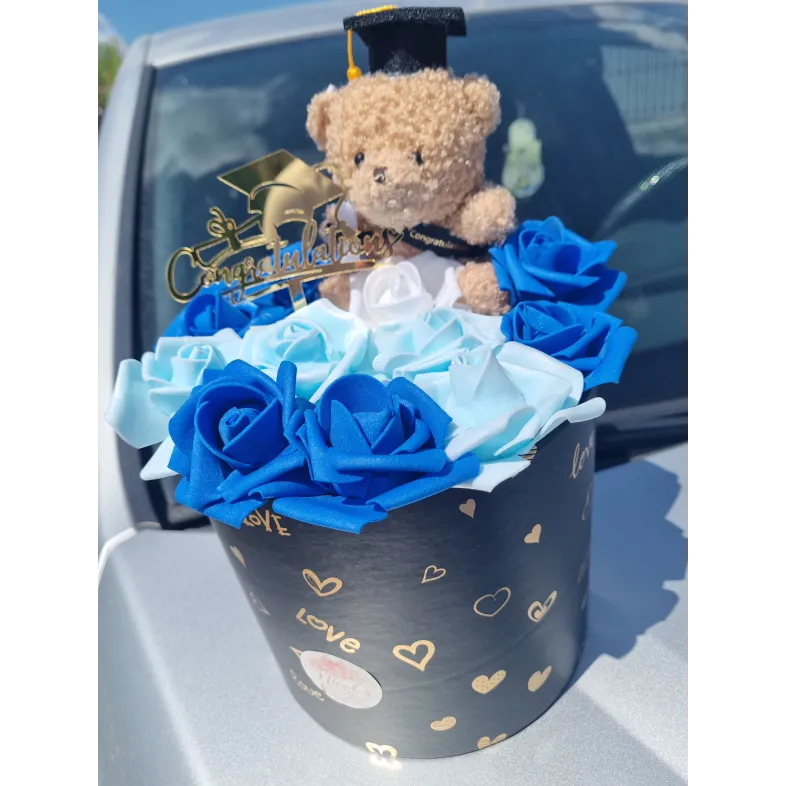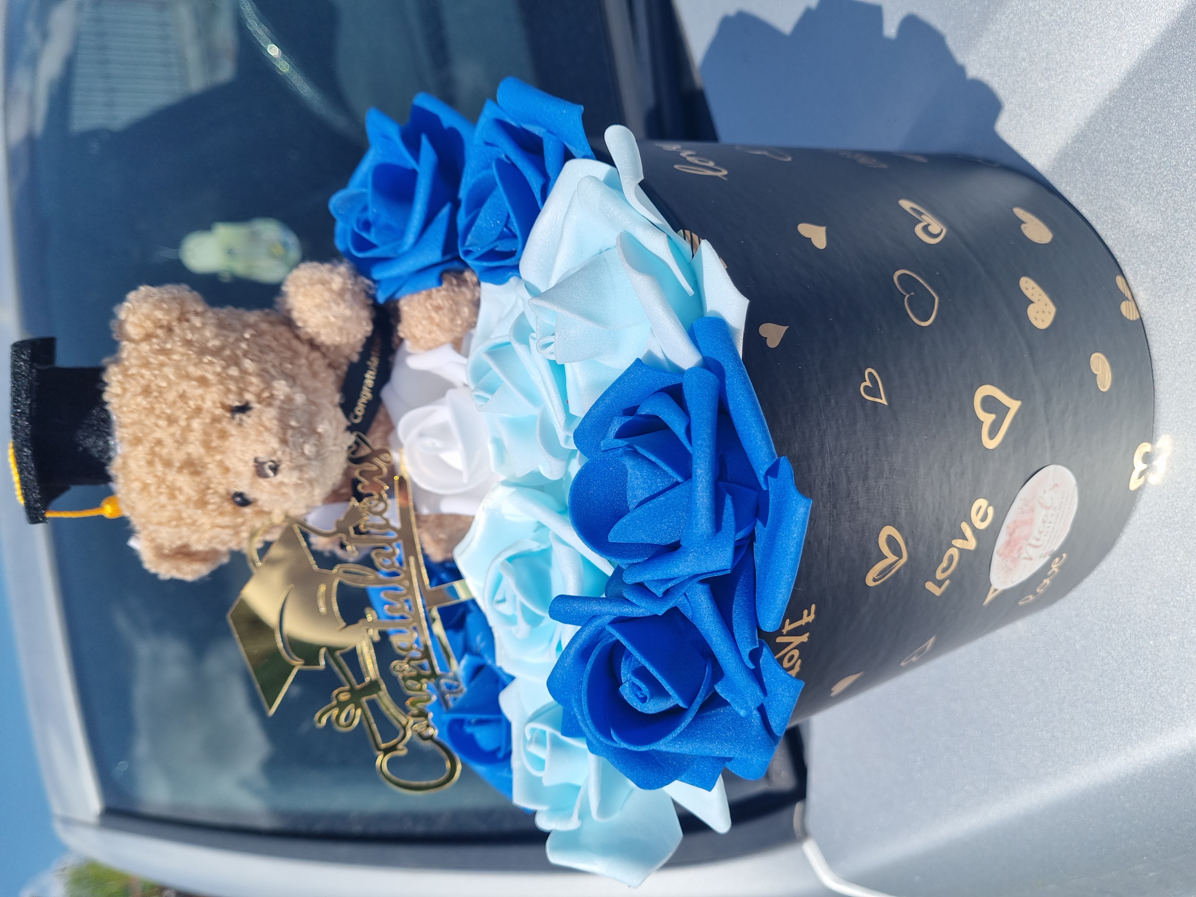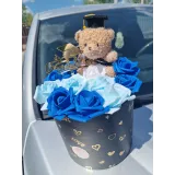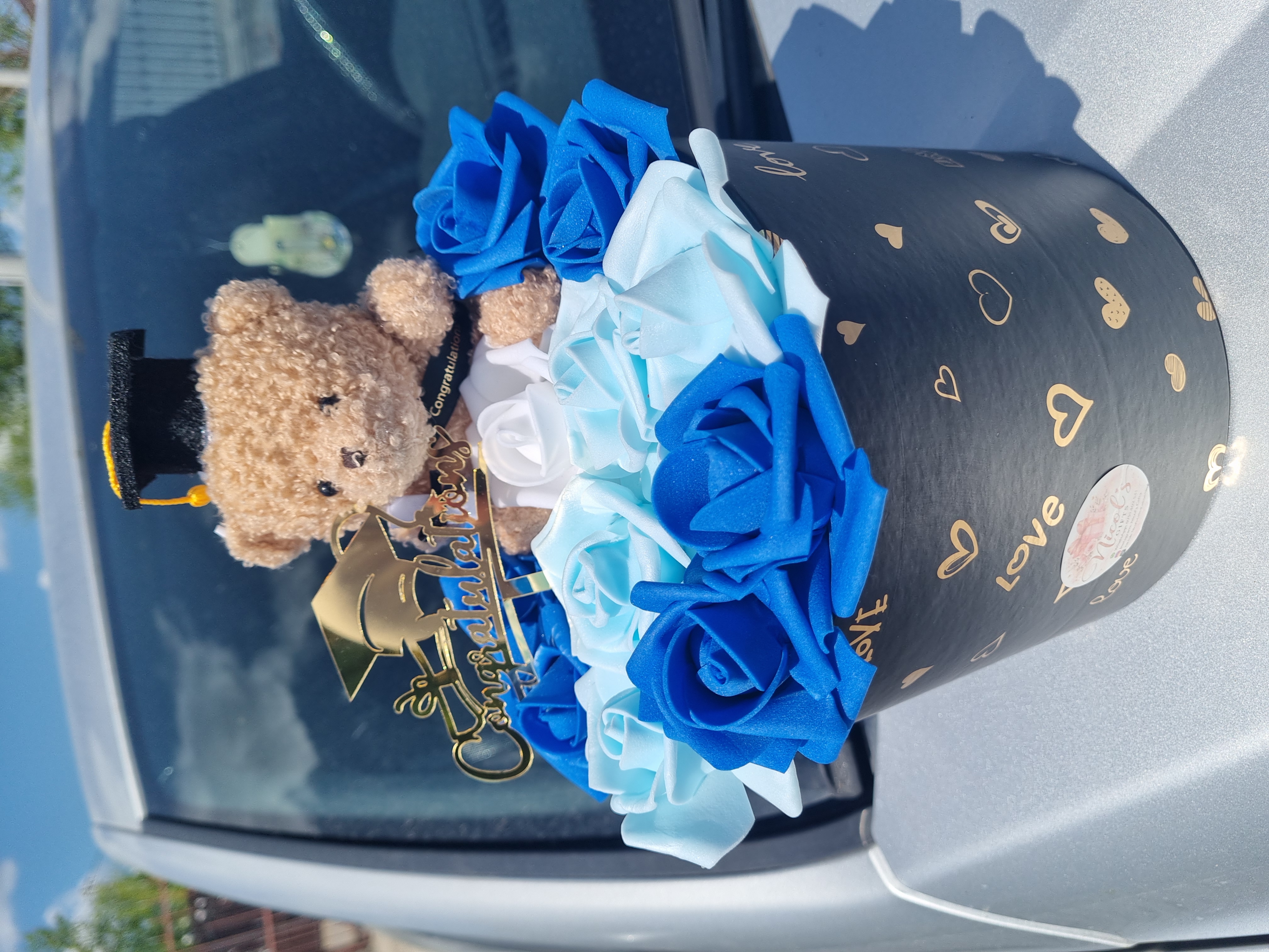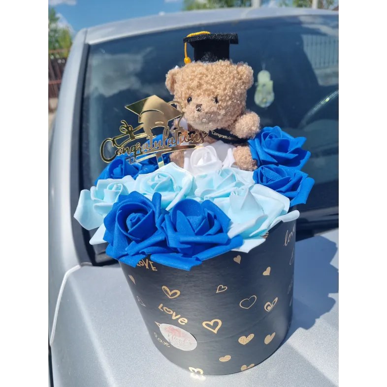 Un aranjament elegant, realizat manual, cu trandafiri din spumă în nuanțe de albastru și un ursuleț adorabil pregătit de absolvire