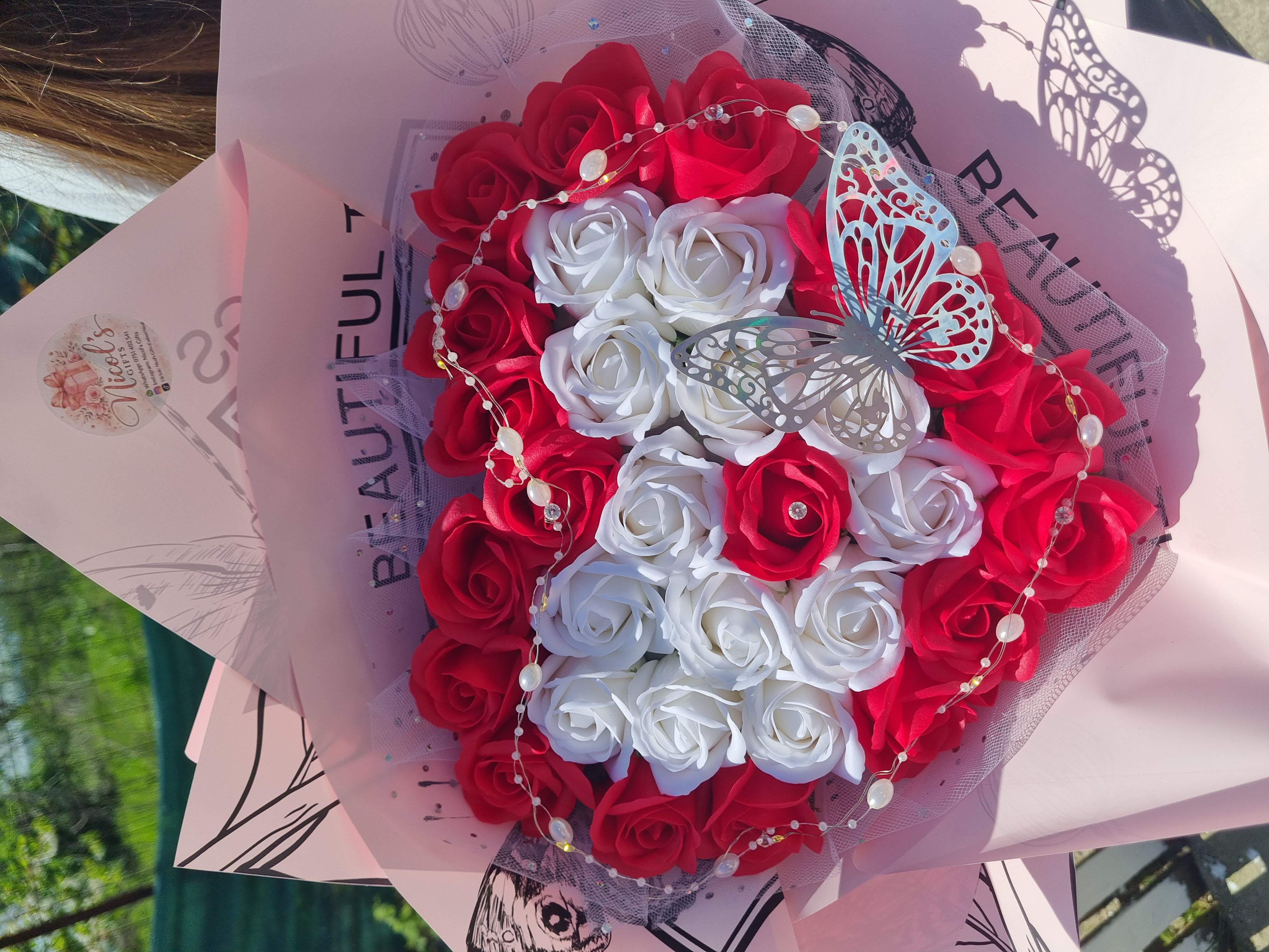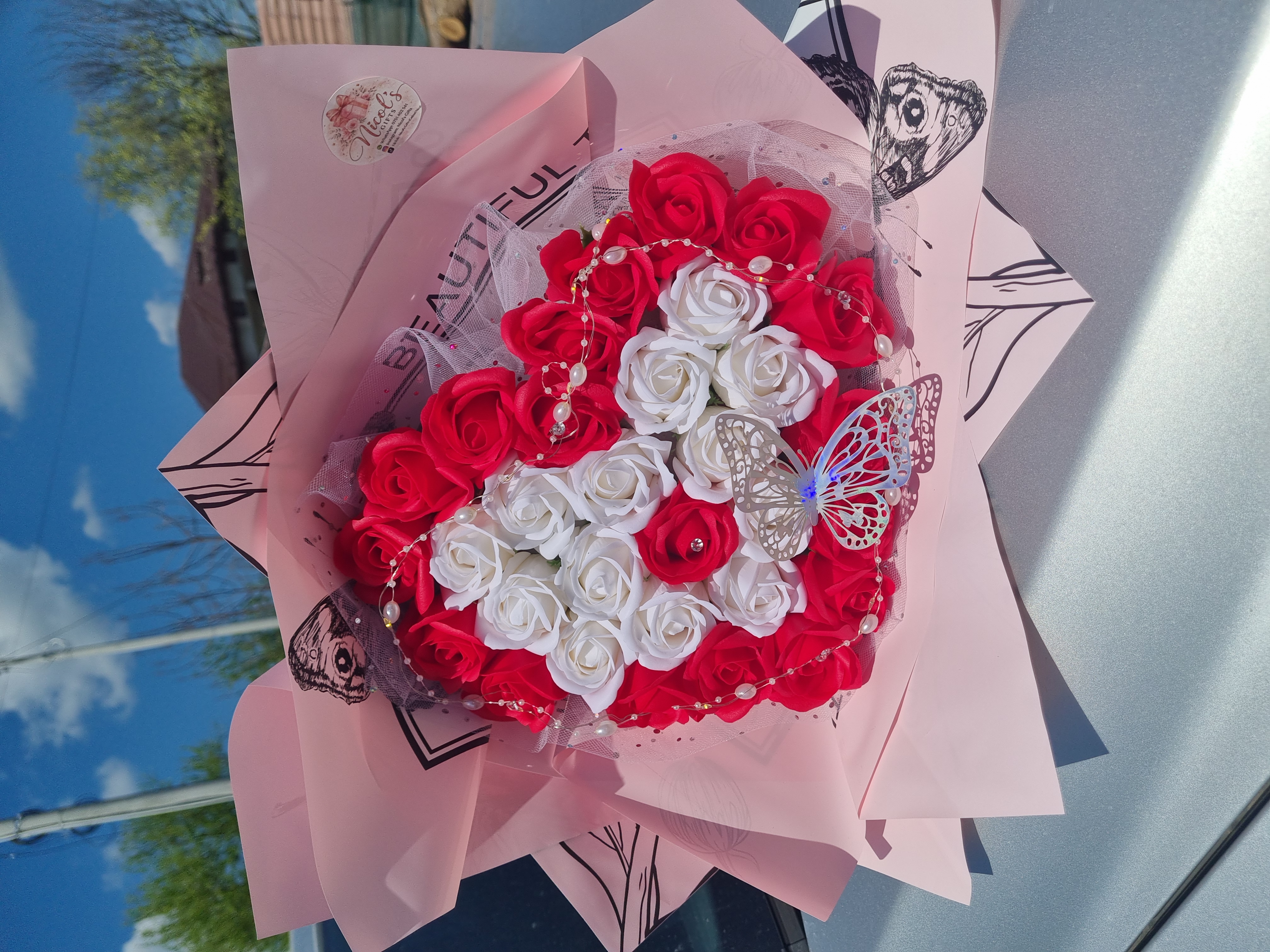 Realizat manual cu atenție la detalii, în nuanțe rafinate de roșu și alb, decorat cu perle delicate și fluture elegant