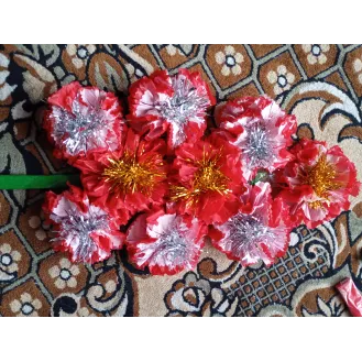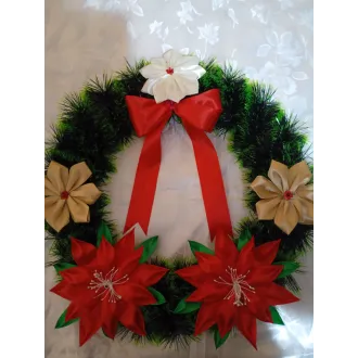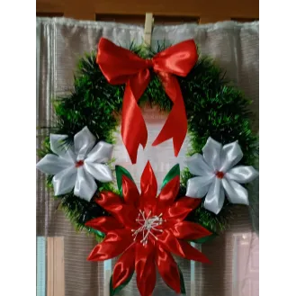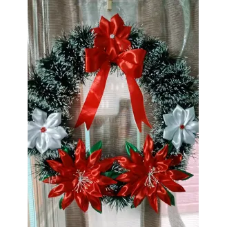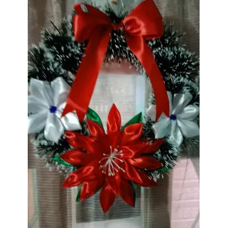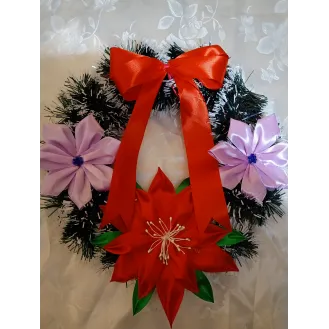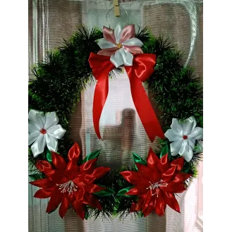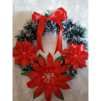 Coroniță pentru ușa, confecționată din carton, sârmă flori din satin și beteala. Dimensiuni:42 cm diametrul , Culori:beteala verde,2 crăciunițe roșii ,  Și încă 3 flori de diferite culori,la alegere .