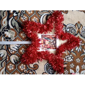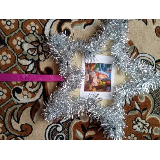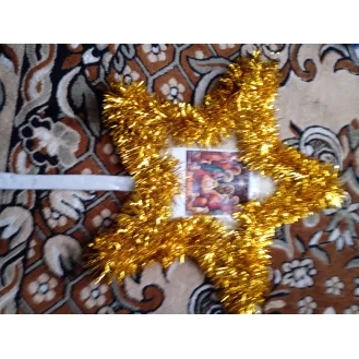Stea confecționată din lemn, beteala iconiță cu nașterea Domnului, și hârtie de ambalaj.