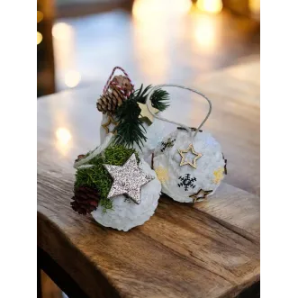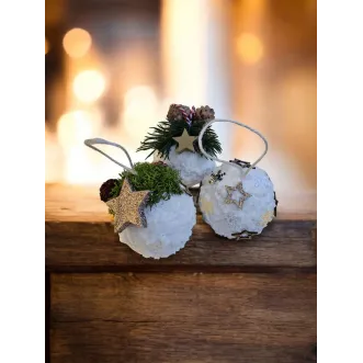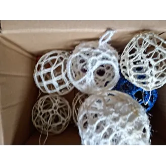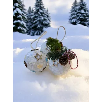 Globurile sunt lucrate manual pe bază de polistiren, sunt decorate cu zăpadă artificială și diverse ornamente - licheni, conuri, brad artificial și steluțe. Au diametrul de aproximativ 8 cm.