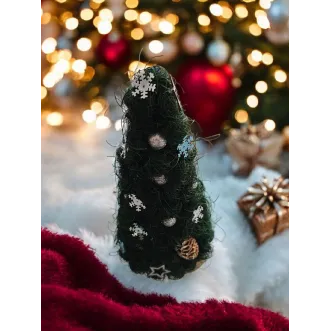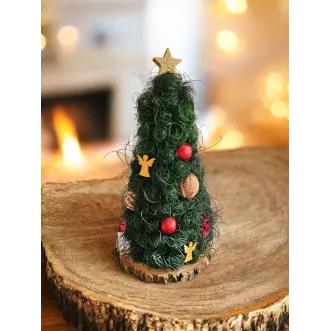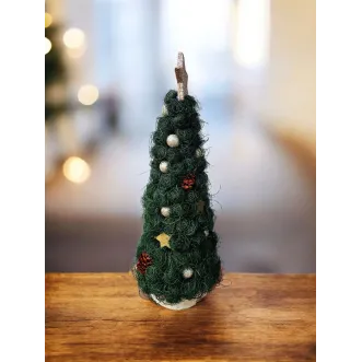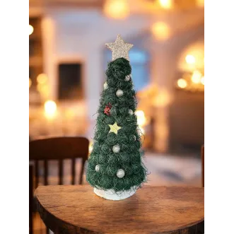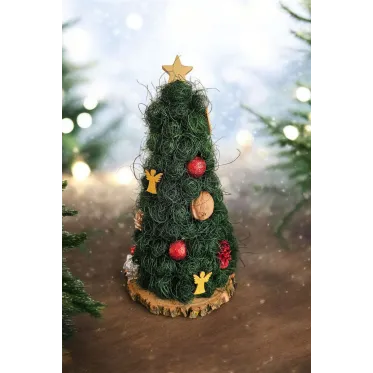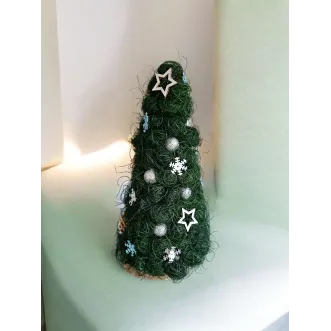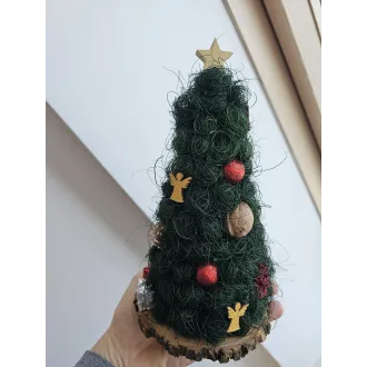 Brăduțul este lucrat manual din sisal, având suport o felie de lemn. Este împodobit cu diverse ornamente. Are înălțimea de aproximativ 22-23 cm. Perfect pentru a fi așezat pe masa festivă de Crăciun sau de asemenea, poate fi un cadou drăguț în prag de sărbători.