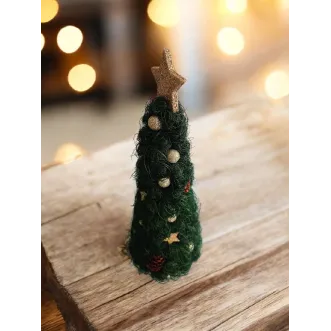 Brad decorativ handmade, 15cm inaltime, acoperit cu fir textil verde inchis, decorat cu globuri si feriga aurie.