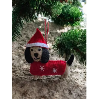 Decorațiunea e realizată manual din fetru și umplută cu puf hipoalergenic. Ochii cățelului sunt din plastic, cu protecție (nu cad). Ideală pentru a fi agățată în brad, pe ghirlande, etc. Lungime aproximativă 7 cm.
