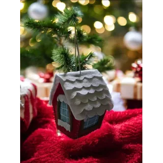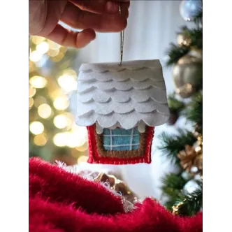 Căsuța este cusută manual din fetru, iar pereții și acoperișul sunt întăriți. Se poate agăța în brad sau în alte locuri, după preferințe. Înălțime aproximativ 10 cm.