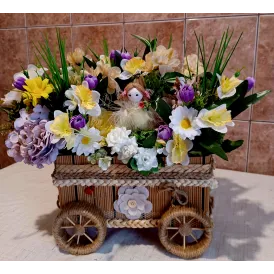 Aranjament ușă iepuraș pe suport cu flori artificiale, 50 cm înălțime, se pregătește pentru cei dragi!