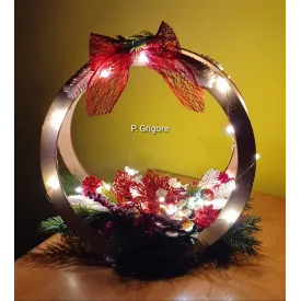 Coroniță pentru ușa, confecționată din carton, sârmă flori din satin și beteala. Dimensiuni:42 cm diametrul , Culori:beteala verde,2 crăciunițe roșii ,  Și încă 3 flori de diferite culori,la alegere .