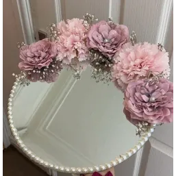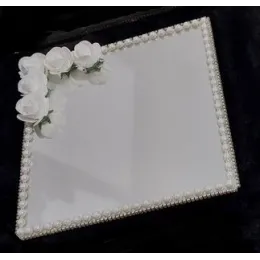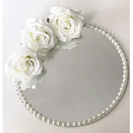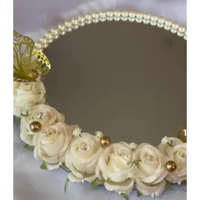 Suport verighete oglindă – model elegant cu flori artificiale și mesaj, ideal pentru nuntă Transformă momentul schimbului de verighete într-o amintire de neuitat cu acest suport de verighete deosebit, realizat din oglindă  de calitate, decorat manual cu flori artificiale elegante  perlute și o fundă satinată. Accesoriul este prevăzut cu două casete  pentru verighete și un mesaj emoționant  Un detaliu rafinat pentru cununia religioasă, acest platou oferă un plus de eleganță și semnificație momentului solemn al jurămintelor. Este perfect pentru fotografii și pentru a păstra verighetele în siguranță până în momentul magic al ceremoniei....