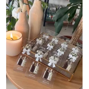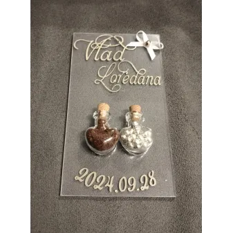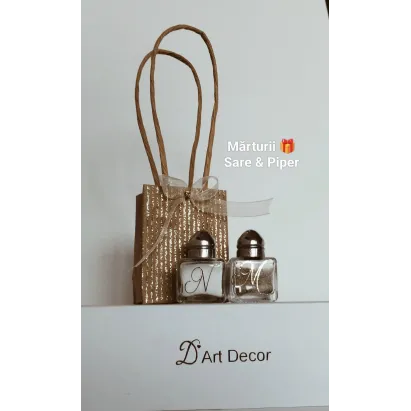 Mărturii Sare & Piper – Eleganță în sticluțe mici Oferă-le invitaților tăi o amintire specială și practică – setul *Mărturii Sare & Piper*! Două sticluțe elegante, umplute cu sare și piper, decorate cu inițialele „N” și „M”, simbolizând echilibrul perfect al gusturilor naturale. Ambalajul deosebit – o pungă aurie strălucitoare cu fundiță – adaugă un plus de rafinament momentului. Ideal pentru nunți, botezuri, aniversări sau orice eveniment festiv unde eleganța și originalitatea contează. **Conținut:** * 1 sticluță cu sare * 1 sticluță cu piper * 1 pungă cadou elegantă, cu fundiță **Personalizare:** La cerere, putem personaliza cu...