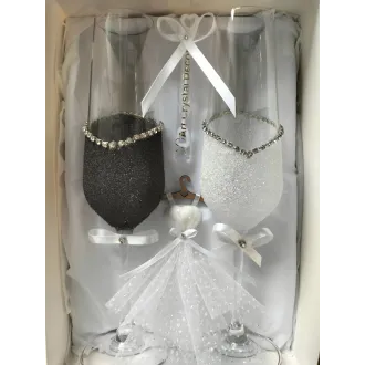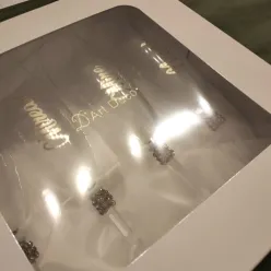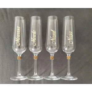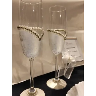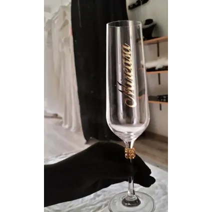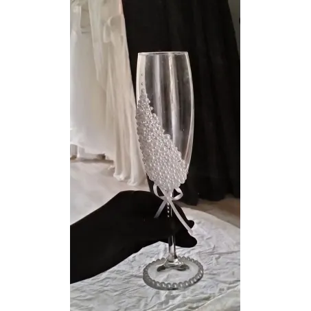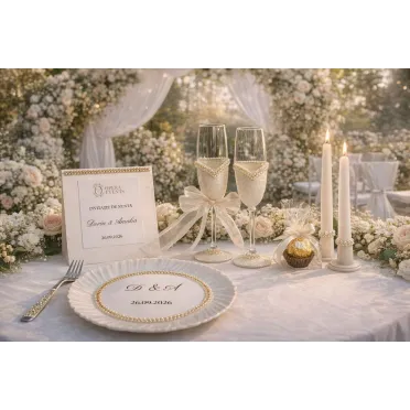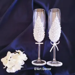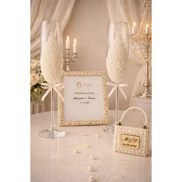 Set Orchidea – pahare de șampanie personalizate Setul Orchidea îmbină eleganța romantică cu detalii rafinate. Setul conține două pahare de șampanie tip flûte, realizate din sticlă de înaltă calitate. Paharele sunt decorate cu un design alb-lăptos special, completat de perle fine și accente strălucitoare. Elementul central este floarea de orhidee realizată manual, care oferă un aspect exclusiv și romantic. Paharele sunt realizate cu text personalizat – nume, titluri sau dată – fiind ideale pentru nunți, logodne sau evenimente speciale. Caracteristici produs: Set format din 2 pahare de șampanie Sticlă transparentă de calitate...