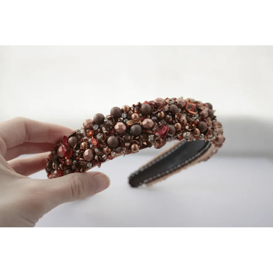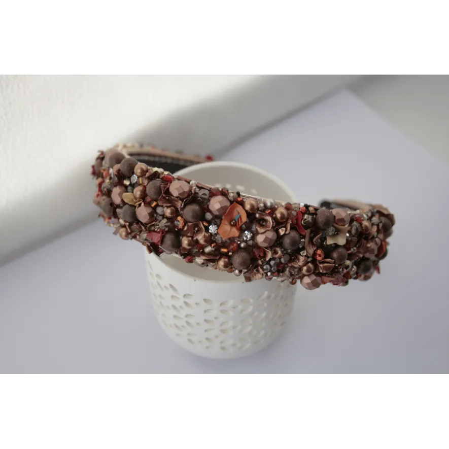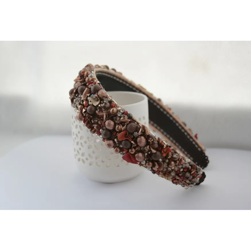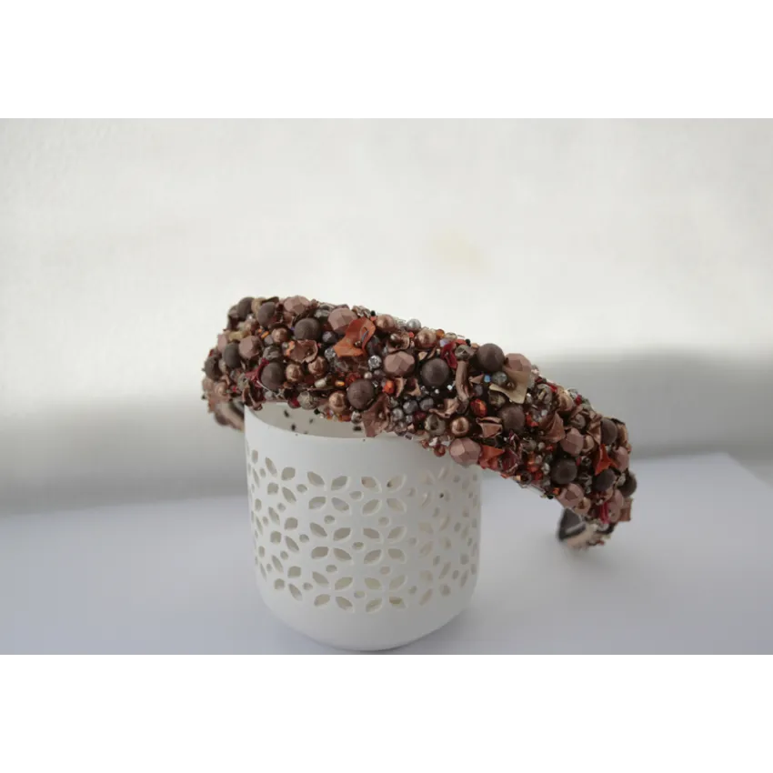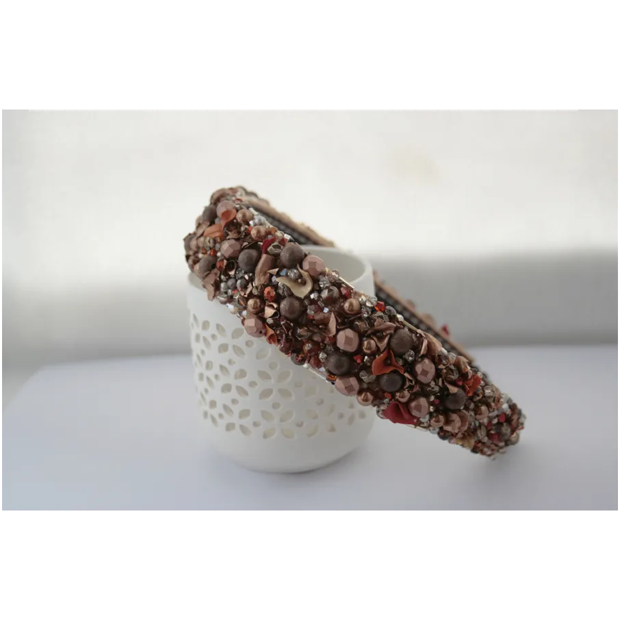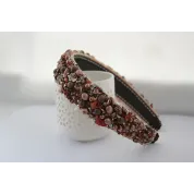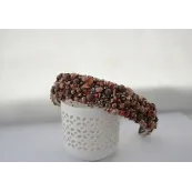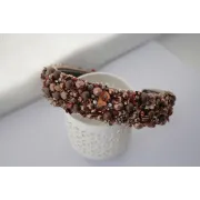 Cordeluta realizata manual din perle Swarovski, margele de sticla, margele Cehia, cristale si vopsea acilica, cusute pe fetru si aplicate pe o baza de cordeluta din plastic.