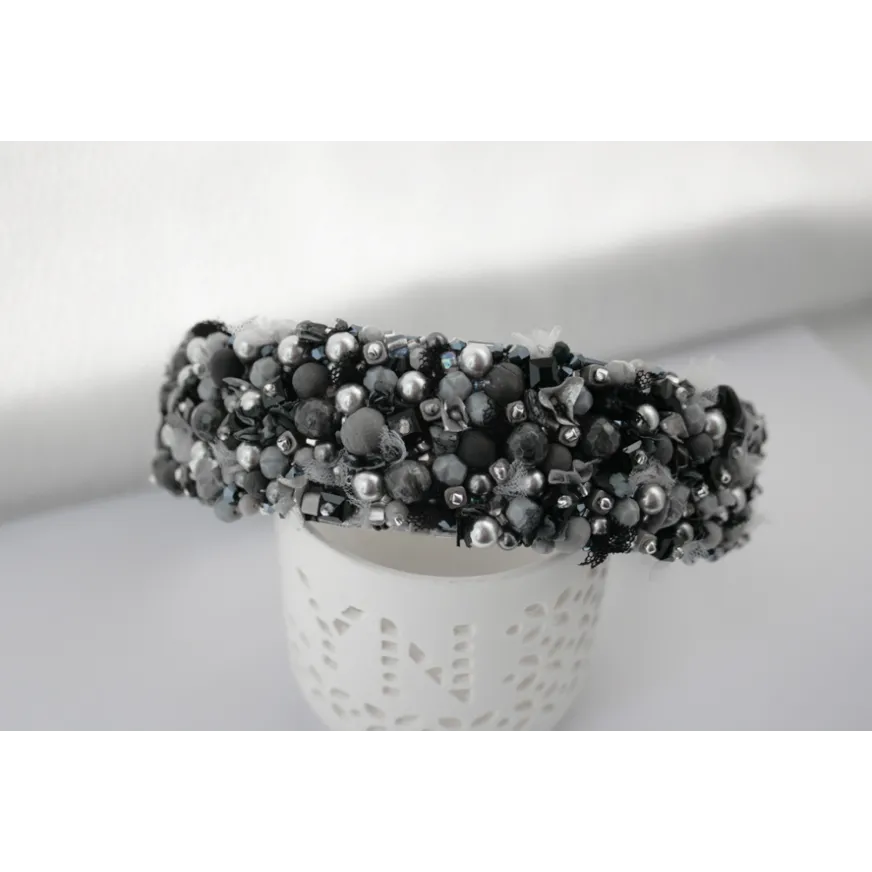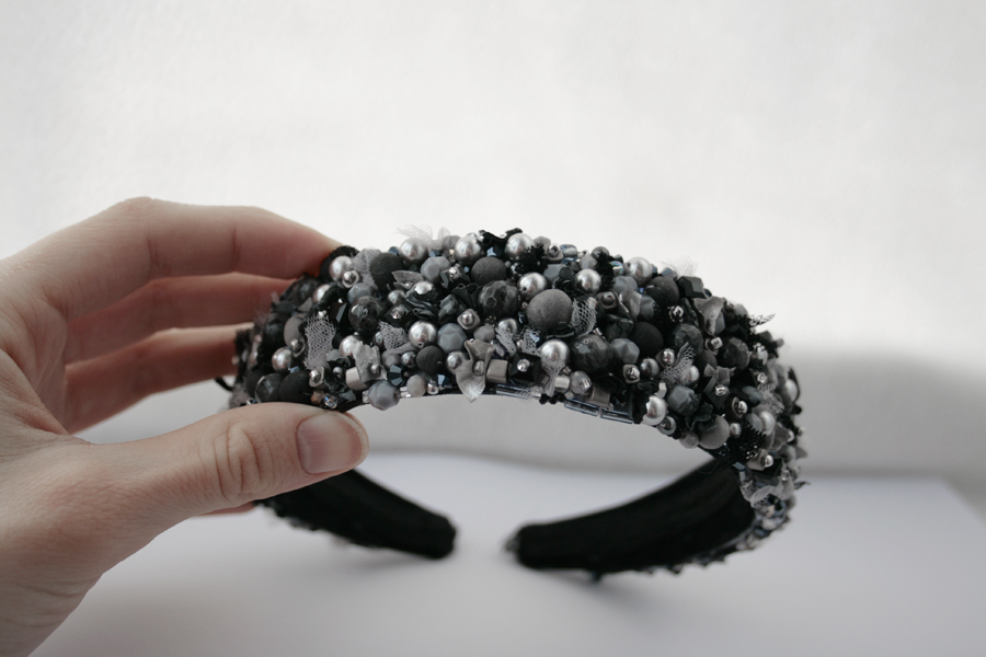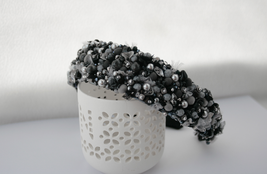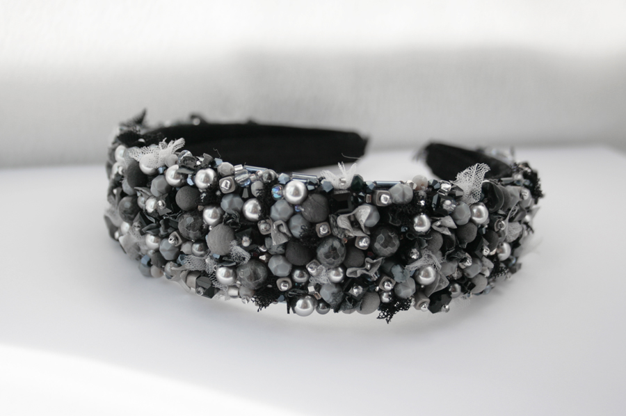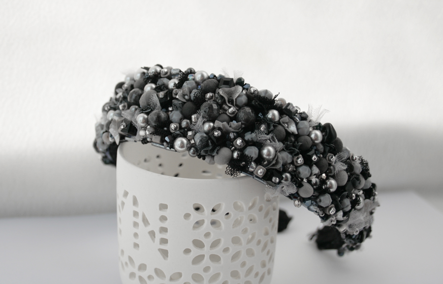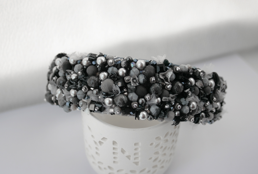 Cordeluta realizata manual din perle Swarovski, margele de sticla, margele Cehia, margele din spuma, vopsea acrilica, tulle gri si negru, cusute pe fetru gri si aplicate pe o baza imbracata in catifea neagra.