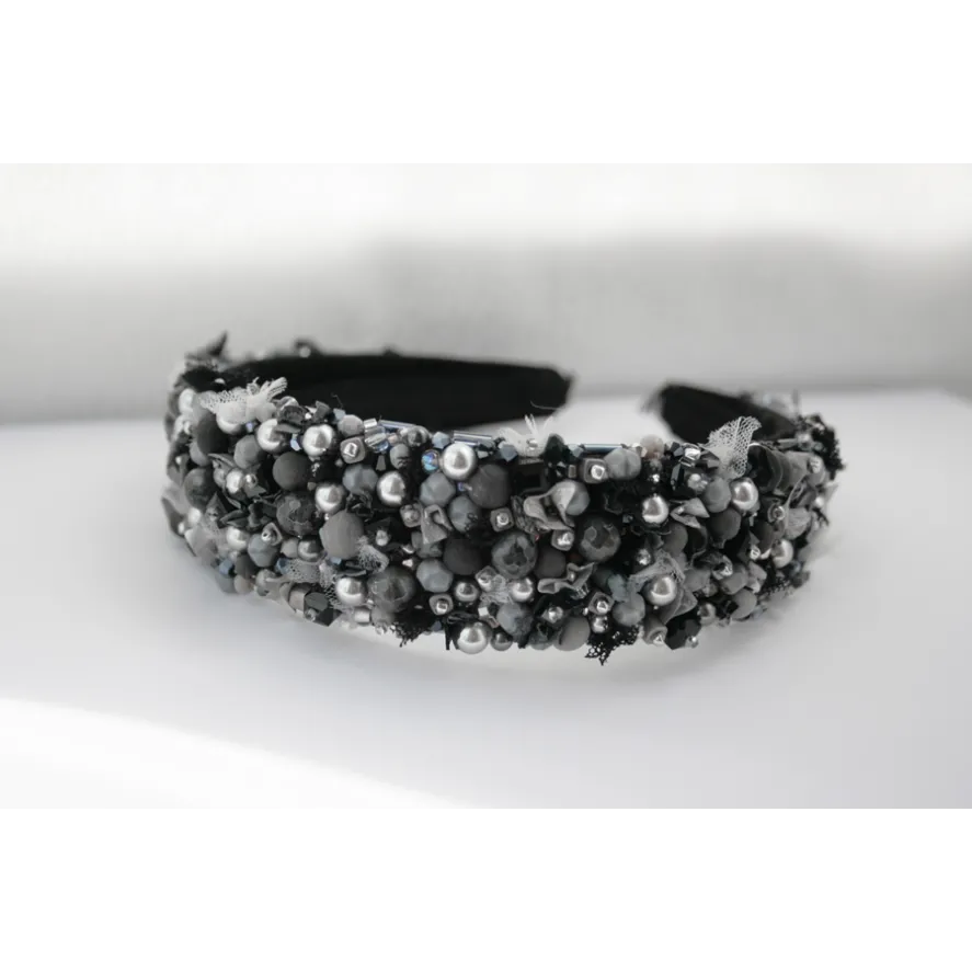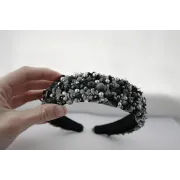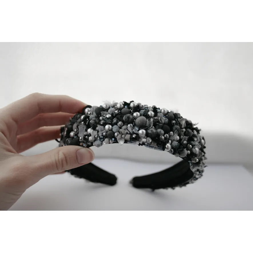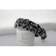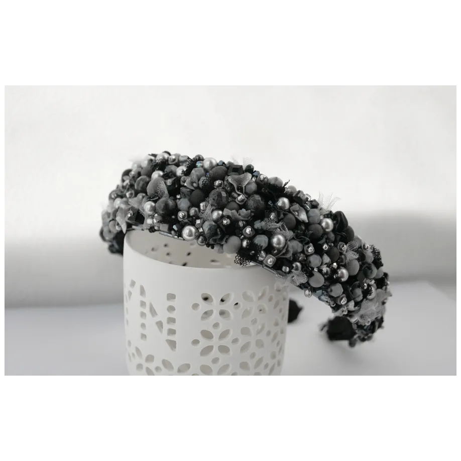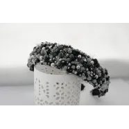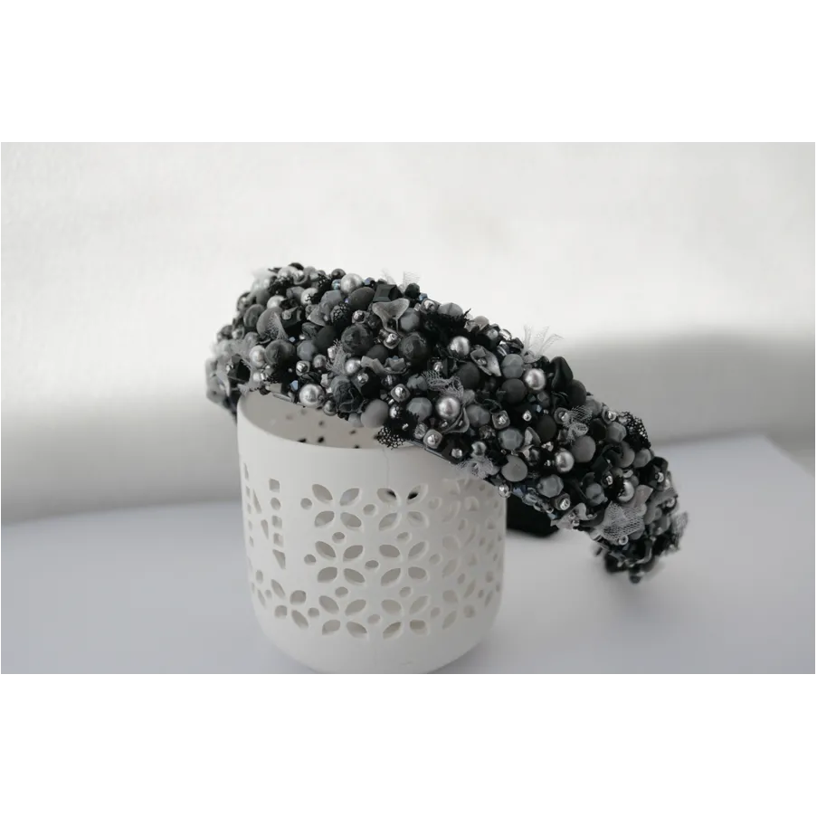 Cordeluta realizata manual din perle Swarovski, margele de sticla, margele Cehia, margele din spuma, vopsea acrilica, tulle gri si negru, cusute pe fetru gri si aplicate pe o baza imbracata in catifea neagra.