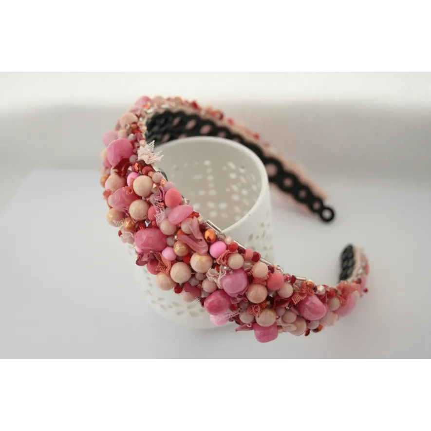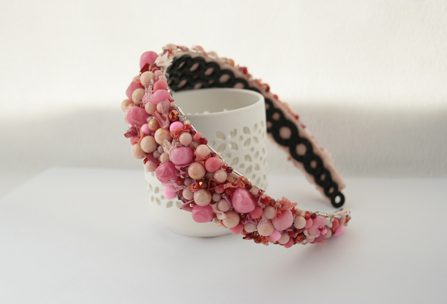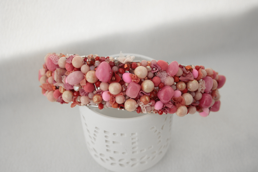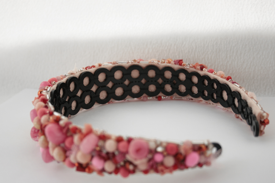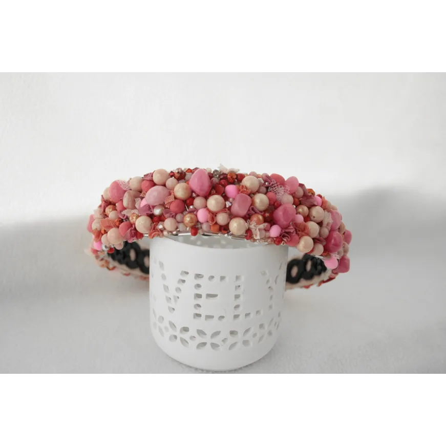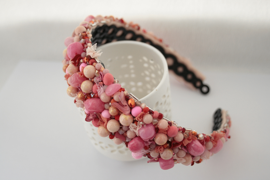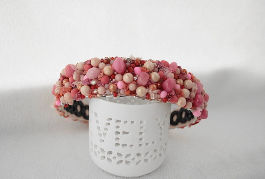 Cordeluta realizata manual din jad roz, margele de sticla, margele din spuma, vopsea acrilica, tulle, plasa, cusute pe fetru roz si aplicate pe o baza de cordeluta din plastc.