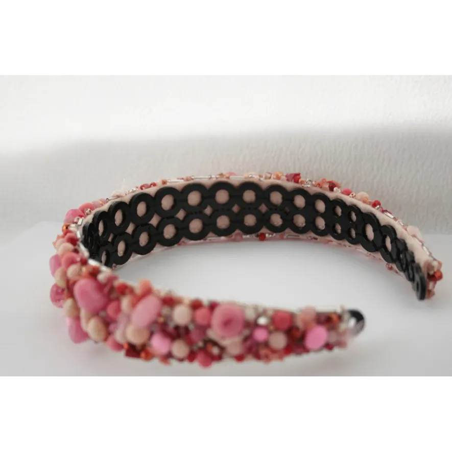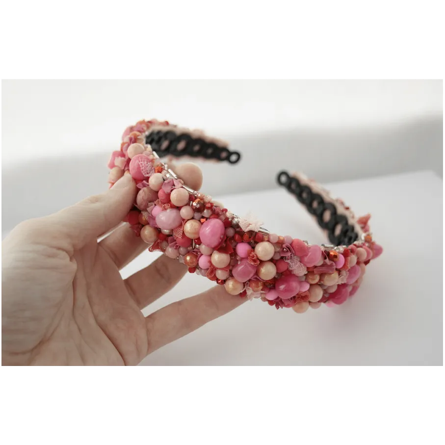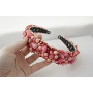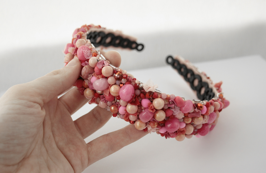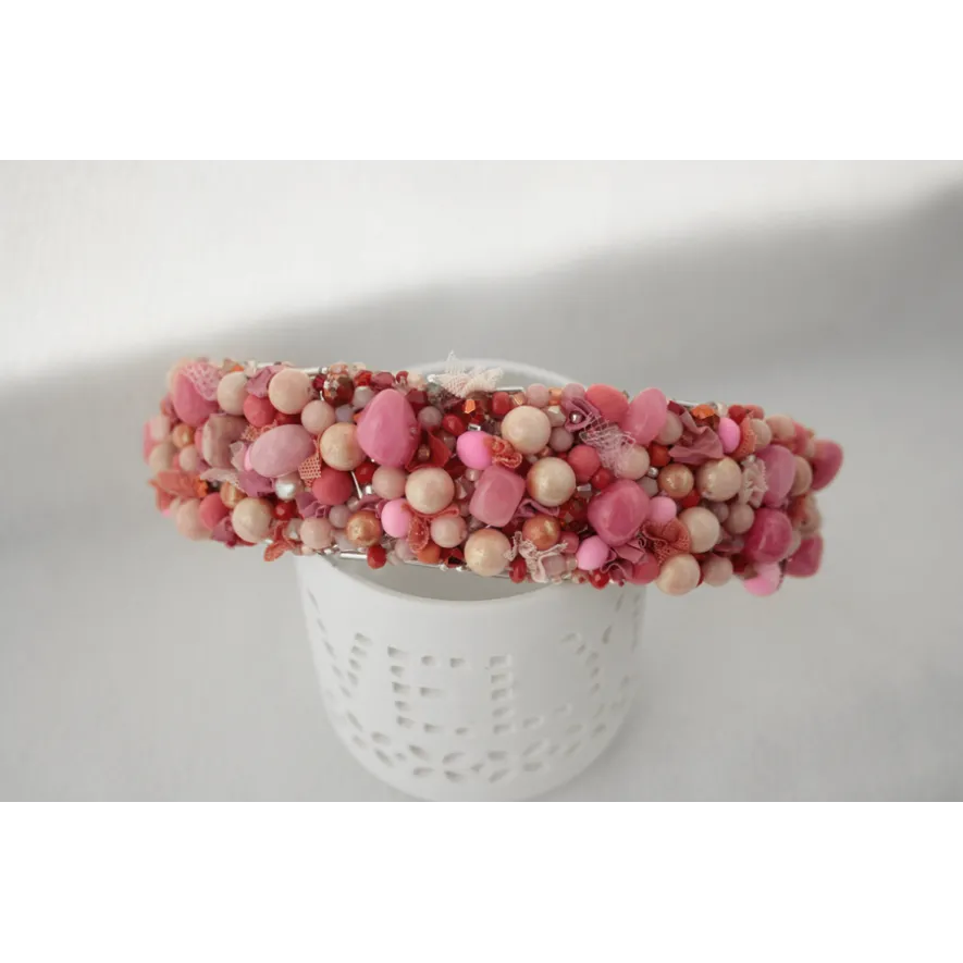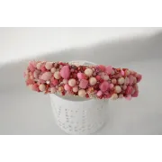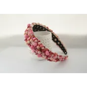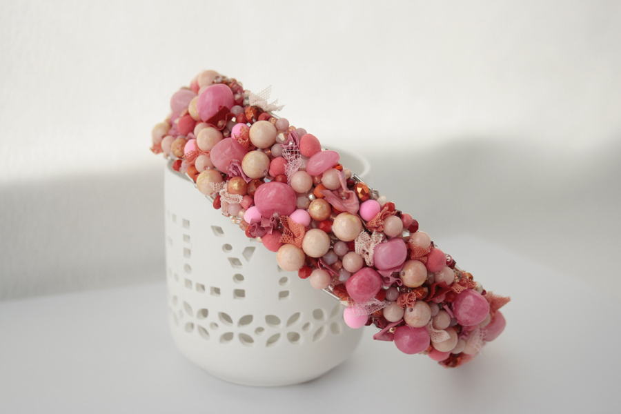 Cordeluta realizata manual din jad roz, margele de sticla, margele din spuma, vopsea acrilica, tulle, plasa, cusute pe fetru roz si aplicate pe o baza de cordeluta din plastc.