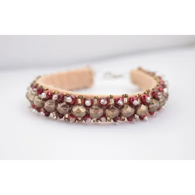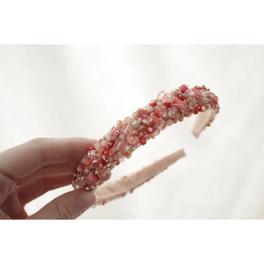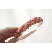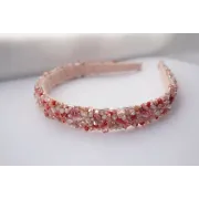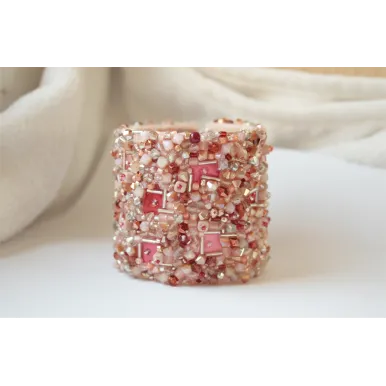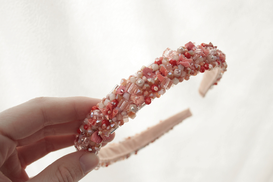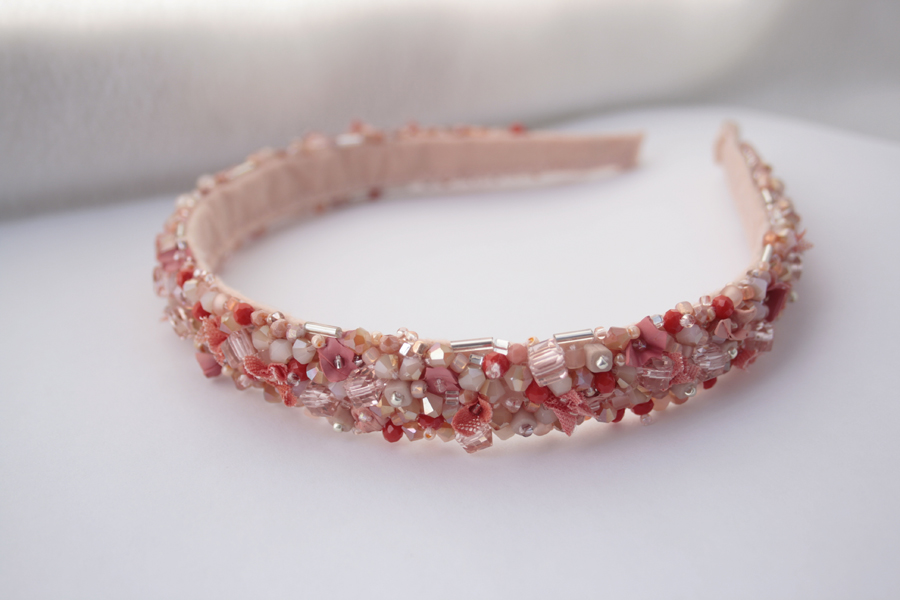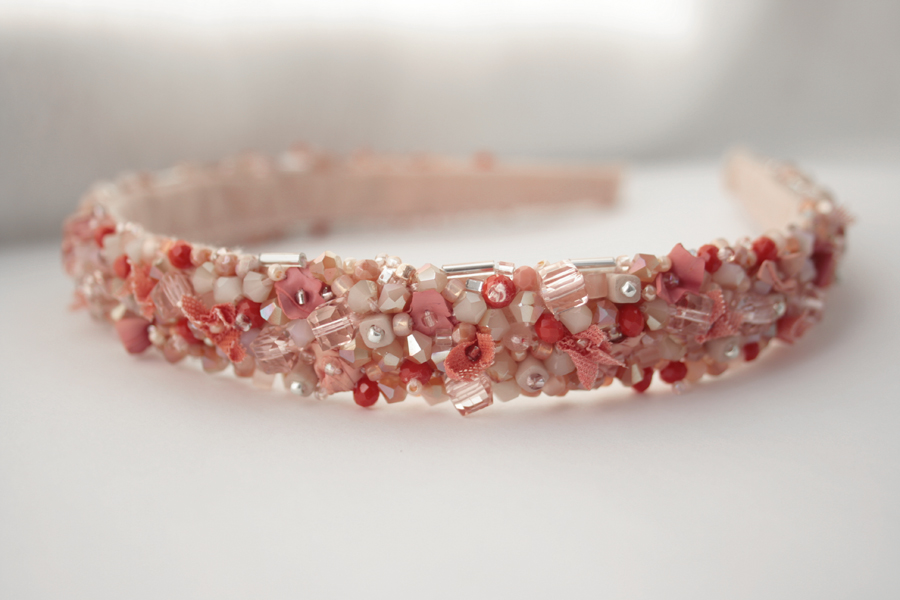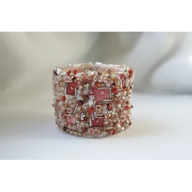 Cordeluta realizata din margele de sticla, plasa si vopsea acrilica cusute pe fetru roz. Baza cordelutei este imbracata in fetru.
