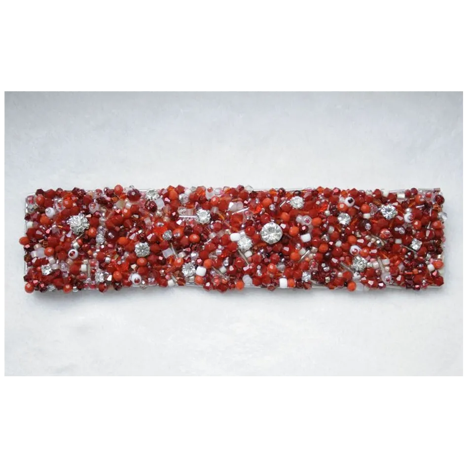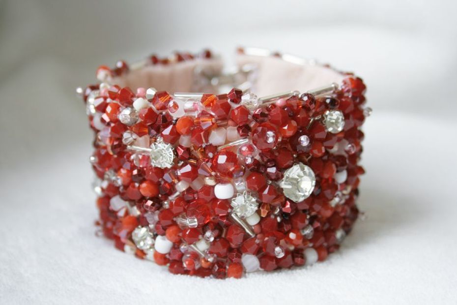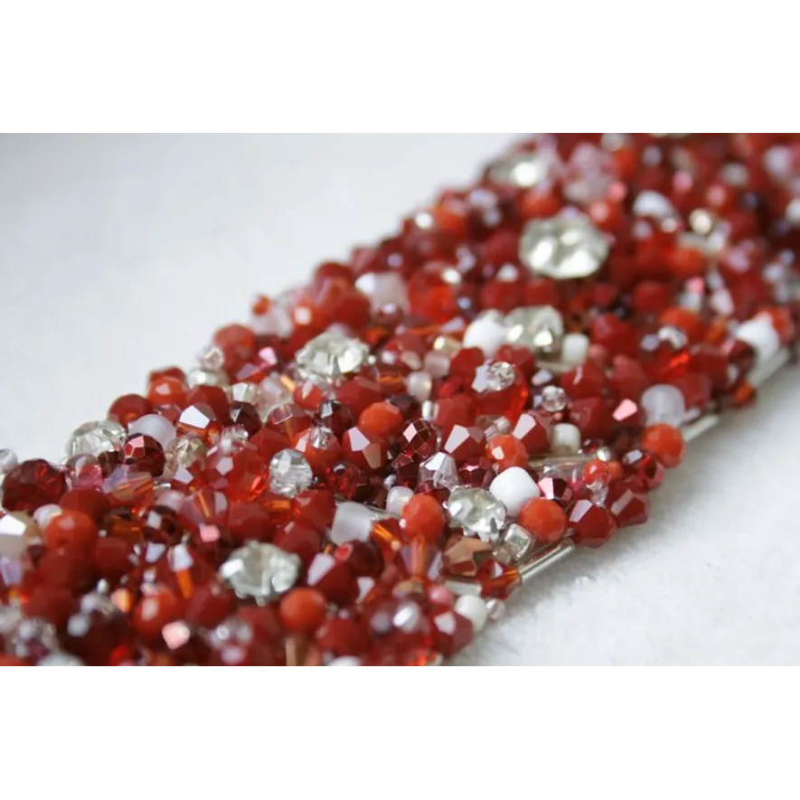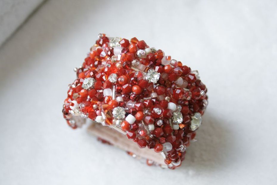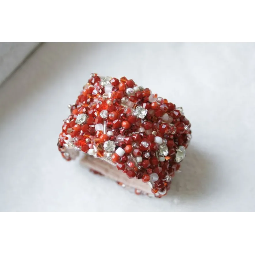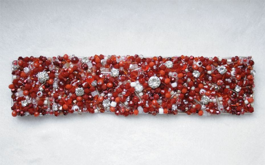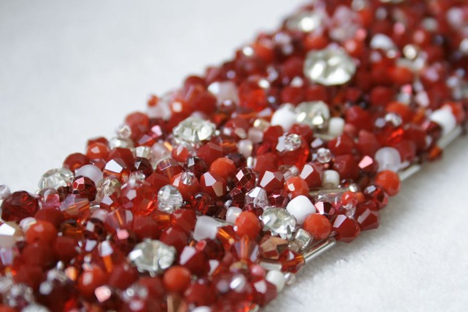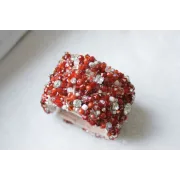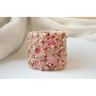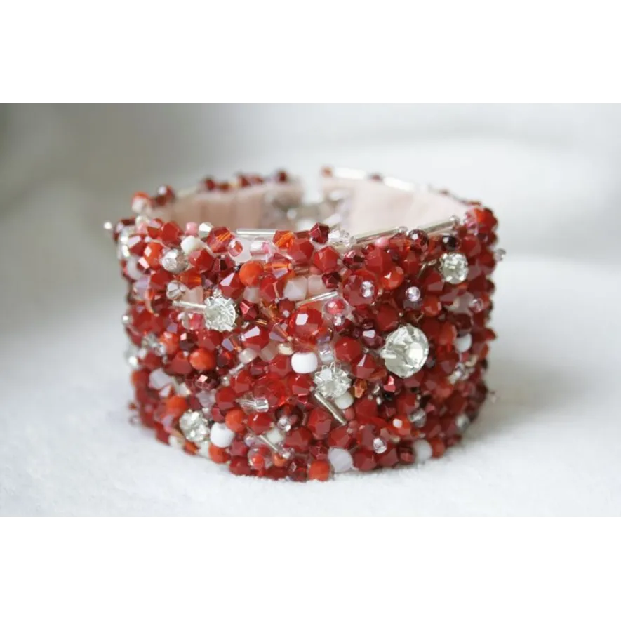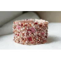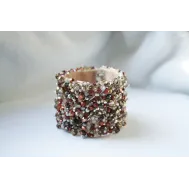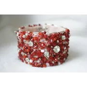 Bratara realizata din margele de sticla si cristale cusute pe fetru. Prinderea se face cu inchizatori "mos si baba".