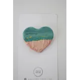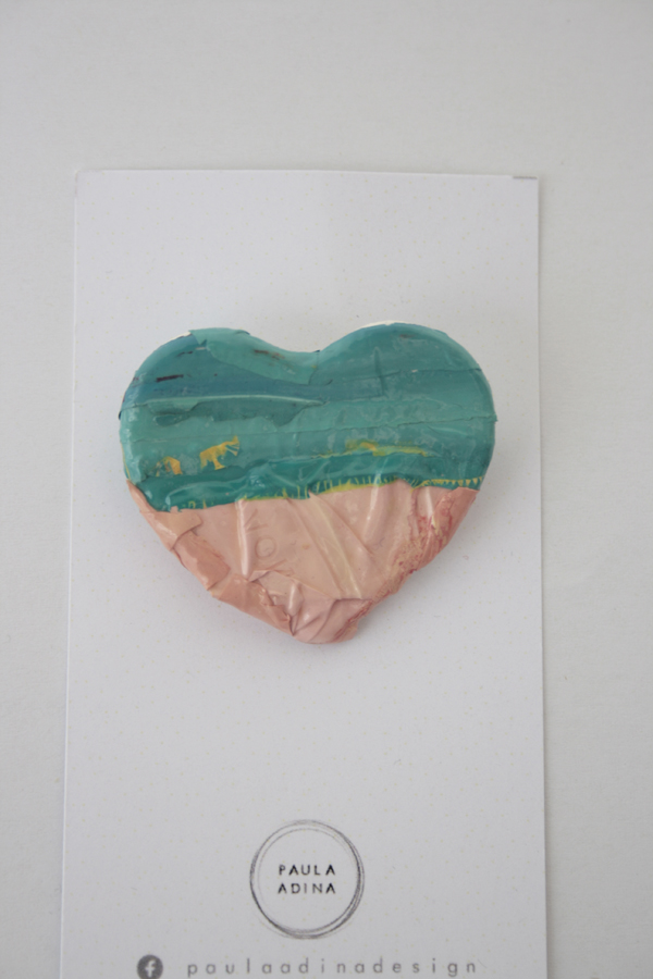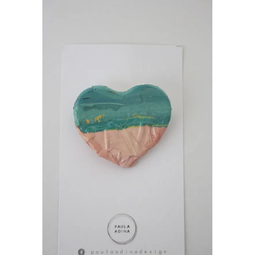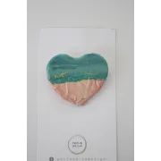 Brosa in forma de inima, realizata din lut peste care am aplicat vopsea acrilica si un strat de vernis. Prinderea se face cu ac de brosa din inox.