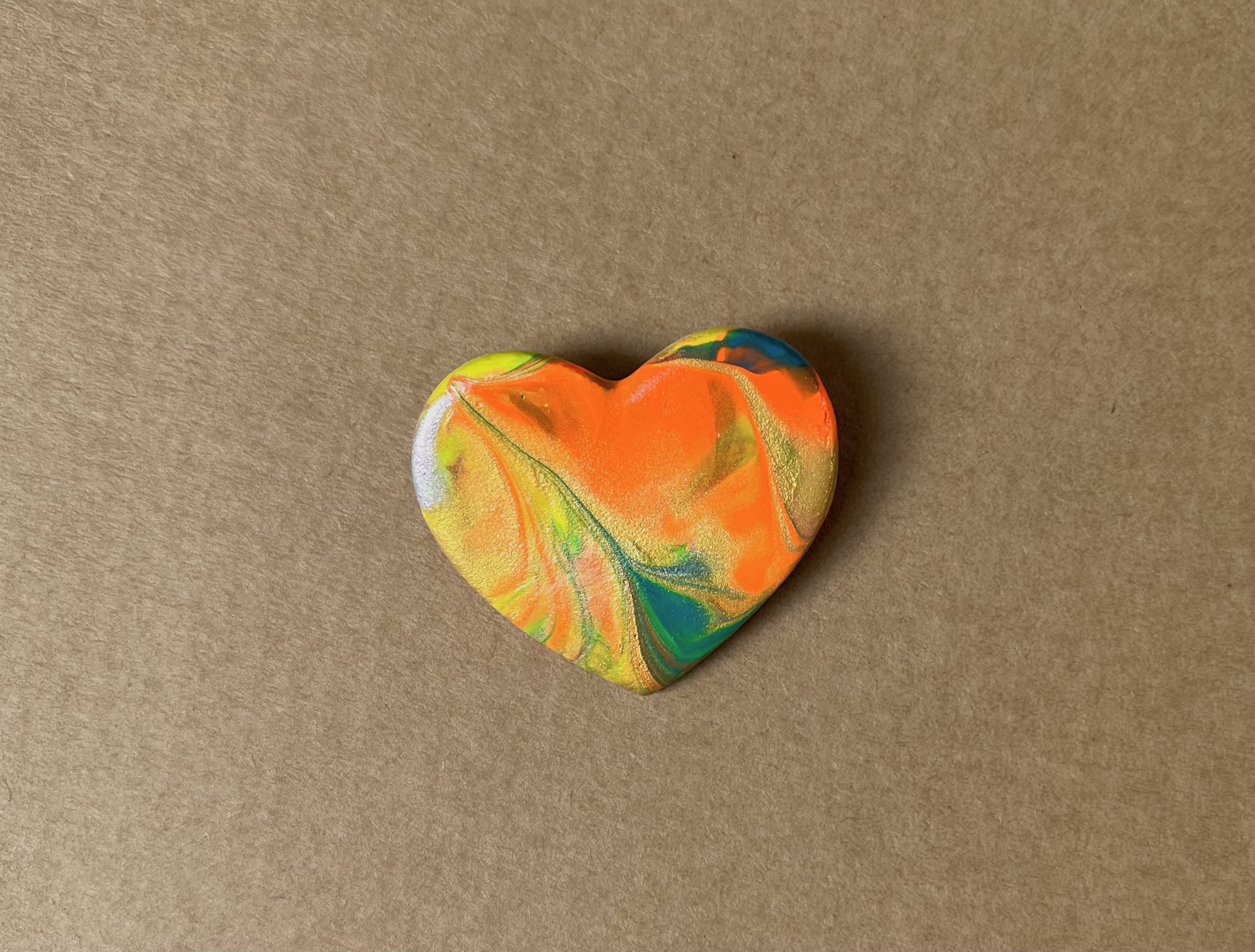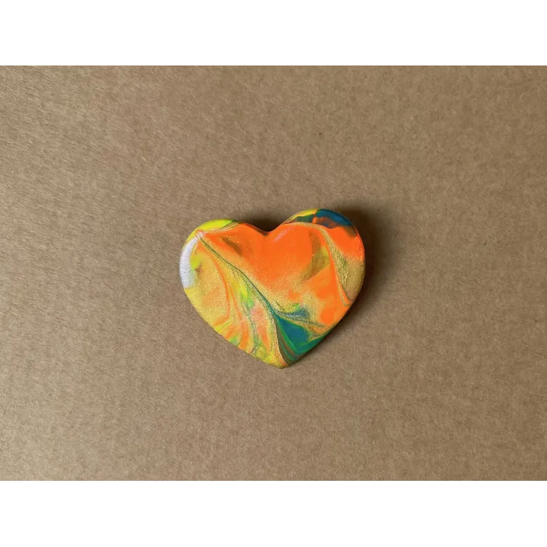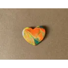 Brosa in forma de inima, realizata din lut si vopsea, si lacuita cu vernis. Prinderea se face cu ac de brosa din inox. Dimensiune: 3,7 x 3,4 cm.