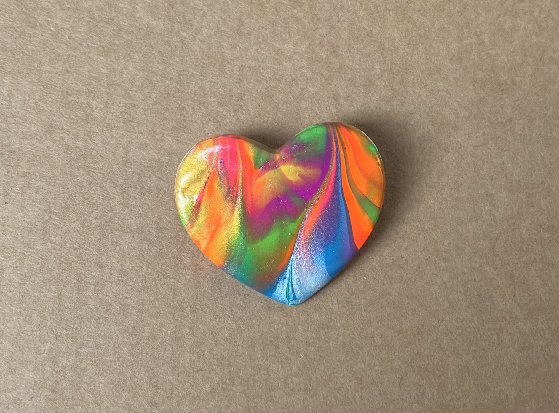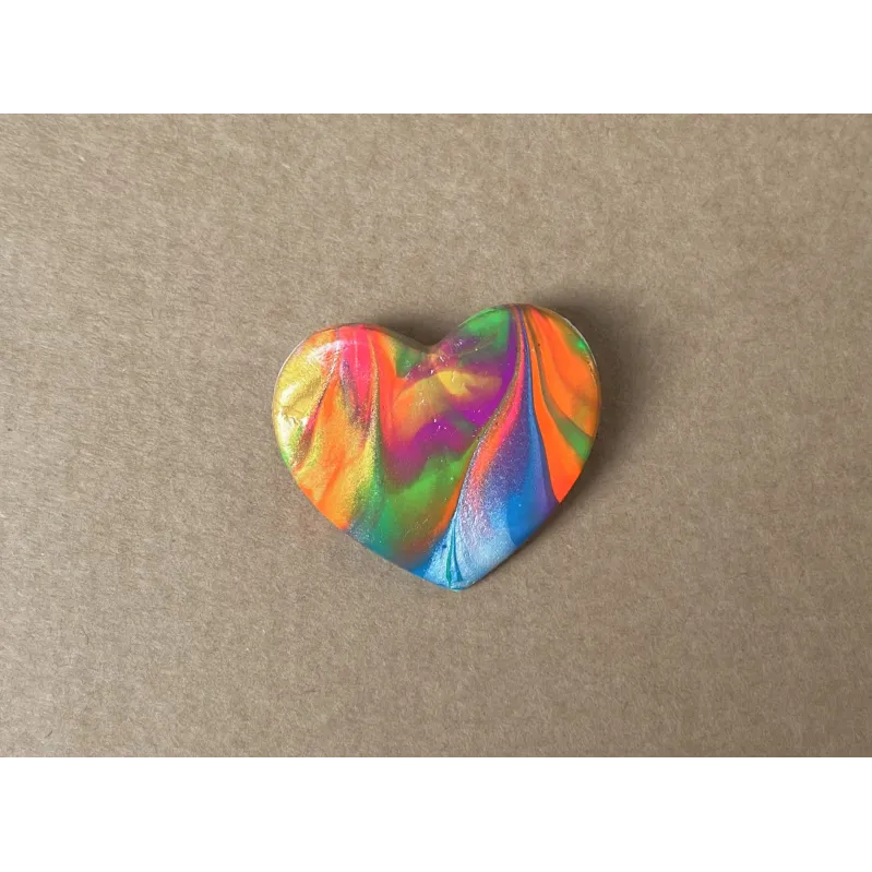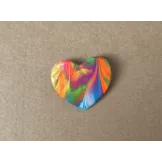 Brosa in forma de inima, realizata din lut si vopsea, si lacuita cu vernis. Prinderea se face cu ac de brosa din inox. Dimensiune: 3,7 x 3,4 cm.