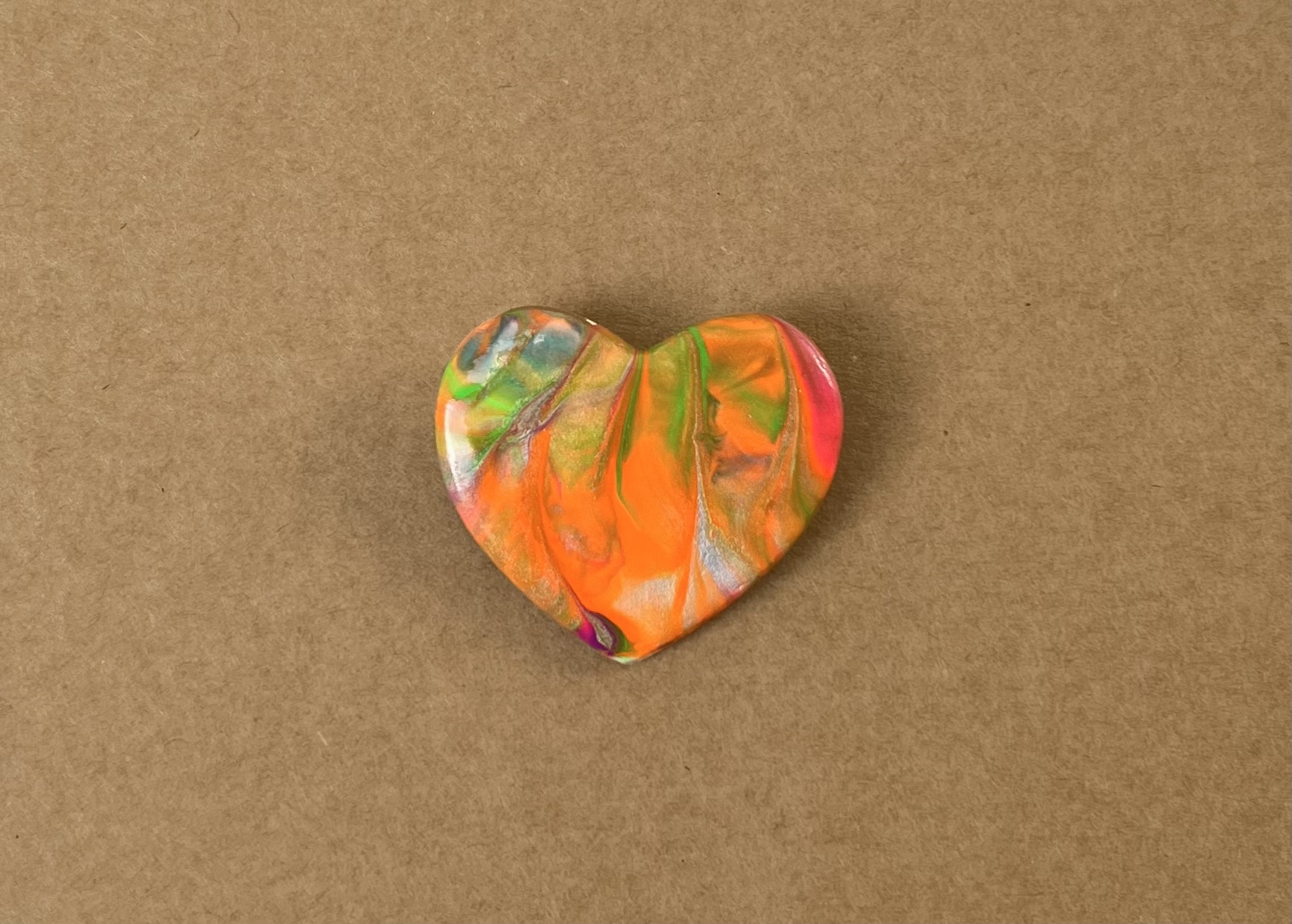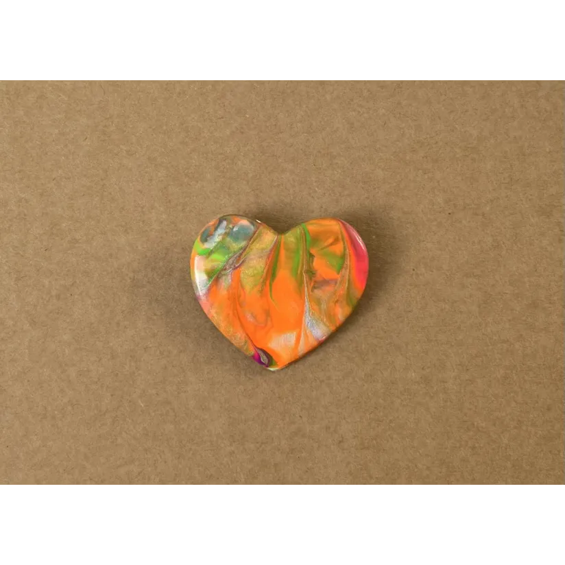 Brosa in forma de inima, realizata din lut si vopsea, si lacuita cu vernis. Prinderea se face cu ac de brosa din inox. Dimensiune: 3,7 x 3,4 cm.