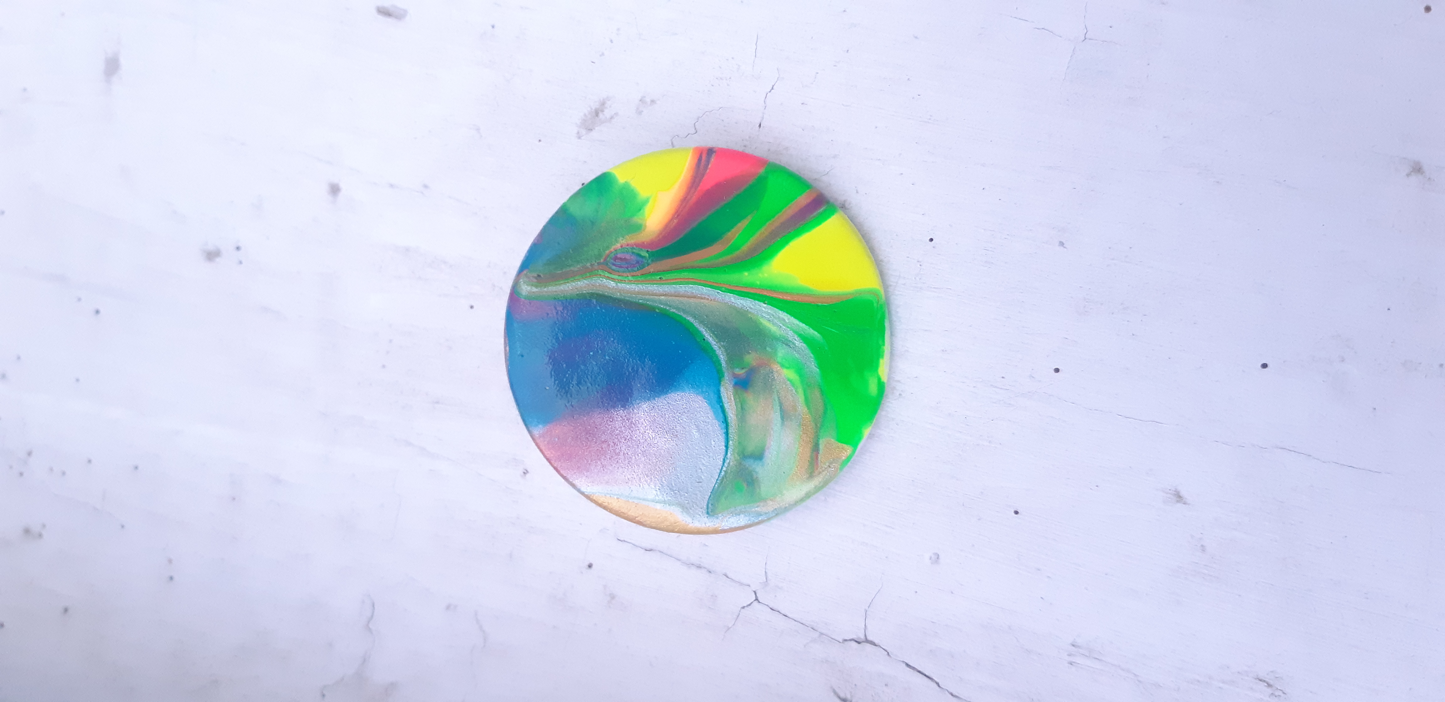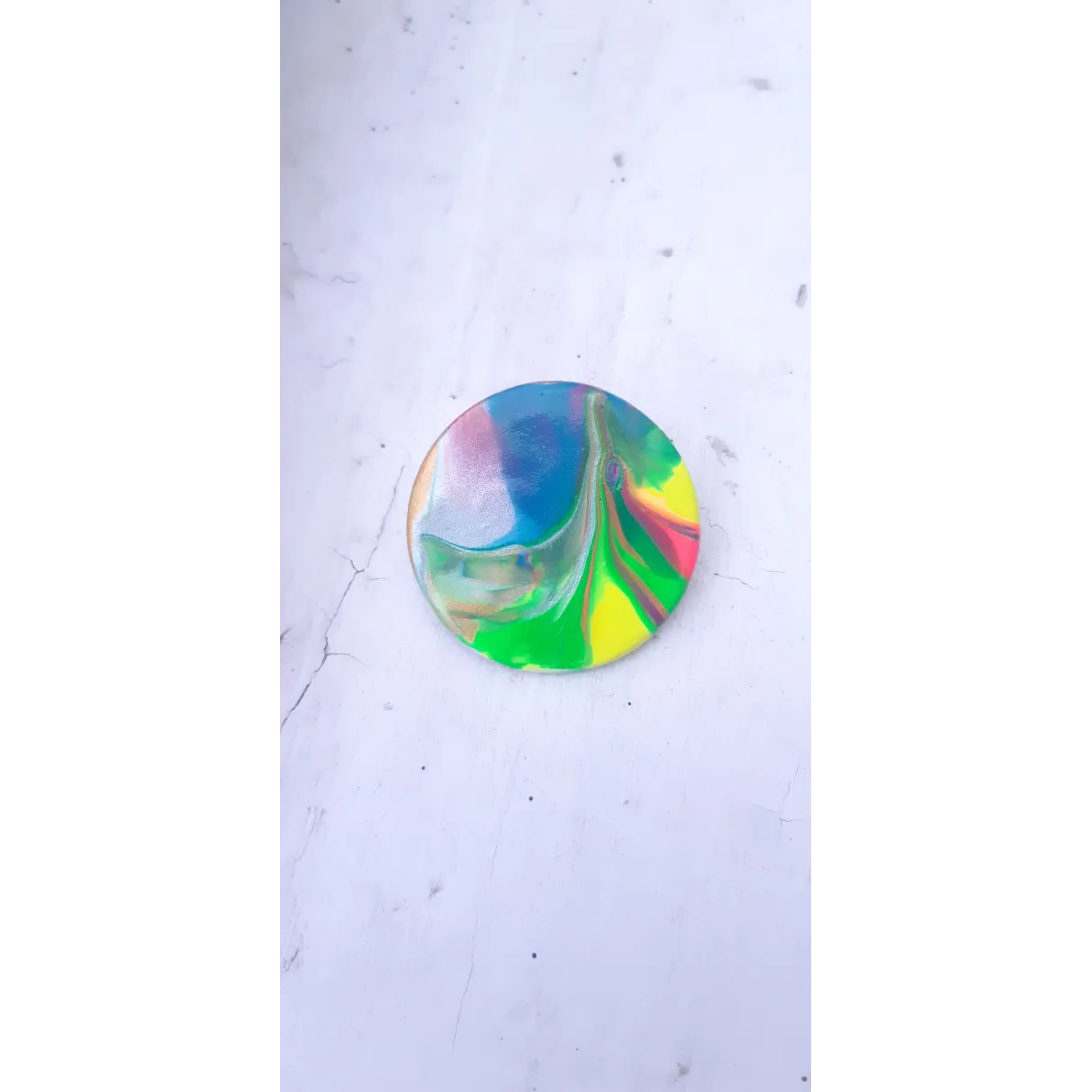 Brosa rotunda realizata din lut si vopsea. Brosa este lacuita cu vernis. Prinderea se face cu ac de brosa din inox. Diametru: 3,3 cm Culorile pot varia usor, in functie de setarile fiecarui monitor.