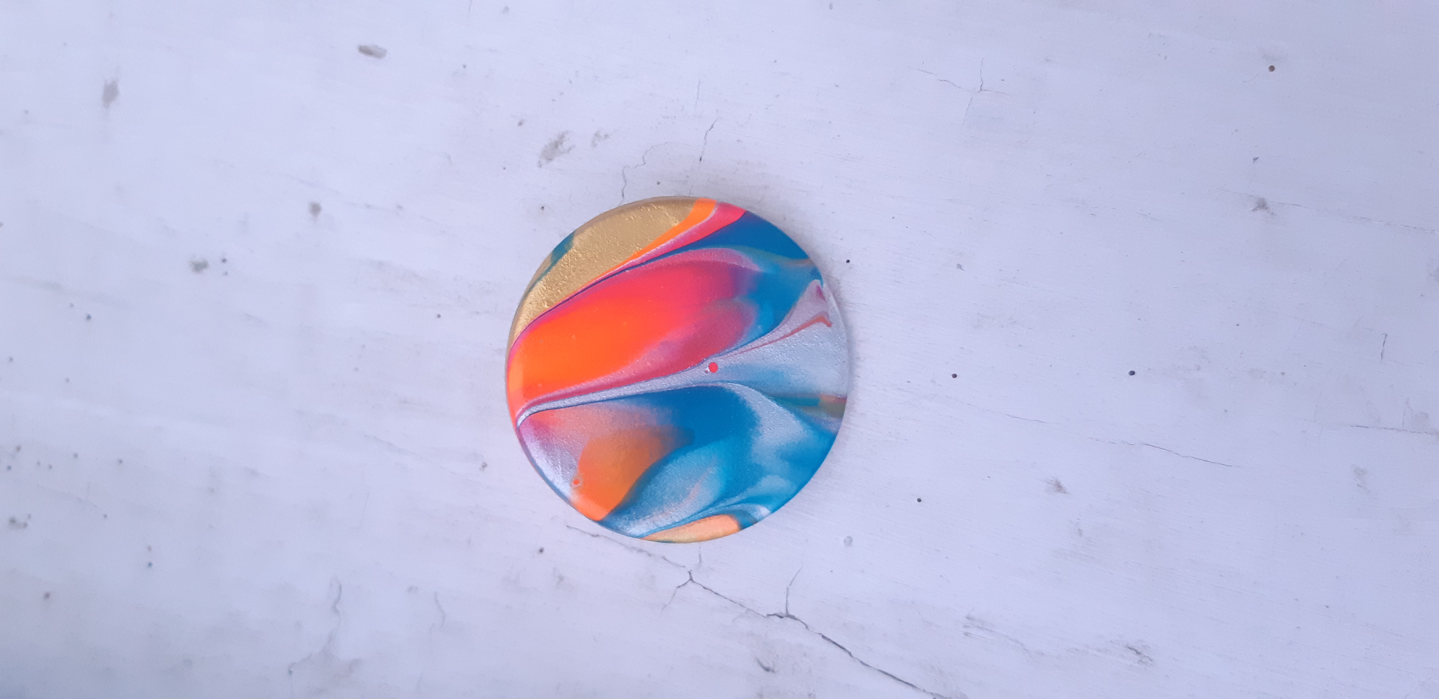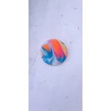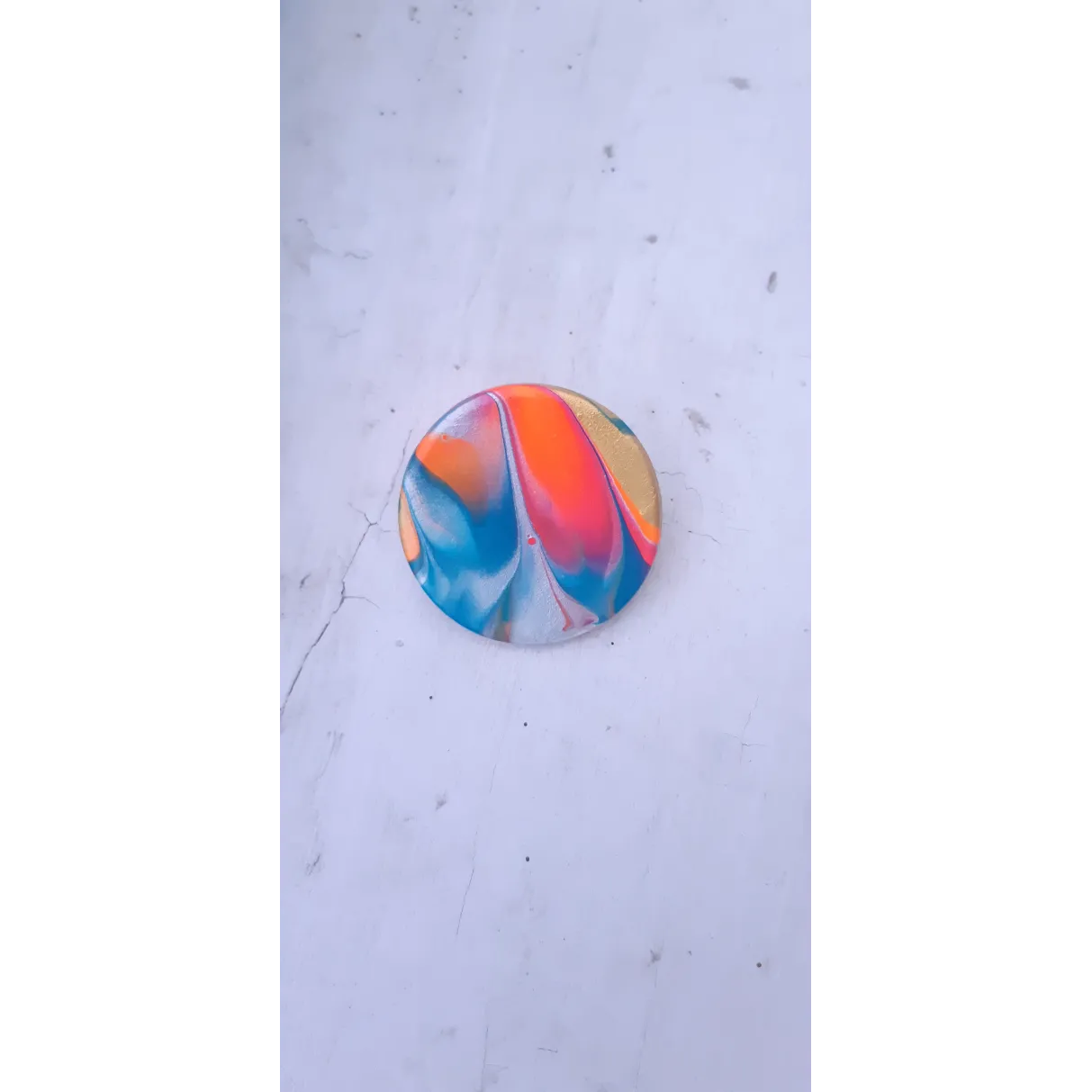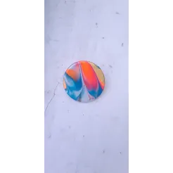 Brosa rotunda realizata din lut si vopsea. Brosa este lacuita cu vernis. Prinderea se face cu ac de brosa din inox. Diametru: 3,3 cm Culorile pot varia usor, in functie de setarile fiecarui monitor.