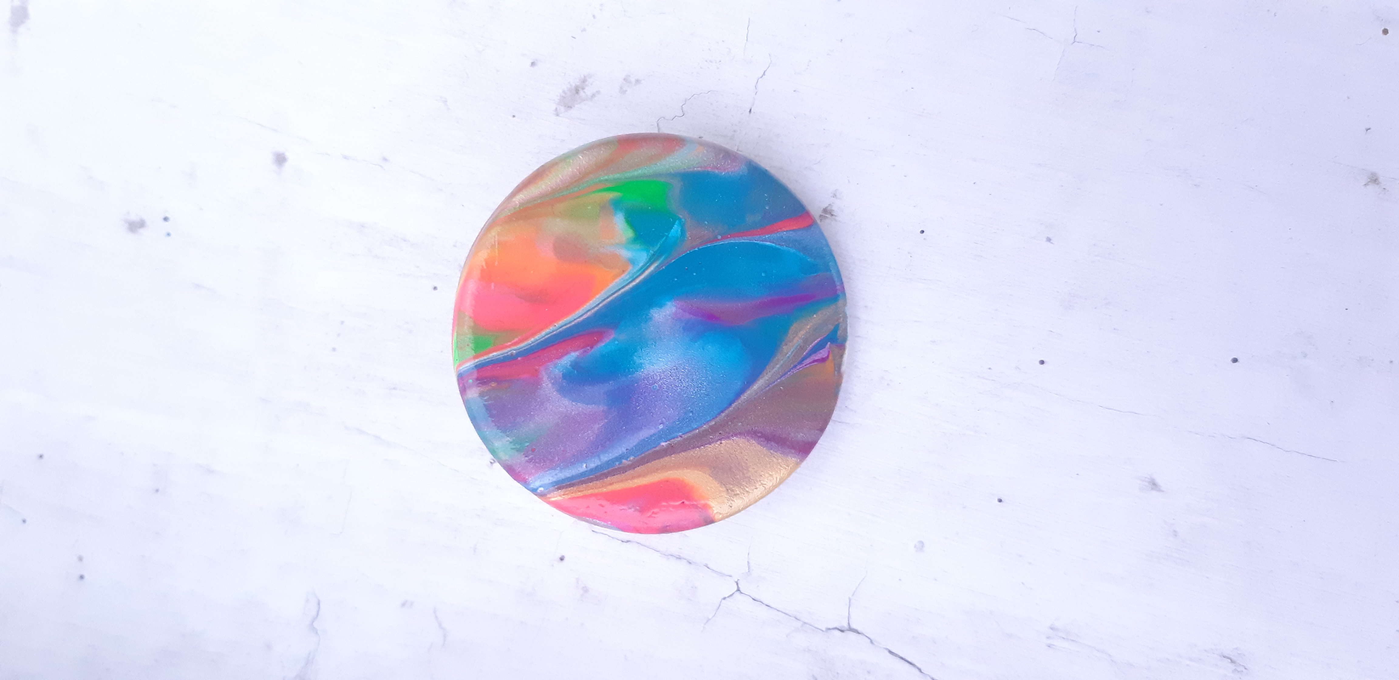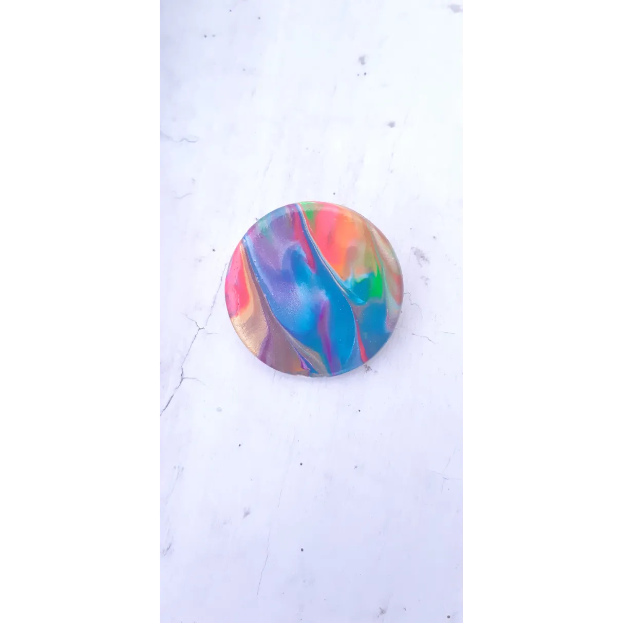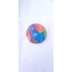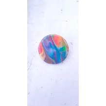 Brosa rotunda realizata din lut si vopsea. Brosa este lacuita cu vernis. Prinderea se face cu ac de brosa din inox. Diametru: 3,3 cm Culorile pot varia usor, in functie de setarile fiecarui monitor.