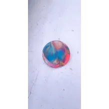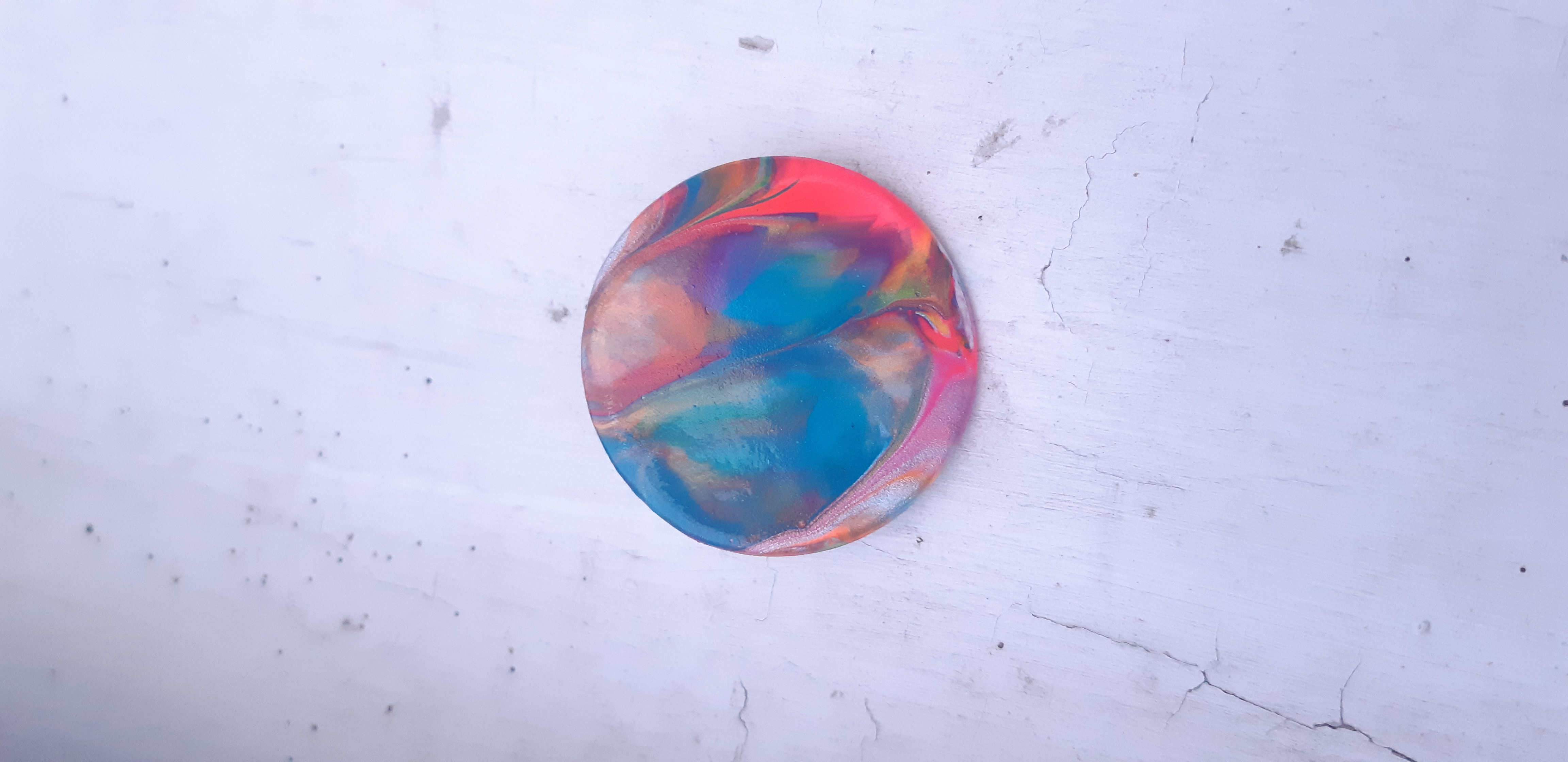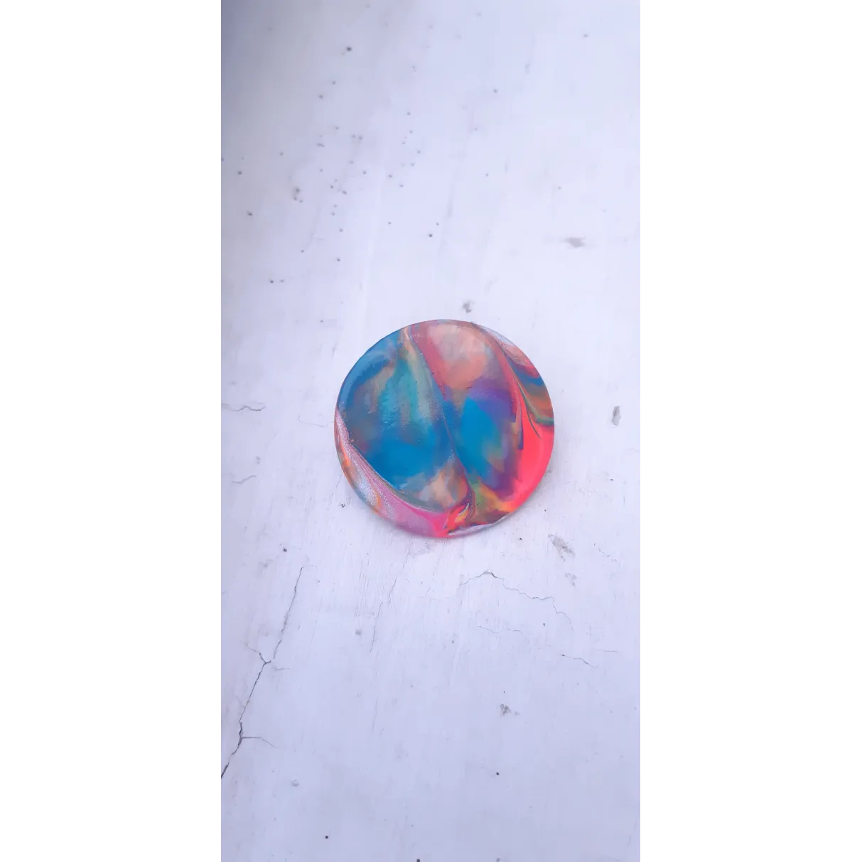 Brosa rotunda realizata din lut si vopsea. Brosa este lacuita cu vernis. Prinderea se face cu ac de brosa din inox.