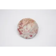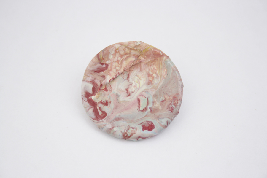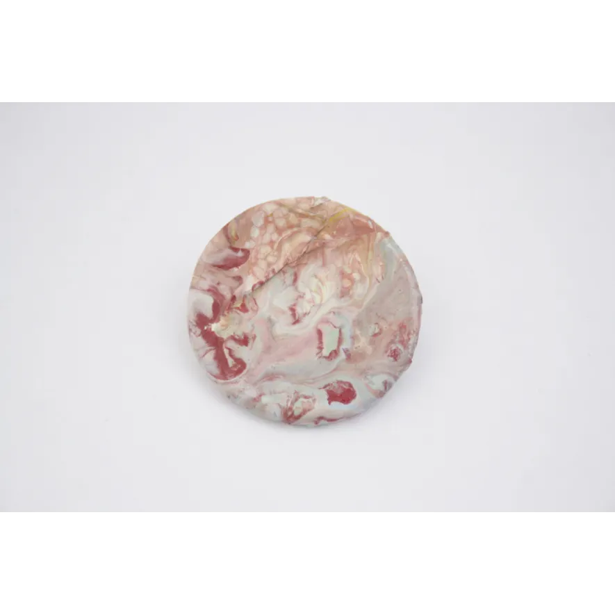 Brosa rotunda realizata din lut, peste care am aplicat o pelicula din vopsea acrilica. Brosa este lacuita cu vernis. Prinderea se face cu ac de brosa din inox.