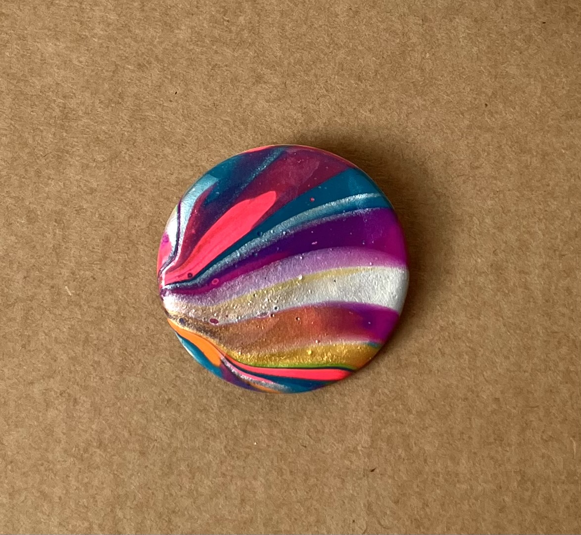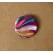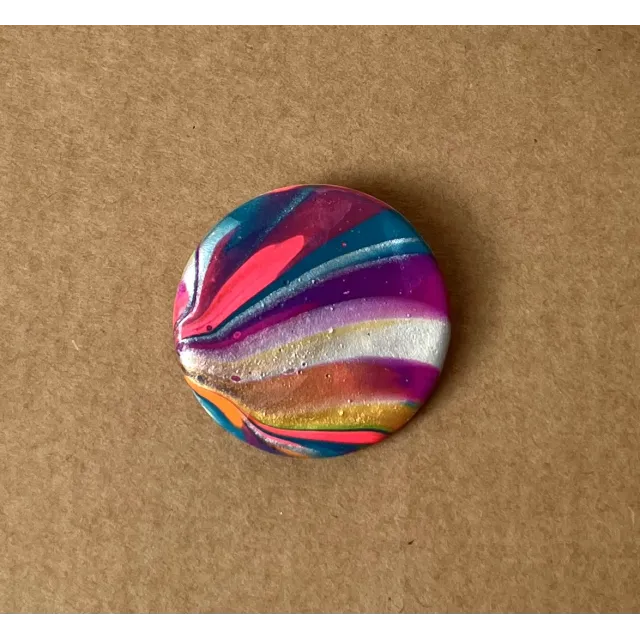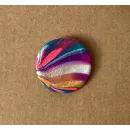 Brosa rotunda realizata din lut si vopsea. Brosa este lacuita cu vernis. Prinderea se face cu ac de brosa din inox. Diametru: 3,3 cm.