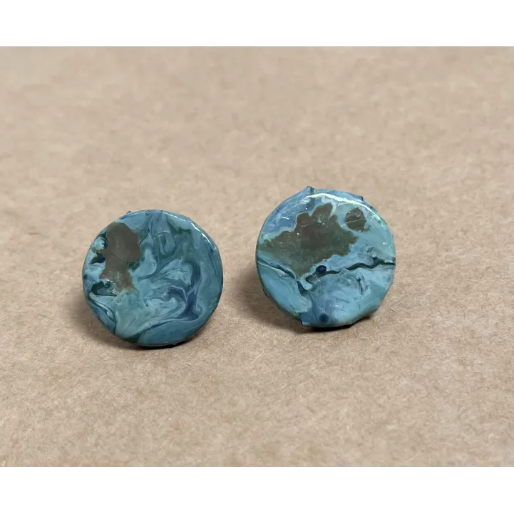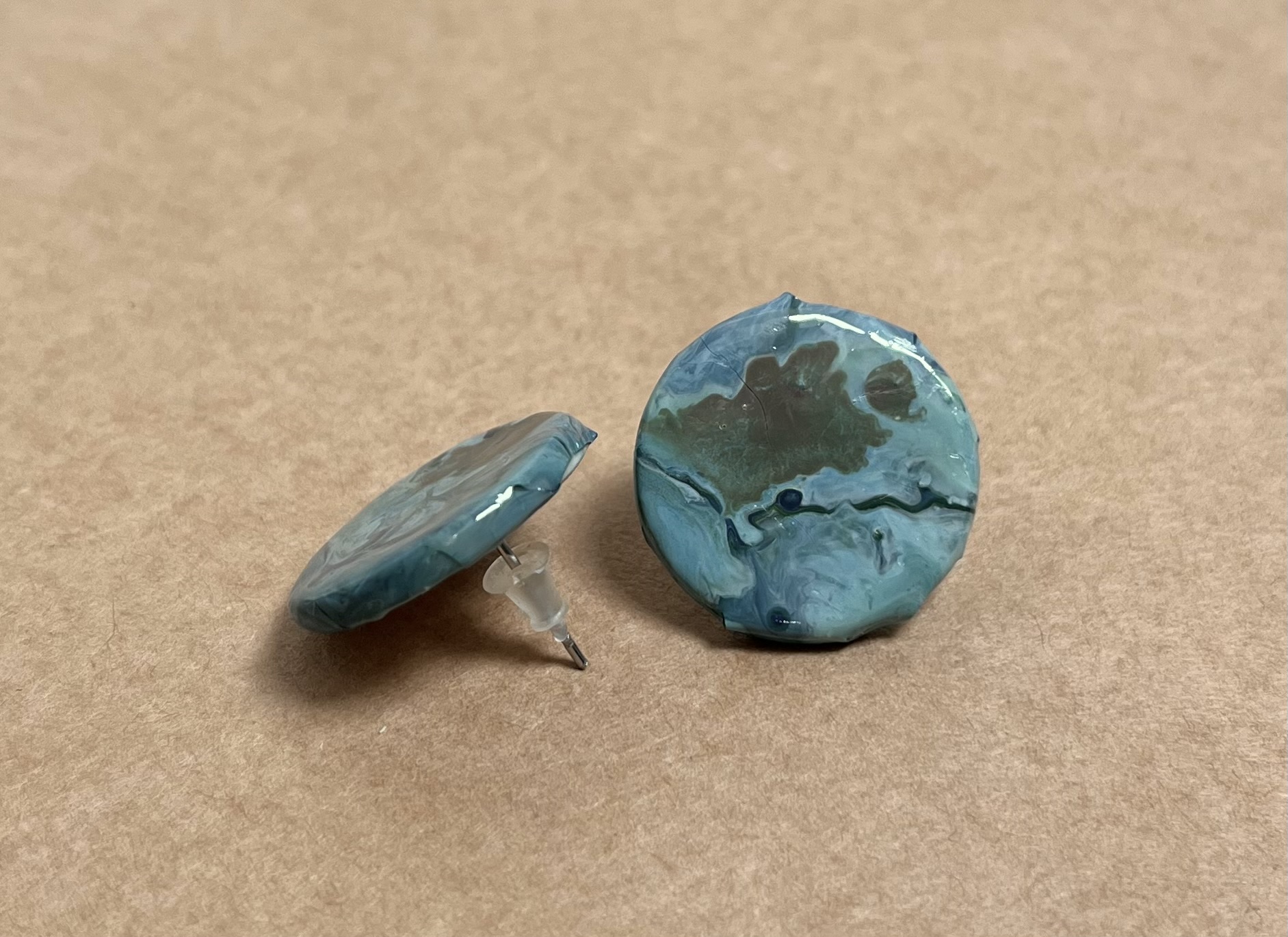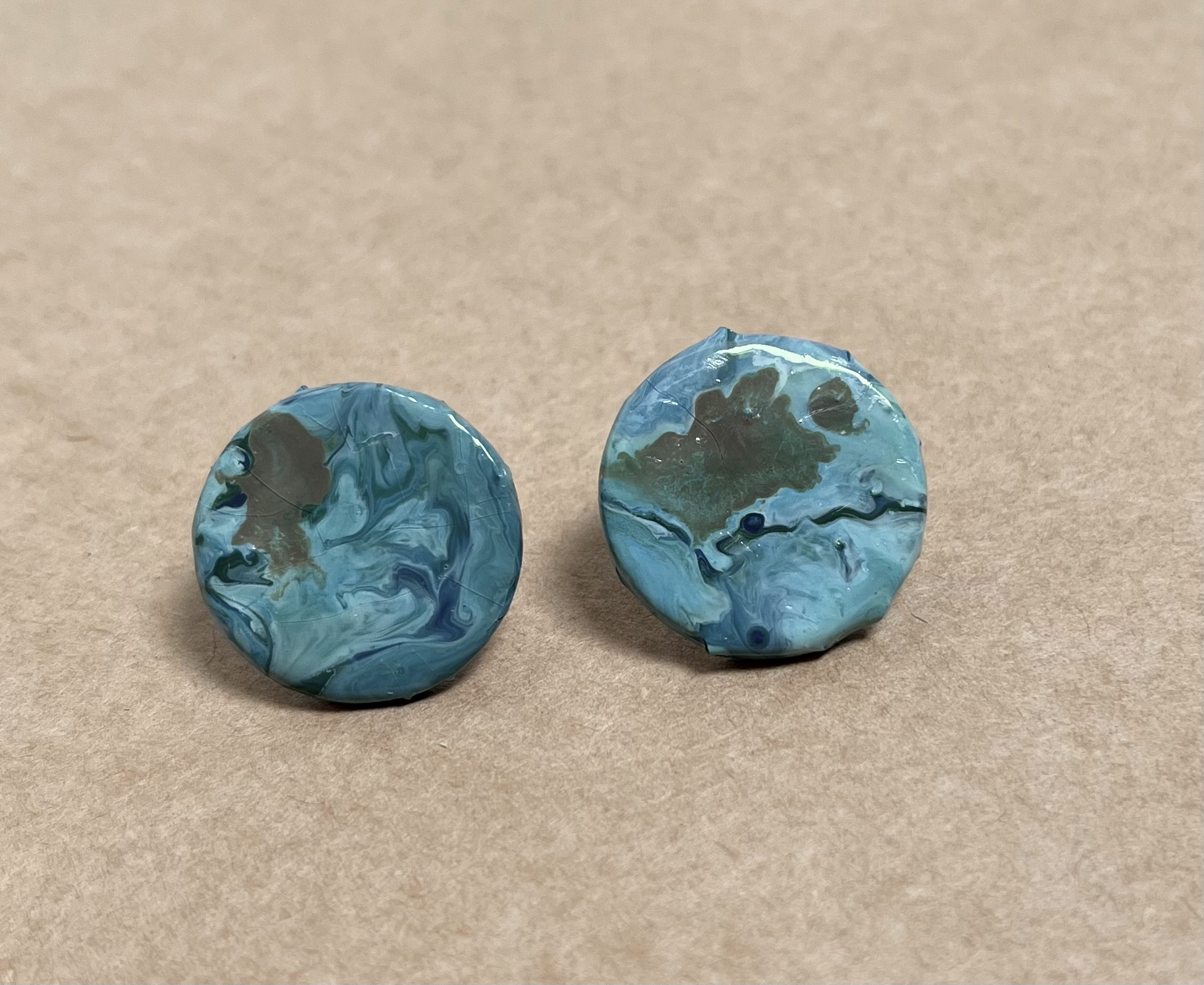 Cercei realizati din vopsea acrilica aplicata pe o baza din lut. Prinderea se face cu tija din inox si dop de silicon. Diametru 2 cm.