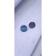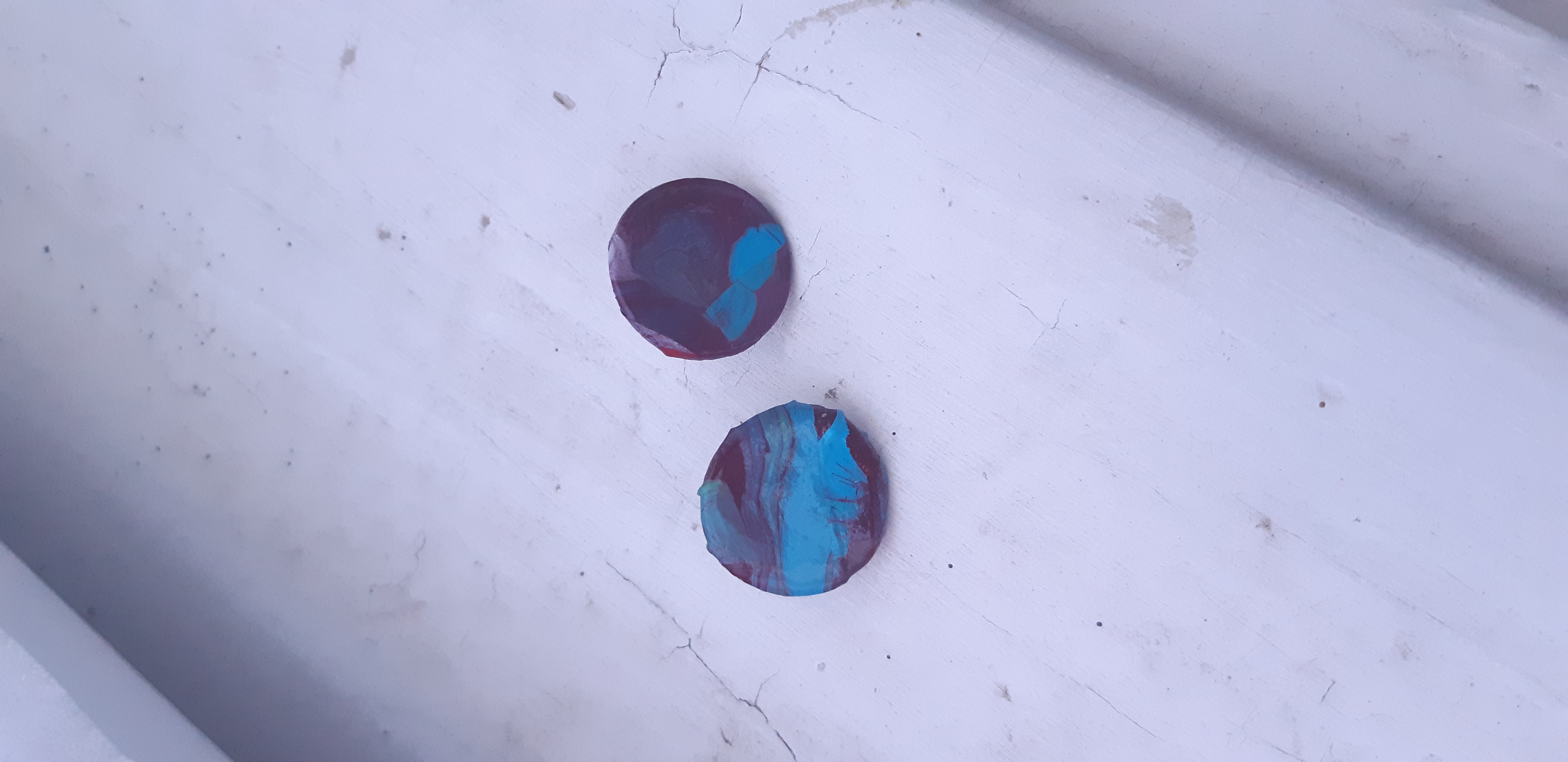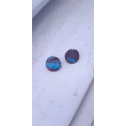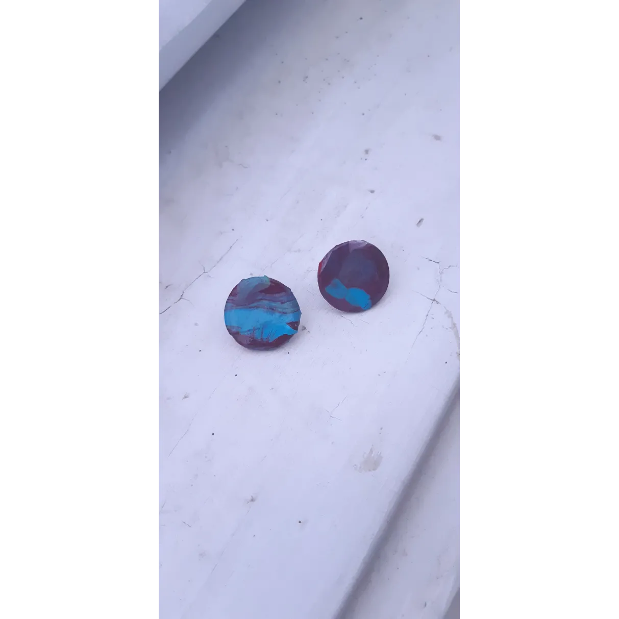 Cercei rotunzi realizati din lut, peste care am aplicat o pelicula de vopsea acrilica. Sunt finisati cu vernis si se prind cu tija din inox si dop de silicon.